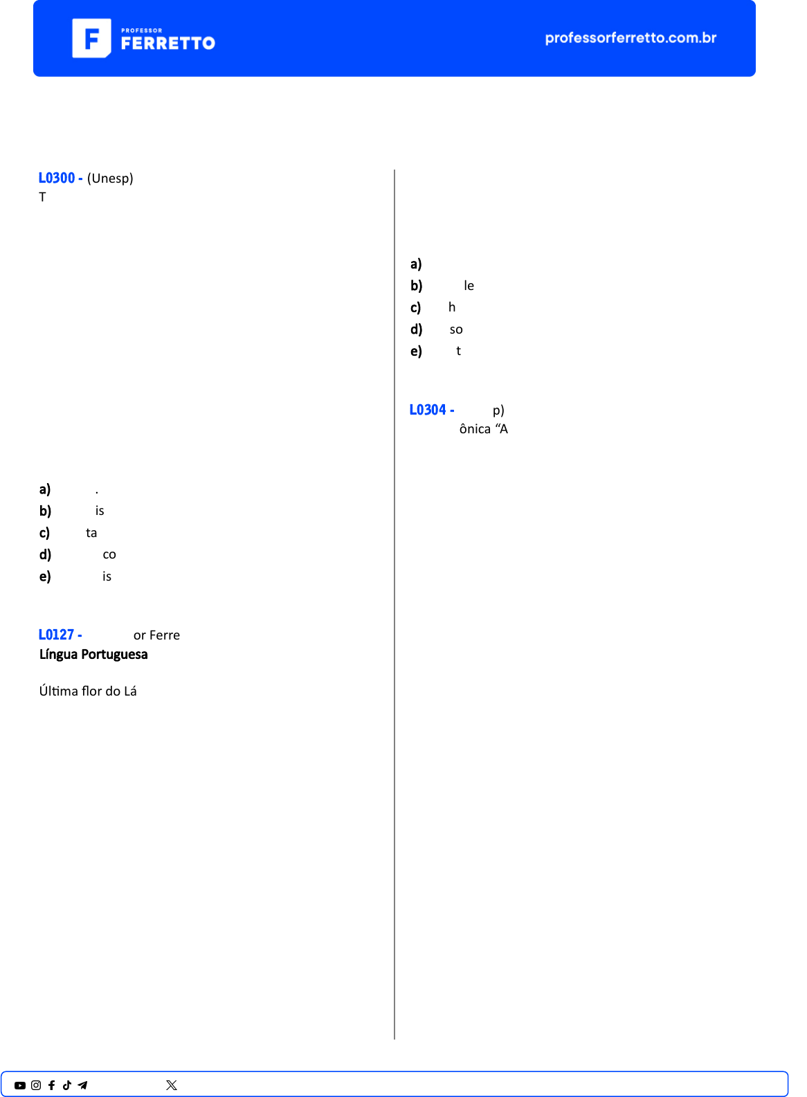 <p>Realismo</p><p>L0300 - (Unesp)</p><p>Tal movimento deriva quase todos os seus critérios de</p><p>probabilidade do empirismo das ciências naturais. Baseia</p><p>seu conceito de verdade psicológica no princípio de</p><p>causalidade, o desenvolvimento apropriado da trama na</p><p>eliminação do acaso e dos milagres, sua descrição do</p><p>ambiente na ideia de que todo e qualquer fenômeno</p><p>natural tem lugar numa interminável cadeia de condições</p><p>e mo�vos, sua u�lização de detalhes caracterís�cos no</p><p>método de observação cien�fica – que não despreza</p><p>circunstância alguma, por mais insignificante e trivial que</p><p>seja.</p><p>(Arnold Hauser. História social da arte e da literatura,</p><p>1994. Adaptado.)</p><p>O texto refere-se ao movimento</p><p>a) árcade.</p><p>b) simbolista.</p><p>c) realista.</p><p>d) român�co.</p><p>e) modernista.</p><p>L0127 - (Professor Ferre�o)</p><p>Língua Portuguesa</p><p>Úl�ma flor do Lácio, inculta e bela,</p><p>És, a um tempo, esplendor e sepultura:</p><p>Ouro na�vo, que na ganga impura</p><p>A bruta mina entre os cascalhos vela…</p><p>Amo-te assim, desconhecida e obscura,</p><p>Tuba de alto clangor, lira singela,</p><p>Que tens o trom e o silvo da procela</p><p>E o arrolo da saudade e da ternura!</p><p>Amo o teu viço agreste e o teu aroma</p><p>De virgens selvas e de oceano largo!</p><p>Amo-te, ó rude e doloroso idioma,</p><p>Em que da voz materna ouvi: "meu filho!"</p><p>E em que Camões chorou, no exílio amargo,</p><p>O gênio sem ventura e o amor sem brilho!</p><p>(Olavo Bilac)</p><p>O poeta Olavo Bilac foi um dos maiores representantes</p><p>da poesia parnasiana. O texto acima representa uma</p><p>forma fixa muito u�lizada pelos escritores parnasianos,</p><p>que é:</p><p>a) uma ode</p><p>b) uma elegia</p><p>c) um haicai</p><p>d) um soneto</p><p>e) uma trova</p><p>L0304 - (Unesp)</p><p>Leia a crônica “Almas penadas”, de Olavo Bilac, publicada</p><p>originalmente em 1902.</p><p>Outro fantasma?... é verdade: outro fantasma. Já</p><p>tardava. O Rio de Janeiro não pode passar muito tempo</p><p>sem o seu lobisomem. Parece que tudo aqui concorre</p><p>para nos impelir ao amor do sobrenatural [...]. Agora, já</p><p>se não adormecem as crianças com histórias de fadas e</p><p>de almas do outro mundo. Mas, ainda há menos de</p><p>cinquenta anos, este era um povo de beatos [...]. [...] Os</p><p>tempos melhoraram, mas guardam ainda um pouco</p><p>dessa primi�va credulidade. Inventar um fantasma é</p><p>ainda um magnífico recurso para quem quer levar a bom</p><p>termo qualquer grossa pa�faria. As almas simples vão</p><p>propagando o terror, e, sob a capa e a salvaguarda desse</p><p>temor, os pa�fes vão rejubilando.</p><p>O novo espectro que nos aparece é o de Catumbi.</p><p>Começou a surgir vagamente, sem espalhafato, pelo</p><p>pacato bairro – como um fantasma de grande e louvável</p><p>modés�a. E tão esba�do1 passava o seu vulto na treva,</p><p>tão su�lmente deslizava ao longo das casas adormecidas</p><p>– que as primeiras pessoas que o viram não puderam em</p><p>consciência dizer se era duende macho ou duende</p><p>fêmea. [...] O fantasma não falava – naturalmente por</p><p>saber de longa data que pela boca é que morrem os</p><p>peixes e os fantasmas... Também, ninguém lhe falava –</p><p>não por experiência, mas por medo. Porque, enfim, pode</p><p>um homem ter nascido num século de luzes e de</p><p>descrenças, e ter mamado o leite do liberalismo nos</p><p>estafados seios da Revolução Francesa, e não acreditar</p><p>nem em Deus nem no Diabo – e, apesar disso, sen�r a</p><p>1@professorferretto @prof_ferretto</p><p>voz presa na garganta, quando encontra na rua, a</p><p>desoras2, uma avantesma3...</p><p>Assim, um profundo mistério cercava a existência do</p><p>lobisomem de Catumbi – quando começaram de</p><p>aparecer ves�gios assinalados de sua passagem, não já</p><p>pelas ruas, mas pelo interior das casas. Não vades agora</p><p>crer que se tenham sumido, por exemplo, as hós�as</p><p>consagradas da igreja de Catumbi, ou que os empregados</p><p>do cemitério de S. Francisco de Paula tenham achado</p><p>alguma sepultura vazia, ou que algum circunspecto pai</p><p>de família, certa manhã, ao despertar, tenha dado pela</p><p>falta... da própria alma. Nada disso. Os fenômenos eram</p><p>outros. Desta casa sumiram-se as arandelas, daquela</p><p>outra as galinhas, daquela outra as joias... E a polícia,</p><p>finalmente, adquiriu a convicção de que o lobisomem,</p><p>para perpétua e suprema vergonha de toda a sua classe,</p><p>andava acumulando novos pecados sobre os pecados</p><p>an�gos, e dando-se à prá�ca de excessos menos</p><p>merecedores de exorcismos que de cadeia.</p><p>Dizem as folhas4 que a polícia, competentemente munida</p><p>de ben�nhos5 e de revólveres, de amuletos e de sabres,</p><p>assaltou anteontem o reduto do fantasma. Um jornal,</p><p>dando conta da diligência, disse que o delegado achou</p><p>dentro da casa sinistra – um velho pardieiro6 que fica no</p><p>topo de uma ladeira íngreme – alguns objetos singulares</p><p>que pareciam instrumentos “pertencentes a gatunos”. E</p><p>acrescentou: “alguns morcegos esvoaçavam espavoridos,</p><p>tentando apagar as velas acesas que os si�antes7</p><p>empunhavam”.</p><p>Esta nota de morcegos deve ser um chique</p><p>român�co do no�ciarista. No fundo da alma de todo o</p><p>repórter há sempre um poeta... Vamos lá! nestes tempos,</p><p>que correm, já nem há morcegos. Esses feios quirópteros,</p><p>esses medonhos ratos alados, companheiros clássicos do</p><p>terror noturno, já não aparecem pelo bairro civilizado de</p><p>Catumbi. Os animais, que esvoaçavam espavoridos, eram</p><p>sem dúvida os frangões roubados aos quintais das</p><p>casas... Ai dos fantasmas! e mal dos lobisomens! o seu</p><p>tempo passou.</p><p>(Olavo Bilac. Me