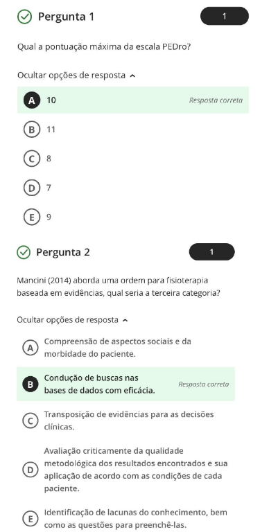 Pergunta 1 1 Qual a pontuação máxima da escala PEDro? Ocultar opções de resposta A 10 Resposta correta B 11 C 8 D 7 E 9 Pergunta 2 1 Mancini (2014) aborda uma ordem para fisioterapia baseada em evidências, qual seria a terceira categoria? Ocultar opções de resposta Compreensão de aspectos sociais e da A morbidade do paciente. Condução de buscas nas B correta bases de dados com Transposição de evidências para as decisões C Avaliação criticamente da qualidade metodológica dos resultados encontrados e sua D aplicação de acordo com as condições de cada paciente. Identificação de lacunas do conhecimento, bem E como as questões para preenchê-las.