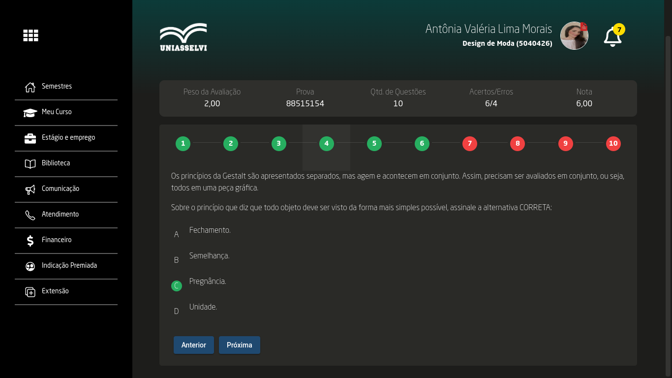 Antônia Lima Morais 7 UNIASSELVI Design de Moda (5040426) Semestres Peso da Avaliação Prova Qtd de Questões Acertos/Erros Nota 2,00 88515154 10 6/4 6,00 Meu Curso Estágio e emprego 1 2 3 4 5 6 7 8 9 10 Biblioteca Os princípios da Gestalt são apresentados separados, mas agem e acontecem em conjunto. Assim, precisam ser avaliados em conjunto, ou seja, Comunicação todos em uma peça Sobre princípio que diz que todo objeto deve ser visto da forma mais simples possível, assinale a alternativa CORRETA Atendimento Fechamento. A $ Financeiro Semelhança. Indicação Premiada C Pregnância. Extensão D Anterior Próxima