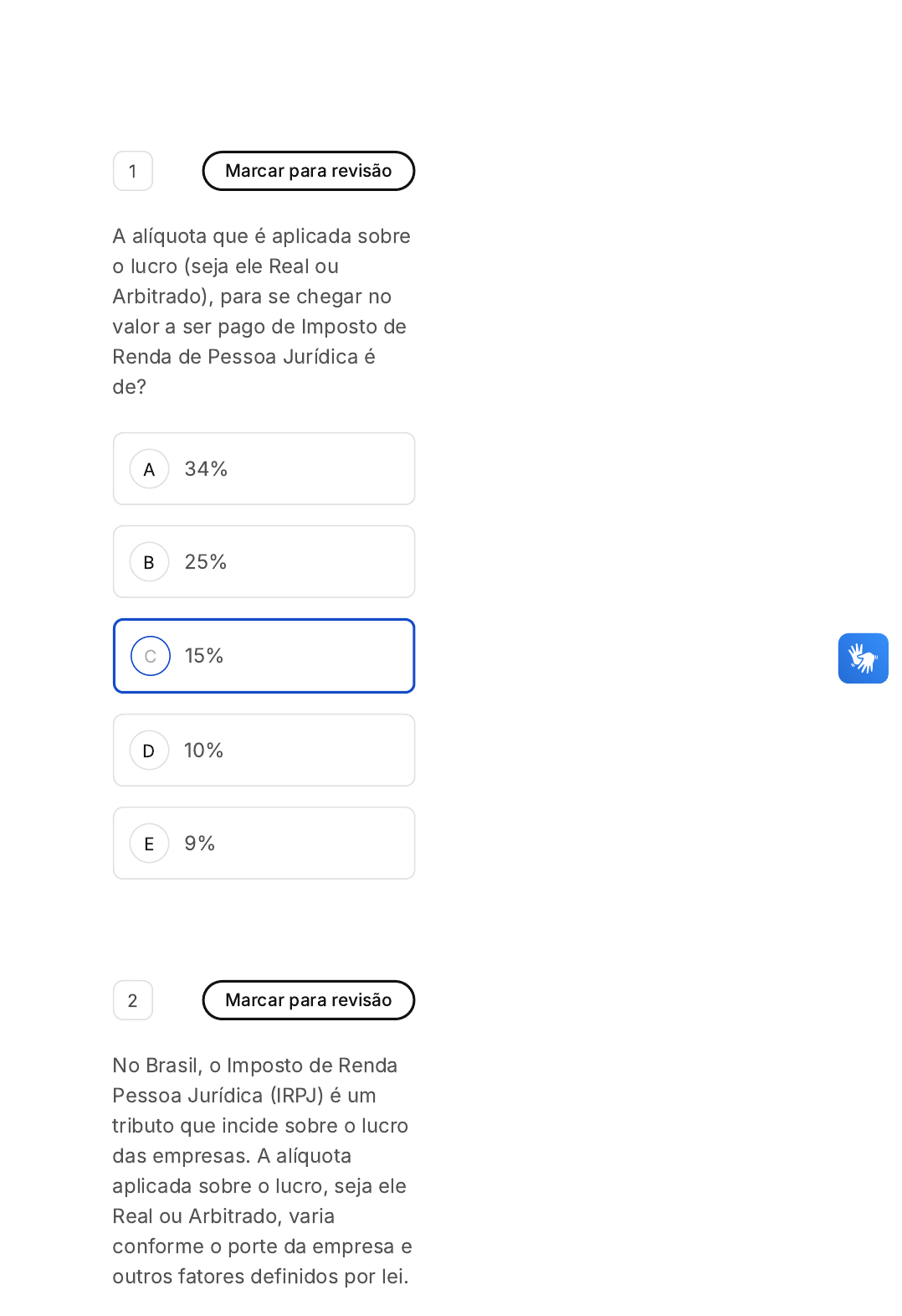 <p>A</p><p>B</p><p>C</p><p>D</p><p>E</p><p>1 Marcar para revisão</p><p>A alíquota que é aplicada sobre</p><p>o lucro (seja ele Real ou</p><p>Arbitrado), para se chegar no</p><p>valor a ser pago de Imposto de</p><p>Renda de Pessoa Jurídica é</p><p>de?</p><p>34%</p><p>25%</p><p>15%</p><p>10%</p><p>9%</p><p>2 Marcar para revisão</p><p>No Brasil, o Imposto de Renda</p><p>Pessoa Jurídica �IRPJ) é um</p><p>tributo que incide sobre o lucro</p><p>das empresas. A alíquota</p><p>aplicada sobre o lucro, seja ele</p><p>Real ou Arbitrado, varia</p><p>conforme o porte da empresa e</p><p>outros fatores definidos por lei.</p><p>A</p><p>B</p><p>C</p><p>D</p><p>E</p><p>A</p><p>B</p><p>C</p><p>Considerando uma empresa de</p><p>médio ou grande porte, qual é</p><p>a alíquota do IRPJ?</p><p>34%</p><p>25%</p><p>15%</p><p>10%</p><p>9%</p><p>3 Marcar para revisão</p><p>Uma empresa, na hora de</p><p>decidir se opta pelo Regime de</p><p>Lucro Real ou pelo Regime de</p><p>Lucro Presumido deve levar em</p><p>conta o impacto dessa decisão</p><p>nos seguintes impostos:</p><p>ICMS e COFINS</p><p>PIS e COFINS</p><p>ISS e COFINS</p><p>D</p><p>E</p><p>A</p><p>B</p><p>C</p><p>D</p><p>E</p><p>PIS e IPVA</p><p>PIS e IPTU</p><p>4 Marcar para revisão</p><p>Uma empresa ao recolher o</p><p>Imposto de Renda Retido na</p><p>Fonte de seus funcionários</p><p>está agindo como:</p><p>Sujeito Passivo da</p><p>Obrigação Acessória.</p><p>Sujeito Passivo</p><p>Contribuinte da</p><p>Obrigação Acessória.</p><p>Sujeito Passivo</p><p>Responsável da</p><p>Obrigação Principal.</p><p>Sujeito Passivo</p><p>Contribuinte da</p><p>Obrigação Principal.</p><p>Sujeito Passivo</p><p>Responsável da</p><p>Obrigação Acessória.</p><p>A</p><p>B</p><p>C</p><p>D</p><p>E</p><p>5 Marcar para revisão</p><p>A definição ''estabelecimento</p><p>de transmissão única de</p><p>distintas obrigações acessórias</p><p>de diferentes órgãos</p><p>fiscalizadores'' corresponde a:</p><p>Racionalizar as</p><p>obrigações</p><p>acessórias para os</p><p>contribuintes.</p><p>Uniformização das</p><p>obrigações principais</p><p>para os contribuintes.</p><p>Integração dos fiscos.</p><p>SPED.</p><p>NF-e.</p><p>6 Marcar para revisão</p><p>A definição "estabelecimento</p><p>de transmissão única de</p><p>distintas obrigações acessórias</p><p>de diferentes órgãos</p><p>fiscalizadores" corresponde a:</p><p>A</p><p>B</p><p>C</p><p>D</p><p>E</p><p>A</p><p>B</p><p>Racionalizar as</p><p>obrigações</p><p>acessórias para os</p><p>contribuintes.</p><p>Uniformização das</p><p>obrigações principais</p><p>para os contribuintes.</p><p>Integração dos fiscos.</p><p>Tornar mais célere a</p><p>identificação de</p><p>ilícitos tributários.</p><p>NF-e.</p><p>7 Marcar para revisão</p><p>A definição "padronização e</p><p>compartilhamento das</p><p>informações contábeis e</p><p>fiscais, respeitadas as</p><p>restrições legais" corresponde</p><p>a:</p><p>Racionalizar as</p><p>obrigações acessórias</p><p>para os contribuintes.</p><p>Uniformização das</p><p>obrigações acessórias</p><p>para os contribuintes.</p><p>C</p><p>D</p><p>E</p><p>A</p><p>B</p><p>C</p><p>D</p><p>E</p><p>Integração dos fiscos.</p><p>SPED.</p><p>NF-e.</p><p>8 Marcar para revisão</p><p>Qual é o limite para</p><p>exportações em seis meses</p><p>consecutivos para uma</p><p>empresa se cadastrar como</p><p>"Habilitação Simplificada" no</p><p>SISCOMEX?</p><p>U$100.000,00</p><p>U$150.000,00</p><p>U$250.000,00</p><p>U$300.000,00</p><p>U$450.000,00</p><p>9 Marcar para revisão</p><p>A</p><p>B</p><p>C</p><p>D</p><p>E</p><p>Qual dos seguintes órgãos</p><p>federais deve aprovar a</p><p>habilitação de uma pessoa</p><p>física ou jurídica no SISCOMEX</p><p>�Sistemas de Comércio</p><p>Exterior)?</p><p>Receita Federal.</p><p>Congresso Nacional.</p><p>Superior Tribunal</p><p>Federal.</p><p>Tribunal de Contas da</p><p>União.</p><p>Ministério Público</p><p>Federal.</p><p>10 Marcar para revisão</p><p>Uma empresa que exporta</p><p>farelo de milho só fez uma</p><p>transação em moeda</p><p>estrangeira, a venda de</p><p>mercadorias (farelo de milho)</p><p>para o exterior por</p><p>U$10.000,00 recebidos em</p><p>conta internacional em dólares.</p><p>Essa transação ocorreu em</p><p>13/11/X1, e ela mantém esse</p><p>valor em dólares sem fazer o</p><p>câmbio para reais até a data</p><p>das demonstrações financeiras</p><p>em 31/12/X1. O dólar, na data</p><p>00</p><p>hora</p><p>: 34</p><p>min</p><p>: 17</p><p>seg</p><p>Ocultar</p><p>Questão 10 de 10</p><p>Respondidas �10� Em branco �0�</p><p>Finalizar prova</p><p>1 2 3 4 5</p><p>6 7 8 9 10</p><p>SM2 Gestão Tributária e Sped</p><p>A</p><p>B</p><p>C</p><p>D</p><p>E</p><p>de 13/11/X1, estava cotado a</p><p>R$4,50 e, em 31/12/X1, a</p><p>cotação era de R$4,95. A</p><p>moeda funcional da empresa é</p><p>o real.</p><p>Quanto a empresa deverá</p><p>pagar de Imposto de</p><p>Exportação nessa operação?</p><p>R$13.500,00</p><p>R$14.500,00</p><p>R$15.500,00</p><p>R$16.500,00</p><p>R$17.500,00</p>