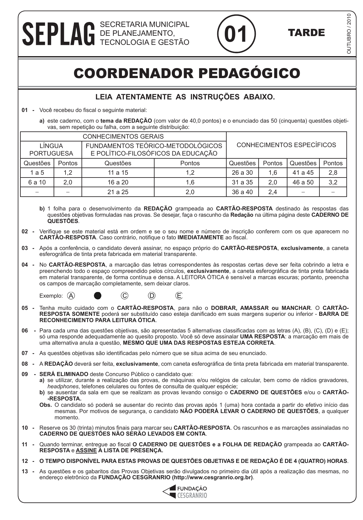 <p>pcimarkpci MDAwMDowMDAwOjAwMDA6MDAwMDowMDAwOmZmZmY6MmRiNDo2YjZj:RnJpLCAxOCBPY3QgMjAyNCAwNToxOToxOCAtMDMwMA==</p><p>www.pciconcursos.com.br</p><p>COORDENADOR PEDAGÓGICO</p><p>1</p><p>LEIA ATENTAMENTE AS INSTRUÇÕES ABAIXO.</p><p>01 - Você recebeu do fiscal o seguinte material:</p><p>a) este caderno, com o tema da REDAÇÃO (com valor de 40,0 pontos) e o enunciado das 50 (cinquenta) questões objeti-</p><p>vas, sem repetição ou falha, com a seguinte distribuição:</p><p>b) 1 folha para o desenvolvimento da REDAÇÃO grampeada ao CARTÃO-RESPOSTA destinado às respostas das</p><p>questões objetivas formuladas nas provas. Se desejar, faça o rascunho da Redação na última página deste CADERNO DE</p><p>QUESTÕES.</p><p>02 - Verifique se este material está em ordem e se o seu nome e número de inscrição conferem com os que aparecem no</p><p>CARTÃO-RESPOSTA. Caso contrário, notifique o fato IMEDIATAMENTE ao fiscal.</p><p>03 - Após a conferência, o candidato deverá assinar, no espaço próprio do CARTÃO-RESPOSTA, exclusivamente, a caneta</p><p>esferográfica de tinta preta fabricada em material transparente.</p><p>04 - No CARTÃO-RESPOSTA, a marcação das letras correspondentes às respostas certas deve ser feita cobrindo a letra e</p><p>preenchendo todo o espaço compreendido pelos círculos, exclusivamente, a caneta esferográfica de tinta preta fabricada</p><p>em material transparente, de forma contínua e densa. A LEITORA ÓTICA é sensível a marcas escuras; portanto, preencha</p><p>os campos de marcação completamente, sem deixar claros.</p><p>Exemplo:</p><p>05 - Tenha muito cuidado com o CARTÃO-RESPOSTA, para não o DOBRAR, AMASSAR ou MANCHAR. O CARTÃO-</p><p>RESPOSTA SOMENTE poderá ser substituído caso esteja danificado em suas margens superior ou inferior - BARRA DE</p><p>RECONHECIMENTO PARA LEITURA ÓTICA.</p><p>06 - Para cada uma das questões objetivas, são apresentadas 5 alternativas classificadas com as letras (A), (B), (C), (D) e (E);</p><p>só uma responde adequadamente ao quesito proposto. Você só deve assinalar UMA RESPOSTA: a marcação em mais de</p><p>uma alternativa anula a questão, MESMO QUE UMA DAS RESPOSTAS ESTEJA CORRETA.</p><p>07 - As questões objetivas são identificadas pelo número que se situa acima de seu enunciado.</p><p>08 - A REDAÇÃO deverá ser feita, exclusivamente, com caneta esferográfica de tinta preta fabricada em material transparente.</p><p>09 - SERÁ ELIMINADO deste Concurso Público o candidato que:</p><p>a) se utilizar, durante a realização das provas, de máquinas e/ou relógios de calcular, bem como de rádios gravadores,</p><p>headphones, telefones celulares ou fontes de consulta de qualquer espécie;</p><p>b) se ausentar da sala em que se realizam as provas levando consigo o CADERNO DE QUESTÕES e/ou o CARTÃO-</p><p>-RESPOSTA.</p><p>Obs. O candidato só poderá se ausentar do recinto das provas após 1 (uma) hora contada a partir do efetivo início das</p><p>mesmas. Por motivos de segurança, o candidato NÃO PODERÁ LEVAR O CADERNO DE QUESTÕES, a qualquer</p><p>momento.</p><p>10 - Reserve os 30 (trinta) minutos finais para marcar seu CARTÃO-RESPOSTA. Os rascunhos e as marcações assinaladas no</p><p>CADERNO DE QUESTÕES NÃO SERÃO LEVADOS EM CONTA.</p><p>11 - Quando terminar, entregue ao fiscal O CADERNO DE QUESTÕES e a FOLHA DE REDAÇÃO grampeada ao CARTÃO-</p><p>RESPOSTA e ASSINE A LISTA DE PRESENÇA.</p><p>12 - O TEMPO DISPONÍVEL PARA ESTAS PROVAS DE QUESTÕES OBJETIVAS E DE REDAÇÃO É DE 4 (QUATRO) HORAS.</p><p>13 - As questões e os gabaritos das Provas Objetivas serão divulgados no primeiro dia útil após a realização das mesmas, no</p><p>endereço eletrônico da FUNDAÇÃO CESGRANRIO (http://www.cesgranrio.org.br).</p><p>01</p><p>O</p><p>U</p><p>TU</p><p>B</p><p>R</p><p>O</p><p>/</p><p>20</p><p>10</p><p>COORDENADOR PEDAGÓGICO</p><p>SECRETARIA MUNICIPAL</p><p>DE PLANEJAMENTO,</p><p>TECNOLOGIA E GESTÃO</p><p>CONHECIMENTOS GERAIS</p><p>CONHECIMENTOS ESPECÍFICOSLÍNGUA</p><p>PORTUGUESA</p><p>FUNDAMENTOS TEÓRICO-METODOLÓGICOS</p><p>E POLÍTICO-FILOSÓFICOS DA EDUCAÇÃO</p><p>Questões Pontos Questões Pontos Questões Pontos Questões Pontos</p><p>1 a 5 1,2 11 a 15 1,2 26 a 30 1,6 41 a 45 2,8</p><p>6 a 10 2,0 16 a 20 1,6 31 a 35 2,0 46 a 50 3,2</p><p>− − 21 a 25 2,0 36 a 40 2,4 − −</p><p>TARDE</p><p>pcimarkpci MDAwMDowMDAwOjAwMDA6MDAwMDowMDAwOmZmZmY6MmRiNDo2YjZj:RnJpLCAxOCBPY3QgMjAyNCAwNToxOToxOCAtMDMwMA==</p><p>www.pciconcursos.com.br</p><p>COORDENADOR PEDAGÓGICO 2</p><p>R E D A Ç Ã O</p><p>Os textos a seguir revelam uma preocupação acerca do papel da escola contemporânea. Leia-os com atenção.</p><p>TEXTO I</p><p>O Texto I é um fragmento de uma entrevista com António Nóvoa, reitor da Universidade de Lisboa, em que ele discorre</p><p>sobre os rumos da escola contemporânea.</p><p>Qual é o principal desafio de um gestor escolar atualmente?</p><p>NÓVOA ─ Acredito que é decidir o que é essencial ensinar aos alunos e garantir que as disciplinas elementares não sejam</p><p>prejudicadas pela avalanche de conteúdos que são propostos atualmente. Hoje, a equipe docente se ocupa da Educação</p><p>Ambiental, alimentar e comportamental e com programas de prevenção a AIDS, acidentes de trânsito e violência sexual.</p><p>Todos muito importantes, mas que não são responsabilidade da escola. Ao tentar colocar tudo no mesmo pote, falta es-</p><p>paço para o básico.</p><p>Como saber o que é essencial?</p><p>NÓVOA ─ Há um pensamento notável de Olivier Reboul, filósofo francês (1925-1992). Ele diz que deve ser ensinado na</p><p>escola tudo o que une e tudo o que liberta. O que une é aquilo que integra cada indivíduo num espaço de cultura, em</p><p>determinada comunidade: a Língua, as Artes Plásticas, a Música, a História, etc. Já o que liberta é o que promove a aqui-</p><p>sição do conhecimento, o despertar do espírito científico, a capacidade de j