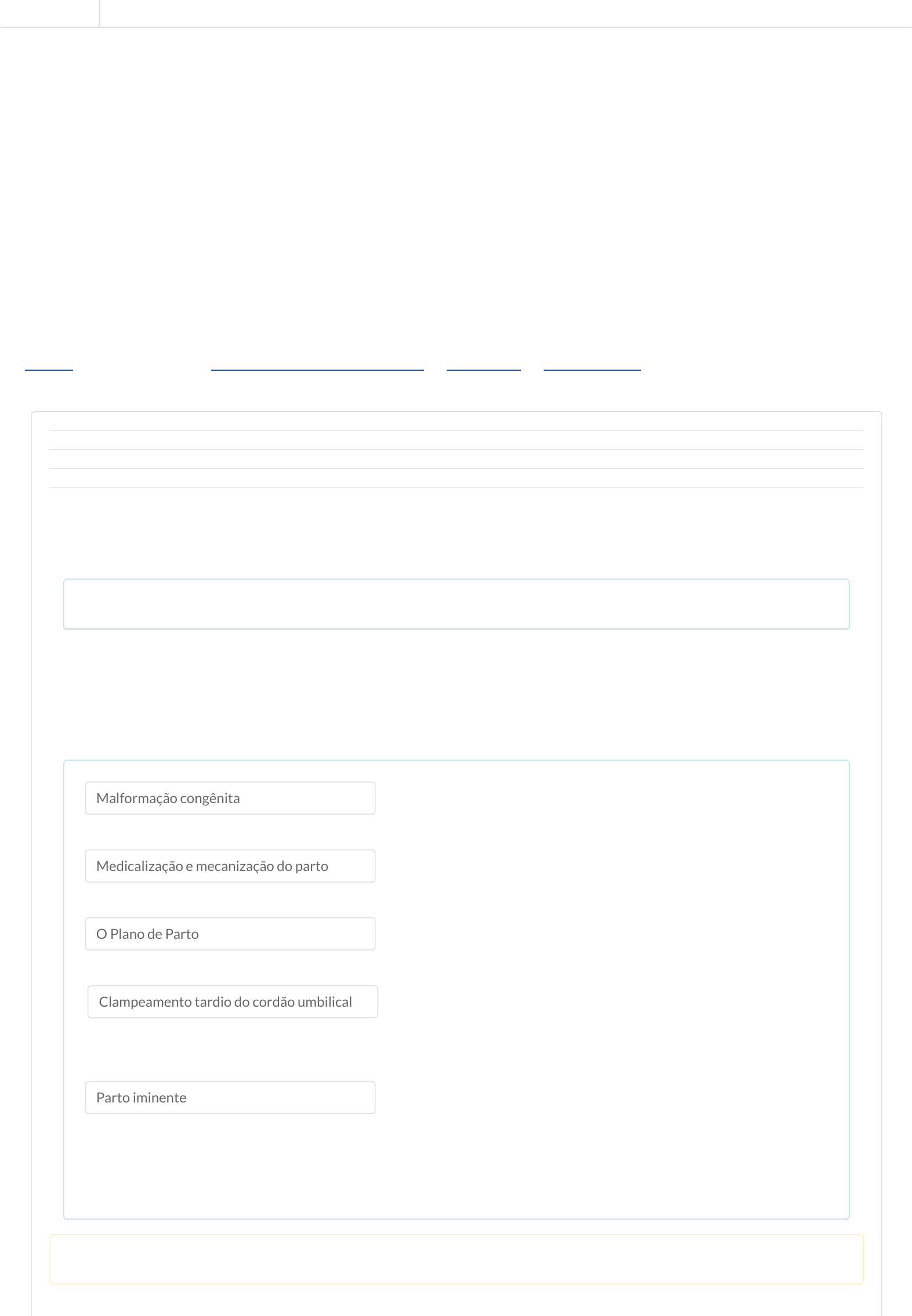 <p> PAINEL  MEUS CURSOS  MÓDULO 9 - SAÚDE DA MULHER  UNIDADE 3  ATIVIDADE 3.4</p><p>Módulo 9 - Saúde da mulher</p><p>Iniciado em sexta, 18 out 2024, 20:00</p><p>Estado Finalizada</p><p>Concluída em sexta, 18 out 2024, 20:11</p><p>Tempo empregado 10 minutos 29 segundos</p><p>Informação</p><p>Questão 1</p><p>Completo</p><p>Não avaliada</p><p>A partir dos seus estudos complete os espaços com as palavras correspondentes:</p><p>: Casos em que o embrião ou feto foi exposto a algum agente</p><p>teratogênico durante a gravidez que resultou em dano.</p><p>: através do excessivo uso de tecnologias intervencionistas têm</p><p>contribuído para despertar sentimentos de insegurança e ansiedade prejudicando o trabalho de parto.</p><p>: é uma ferramenta potencializadora de cuidados humanizados à</p><p>mulher e ao recém-nascido.</p><p>: é recomendado para melhorar os resultados de nutrição e saúde</p><p>materna e infantil, pois possibilita que um volume maior de sangue passe para o bebe, melhorando seu suprimento de</p><p>ferro, menor taxa de hemorragia intraventricular, enterocolite necrosante e transfusões de sangue.</p><p>: quando a parturiente está em fase expulsiva ou no segundo período de</p><p>trabalho de parto e não há possibilidade de transporte adequado para maternidade de referência.</p><p>Malformação congênita</p><p>Medicalização e mecanização do parto</p><p>O Plano de Parto</p><p>Clampeamento tardio do cordão umbilical</p><p>Parto iminente</p><p>Sua resposta está correta.</p><p>BRASIL Acesso à informação</p><p>18/10/24, 19:11 Atividade 3.4: Revisão da tentativa</p><p>https://ead.matogrossodosul.fiocruz.br/mm1/mod/quiz/review.php?attempt=62562&cmid=888 1/2</p><p>https://ead.matogrossodosul.fiocruz.br/mm1/my/</p><p>https://ead.matogrossodosul.fiocruz.br/mm1/course/view.php?id=24</p><p>https://ead.matogrossodosul.fiocruz.br/mm1/course/view.php?id=24#section-3</p><p>https://ead.matogrossodosul.fiocruz.br/mm1/mod/quiz/view.php?id=888</p><p>http://brasil.gov.br/</p><p>http://brasil.gov.br/barra#acesso-informacao</p><p>http://brasil.gov.br/barra#acesso-informacao</p><p>◄ Orientações sobre o parto</p><p>Seguir para...</p><p>Atenção qualificada no puerpério ►</p><p>BRASIL Acesso à informação</p><p>18/10/24, 19:11 Atividade 3.4: Revisão da tentativa</p><p>https://ead.matogrossodosul.fiocruz.br/mm1/mod/quiz/review.php?attempt=62562&cmid=888 2/2</p><p>https://ead.matogrossodosul.fiocruz.br/mm1/mod/ppuunasus/view.php?id=887&forceview=1</p><p>https://ead.matogrossodosul.fiocruz.br/mm1/mod/ppuunasus/view.php?id=889&forceview=1</p><p>http://brasil.gov.br/</p><p>http://brasil.gov.br/barra#acesso-informacao</p><p>http://brasil.gov.br/barra#acesso-informacao</p>