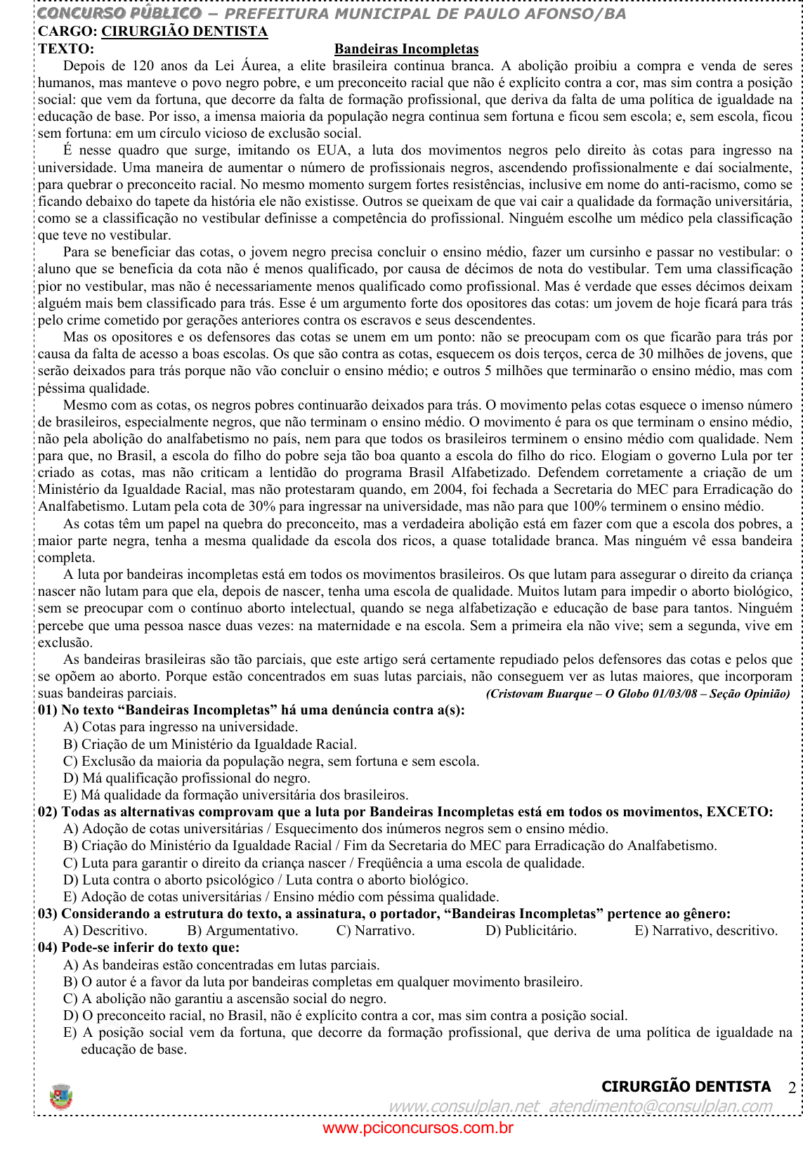 <p>pcimarkpci MDAwMDowMDAwOjAwMDA6MDAwMDowMDAwOmZmZmY6YjEzMzoyMjll:RnJpLCAxOCBPY3QgMjAyNCAyMzowMTo1MSAtMDMwMA==</p><p>www.pciconcursos.com.br</p><p>CCCOOONNNCCCUUURRRSSSOOO PPPÚÚÚBBBLLLIIICCCOOO − PREFEITURA MUNICIPAL DE PAULO AFONSO/BA</p><p>CIRURGIÃO DENTISTA</p><p>www.consulplan.net atendimento@consulplan.com</p><p>2</p><p>CARGO: CIRURGIÃO DENTISTA</p><p>TEXTO: Bandeiras Incompletas</p><p>Depois de 120 anos da Lei Áurea, a elite brasileira continua branca. A abolição proibiu a compra e venda de seres</p><p>humanos, mas manteve o povo negro pobre, e um preconceito racial que não é explícito contra a cor, mas sim contra a posição</p><p>social: que vem da fortuna, que decorre da falta de formação profissional, que deriva da falta de uma política de igualdade na</p><p>educação de base. Por isso, a imensa maioria da população negra continua sem fortuna e ficou sem escola; e, sem escola, ficou</p><p>sem fortuna: em um círculo vicioso de exclusão social.</p><p>É nesse quadro que surge, imitando os EUA, a luta dos movimentos negros pelo direito às cotas para ingresso na</p><p>universidade. Uma maneira de aumentar o número de profissionais negros, ascendendo profissionalmente e daí socialmente,</p><p>para quebrar o preconceito racial. No mesmo momento surgem fortes resistências, inclusive em nome do anti-racismo, como se</p><p>ficando debaixo do tapete da história ele não existisse. Outros se queixam de que vai cair a qualidade da formação universitária,</p><p>como se a classificação no vestibular definisse a competência do profissional. Ninguém escolhe um médico pela classificação</p><p>que teve no vestibular.</p><p>Para se beneficiar das cotas, o jovem negro precisa concluir o ensino médio, fazer um cursinho e passar no vestibular: o</p><p>aluno que se beneficia da cota não é menos qualificado, por causa de décimos de nota do vestibular. Tem uma classificação</p><p>pior no vestibular, mas não é necessariamente menos qualificado como profissional. Mas é verdade que esses décimos deixam</p><p>alguém mais bem classificado para trás. Esse é um argumento forte dos opositores das cotas: um jovem de hoje ficará para trás</p><p>pelo crime cometido por gerações anteriores contra os escravos e seus descendentes.</p><p>Mas os opositores e os defensores das cotas se unem em um ponto: não se preocupam com os que ficarão para trás por</p><p>causa da falta de acesso a boas escolas. Os que são contra as cotas, esquecem os dois terços, cerca de 30 milhões de jovens, que</p><p>serão deixados para trás porque não vão concluir o ensino médio; e outros 5 milhões que terminarão o ensino médio, mas com</p><p>péssima qualidade.</p><p>Mesmo com as cotas, os negros pobres continuarão deixados para trás. O movimento pelas cotas esquece o imenso número</p><p>de brasileiros, especialmente negros, que não terminam o ensino médio. O movimento é para os que terminam o ensino médio,</p><p>não pela abolição do analfabetismo no país, nem para que todos os brasileiros terminem o ensino médio com qualidade. Nem</p><p>para que, no Brasil, a escola do filho do pobre seja tão boa quanto a escola do filho do rico. Elogiam o governo Lula por ter</p><p>criado as cotas, mas não criticam a lentidão do programa Brasil Alfabetizado. Defendem corretamente a criação de um</p><p>Ministério da Igualdade Racial, mas não protestaram quando, em 2004, foi fechada a Secretaria do MEC para Erradicação do</p><p>Analfabetismo. Lutam pela cota de 30% para ingressar na universidade, mas não para que 100% terminem o ensino médio.</p><p>As cotas têm um papel na quebra do preconceito, mas a verdadeira abolição está em fazer com que a escola dos pobres, a</p><p>maior parte negra, tenha a mesma qualidade da escola dos ricos, a quase totalidade branca. Mas ninguém vê essa bandeira</p><p>completa.</p><p>A luta por bandeiras incompletas está em todos os movimentos brasileiros. Os que lutam para assegurar o direito da criança</p><p>nascer não lutam para que ela, depois de nascer, tenha uma escola de qualidade. Muitos lutam para impedir o aborto biológico,</p><p>sem se preocupar com o contínuo aborto intelectual, quando se nega alfabetização e educação de base para tantos. Ninguém</p><p>percebe que uma pessoa nasce duas vezes: na maternidade e na escola. Sem a primeira ela não vive; sem a segunda, vive em</p><p>exclusão.</p><p>As bandeiras brasileiras são tão parciais, que este artigo será certamente repudiado pelos defensores das cotas e pelos que</p><p>se opõem ao aborto. Porque estão concentrados em suas lutas parciais, não conseguem ver as lutas maiores, que incorporam</p><p>suas bandeiras parciais. (Cristovam Buarque – O Globo 01/03/08 – Seção Opinião)</p><p>01) No texto “Bandeiras Incompletas” há uma denúncia contra a(s):</p><p>A) Cotas para ingresso na universidade.</p><p>B) Criação de um Ministério da Igualdade Racial.</p><p>C) Exclusão da maioria da população negra, sem fortuna e sem escola.</p><p>D) Má qualificação profissional do negro.</p><p>E) Má qualidade da formação universitária dos brasileiros.</p><p>02) Todas as alternativas comprovam que a luta por Bandeiras Incompletas está em todos os movimentos, EXCETO:</p><p>A) Adoção de cotas universitárias / Esquecimento dos inúmeros negros sem o ensino médio.</p><p>B) Criação do Ministério da Igualdade Racial / Fim da Secretaria do MEC para Erradicação do Analfabetismo.</p><p>C) Luta para garantir o direito da criança nascer / Freqüência a uma escola de qualidade.</p><p>D) Luta contra o aborto psicológico / Luta contra o aborto biológico.</p><p>E) Adoção de cotas universitárias / Ensino médio com péssima qualidade.</p><p>03) Considerando a estrutura do texto, a assinatura, o portador, “Bandeiras Incompletas” pertence ao gênero:</p><p>A) Descritivo. B) Argumentativo. C) Narrativo. D) Publicitário. E) Narrativo, descritivo.</p><p>04) 