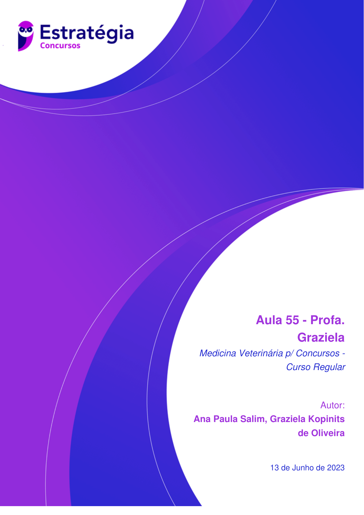 <p>Aula 55 - Profa.</p><p>Graziela</p><p>Medicina Veterinária p/ Concursos -</p><p>Curso Regular</p><p>Autor:</p><p>Ana Paula Salim, Graziela Kopinits</p><p>de Oliveira</p><p>13 de Junho de 2023</p><p>39471799600 - Naldira Luiza Vieria</p><p>Ana Paula Salim, Graziela Kopinits de Oliveira</p><p>Aula 55 - Profa. Graziela</p><p>Índice</p><p>..............................................................................................................................................................................................1) Sedativos e tranquilizantes - considerações iniciais e MPA 3</p><p>..............................................................................................................................................................................................2) Fenotiazinas 9</p><p>..............................................................................................................................................................................................3) Butirofenonas 17</p><p>..............................................................................................................................................................................................4) Benzodiazepínicos 19</p><p>..............................................................................................................................................................................................5) alfa-2 adrenérgico 26</p><p>..............................................................................................................................................................................................6) Anticolinérgicos 33</p><p>..............................................................................................................................................................................................7) Opioides 37</p><p>..............................................................................................................................................................................................8) Questões comentadas - Sedativos e tranquilizantes 41</p><p>..............................................................................................................................................................................................9) Lista de questões - Sedativos e tranquilizantes 67</p><p>Medicina Veterinária p/ Concursos - Curso Regular</p><p>www.estrategiaconcursos.com.br</p><p>39471799600 - Naldira Luiza Vieria</p><p>2</p><p>79</p><p>SEDATIVOS E TRANQUILIZANTES</p><p>Considerações Iniciais</p><p>Na aula de hoje vamos estudar os sedativos e tranquilizantes. Estes medicamentos são utilizados,</p><p>mais comumente, durante a realização da medicação pré-anestésica (MPA), mas também podem</p><p>ser uteis como agentes únicos em sedações, para realizações de procedimentos simples.</p><p>Alguns medicamentos podem se enquadrar tanto como sedativo, como tranquilizante, isto porque</p><p>a diferença entre as duas classes é muito tênue, já que os dois reduzem a ansiedade do paciente,</p><p>deixando estes mais calmos, embora agentes sedativos também possam reduzam a resposta aos</p><p>estímulos ambientais e alguns deles ainda apresentam propriedades analgésicas.</p><p>Alguns fatores como a espécie, a raça, a idade, o temperamento, a doença em curso, o equilíbrio</p><p>hídrico e eletrolítico, entre outros, influenciam na escolha do fármaco e na potência deste. Existem</p><p>muitas classes de sedativos utilizados na medicina veterinária. As fenotiazinas, os</p><p>benzodiazepínicos, os agonistas dos receptores α2-adrenérgicos, as butirofenonas e os opioides</p><p>normalmente são indicados para produzir um estado de calma, sedação e, possivelmente,</p><p>analgesia, dependendo das medicações utilizadas1.</p><p>Antes de iniciar, gostaria de deixar um convite a vocês: CURTAM NOSSA PÁGINA NO</p><p>INSTAGRAM, ESPECÍFICA DA SAÚDE. Lá teremos diversas informações úteis. Aproveitem!</p><p>@estrategia.saude</p><p>Boa aula!</p><p>1 GRIMM, K. A.; LAMONT, L. A.; TRANQUILLI, W. J.; GREENE, S. A.; ROBERTSON, S. A. Lumb & Jones Anestesiologia</p><p>e Analgesia em Veterinária, 5 ed, Rio de Janeiro: Roca, 2017.</p><p>Ana Paula Salim, Graziela Kopinits de Oliveira</p><p>Aula 55 - Profa. Graziela</p><p>Medicina Veterinária p/ Concursos - Curso Regular</p><p>www.estrategiaconcursos.com.br</p><p>39471799600 - Naldira Luiza Vieria</p><p>3</p><p>79</p><p>Medicação pré-anestésica (MPA)</p><p>A medicação pré-anestésica (MPA) é o procedimento que prepara, farmacologicamente, o</p><p>paciente para receber a anestesia. O principal intuito desse procedimento é a redução da</p><p>ansiedade e do estresse, por meio da tranquilização do paciente para que o procedimento</p><p>anestésico-cirúrgico se torne mais seguro.</p><p>Além disso, muitos fármacos são utilizados na MPA visando diminuir a dose do anestésico geral,</p><p>bem como reduzir ou reverter seus efeitos indesejáveis, como alterações cardiológicas, salivação,</p><p>broncoconstrição, irritabilidade, euforia, vômito, entre outros. Alguns medicamentos utilizados na</p><p>medicação pré-anestésica apresentam ainda propriedades analgésicas e promovem relaxamento</p><p>muscular, condições desejáveis durante a maioria dos procedimentos anestésicos.</p><p>A escolha do fármaco mais adequado para determinado paciente/procedimento deve levar vários</p><p>fatores em consideração, os principais são os relacionados com o animal, como a espécie, a raça,</p><p>a idade, o temperamento e a presença de doenças concomitantes. E os relacionados com o</p><p>procedimento, como o objetivo da MPA, o tipo de doença, o procedimento a ser realizado, a</p><p>duração do procedimento, o tipo de anestesia que será realizada, os fármacos que serão utilizados</p><p>para o procedimento anestésico geral, a experiência e prefer