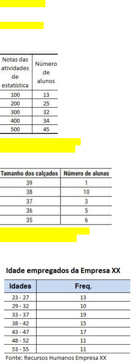 <p>ATIVIDADES</p><p>1. Para os conjuntos de valores abaixo, calcule a mediana:</p><p>a) 3, 5, 2, 6, 5, 8, 5, 6, 8, 6 =</p><p>MEDIANA = 5,5</p><p>b) 20, 7, 7, 12, 12, 7, 20, 15, 7 =</p><p>MEDIANA = 12</p><p>2. Para as distribuições abaixo, calcule a mediana:</p><p>a)</p><p>R: MEDIANA ALUNOS = 32</p><p>R: MEDIANA NOTA = 300</p><p>b)</p><p>R: MEDIANA CALÇADOS = 37</p><p>R: MEDIANA ALUNAS = 5</p><p>3. Para as distribuições abaixo, calcule a mediana:</p><p>a)</p><p>R: MEDIANA IDADES = 38-42</p><p>R: MEDIANA FREQUÊNCIA = 13</p><p>b)</p><p>R: MEDIANA ALTURA = 1,75</p><p>R: MEDIANA Fi = 3</p><p>3. Ao final de uma campanha para a compra de um bebedouro novo para uma escola, a arrecadação foi apresentada pela tabela abaixo. Considerando o exposto, calcule a mediana de valor doado.</p><p>R: MEDIANA VALOR DOADO = R$10,00</p><p>4. A distribuição de salários de uma empresa é fornecido pela tabela a seguir. Calcule a mediana dos salários dos funcionários da empresa.</p><p>R: MEDIANA DOS SALÁRIOS = R$ 1.750,00</p><p>image1.png</p><p>image2.png</p><p>image3.png</p><p>image4.png</p><p>image5.jpeg</p><p>image6.png</p>