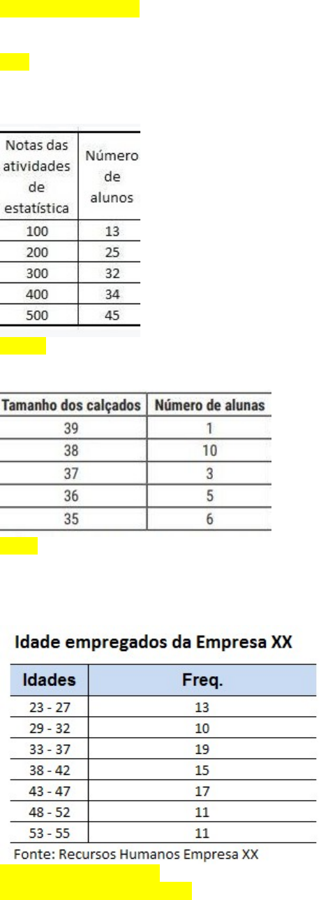 <p>ATIVIDADES</p><p>1. Para os conjuntos de valores abaixo, calcule a moda:</p><p>a) 3, 5, 2, 6, 5, 8, 5, 6, 8, 6 =</p><p>R: 5 e 6 - BIMODAL</p><p>b) 20, 7, 7, 12, 12, 7, 20, 15, 7 =</p><p>R: 7</p><p>2. Para as distribuições abaixo, calcule a moda:</p><p>a)</p><p>R: 500</p><p>b)</p><p>R: 38</p><p>3. Para as distribuições abaixo, calcule a moda geral e moda de Czuber:</p><p>a)</p><p>R: MODA GERAL = 35</p><p>R: MODA CZUBER = 35,76</p><p>b)</p><p>R: MODA GERAL = 1,75</p><p>R: MODA CZUBER = 1,7542</p><p>3. Ao final de uma campanha para a compra de um bebedouro novo para uma escola, a arrecadação foi apresentada pela tabela abaixo. Considerando o exposto, calcule a moda de valor doado.</p><p>R: R$ 5,00</p><p>4. A distribuição de salários de uma empresa é fornecido pela tabela a seguir. Calcule a moda dos salários dos funcionários da empresa.</p><p>:</p><p>R: R$ 2.000,00</p><p>image1.png</p><p>image2.png</p><p>image3.png</p><p>image4.png</p><p>image5.jpeg</p><p>image6.png</p>