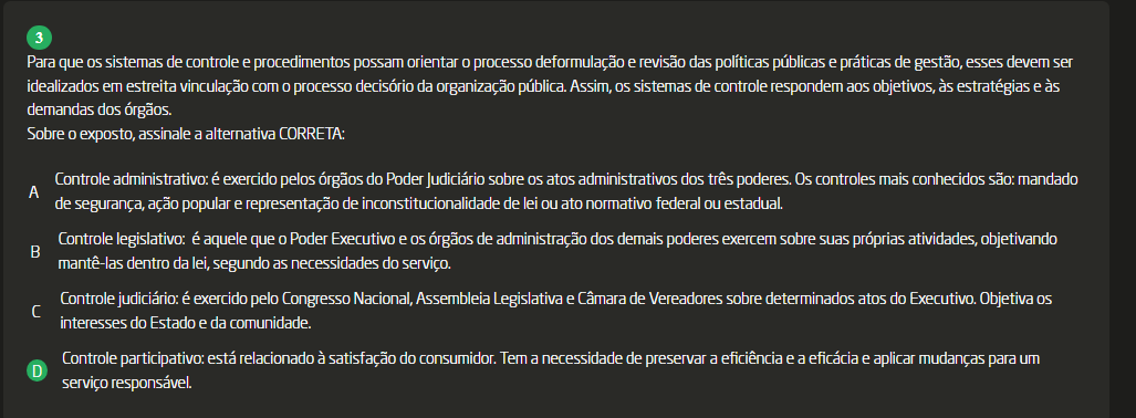 3 Para que sistemas de controle e procedimentos possam orientar processo deformulação e revisão das políticas públicas e práticas de gestão, esses devem ser idealizados em estreita vinculação com processo decisório da organização pública. Assim, sistemas de controle respondem aos objetivos, às estratégias e às demandas dos Sobre exposto, assinale a alternativa CORRETA: Controle administrativo: é exercido pelos órgãos do Poder sobre atos administrativos dos três poderes. Os controles mais conhecidos são: mandado A de segurança, ação popular e representação de inconstitucionalidade de lei ou ato normativo federal ou estadual. Controle legislativo: é aquele que Poder Executivo e os órgãos de administração dos demais poderes exercem sobre suas próprias atividades, objetivando B mantê-las dentro da lei, segundo as necessidades do serviço. Controle judiciário: é exercido pelo Congresso Nacional, Assembleia Legislativa e Câmara de Vereadores sobre determinados atos do Executivo. Objetiva os interesses do Estado e da comunidade. Controle participativo: está relacionado à satisfação do consumidor. Tem a necessidade de preservar a eficiência e a eficácia e aplicar mudanças para um D serviço responsável.
