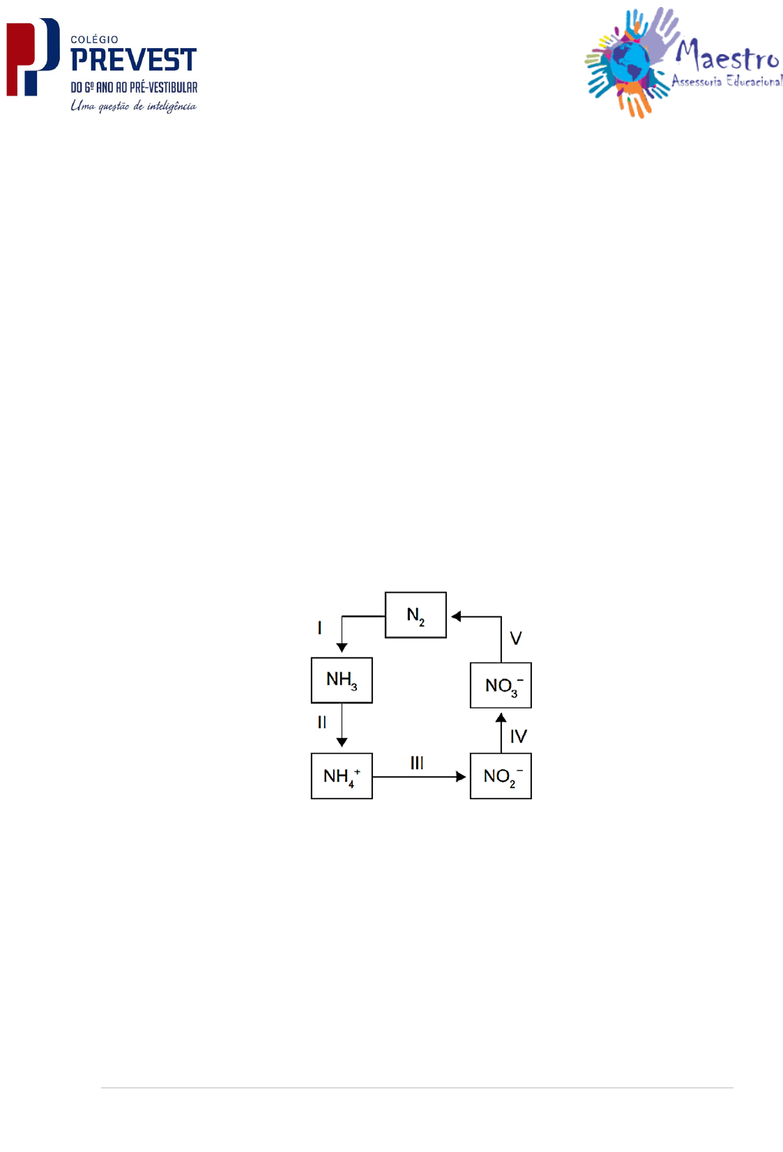 <p>Rua do Oratório, 977 – Mooca</p><p>Fone: (11) 2601 - 5973</p><p>www.maestroassessoria.com.br</p><p>(A) construção, nas pequenas propriedades, de grandes fornos elétricos para</p><p>torrar a mandioca.</p><p>(B) plantação, em suas propriedades, de árvores para serem utilizadas na</p><p>produção de lenha.</p><p>(C) permissão, por parte do Ibama, da exploração da Mata Atlântica apenas</p><p>pelos pequenos produtores.</p><p>(D) construção de biodigestores, para a produção de gás combustível a partir</p><p>de resíduos orgânicos da região.</p><p>(E) coleta de carvão de regiões mais distantes, onde existe menor</p><p>intensidade de fiscalização do Ibama.</p><p>Questão 03: A aplicação excessiva de fertilizantes nitrogenados na</p><p>agricultura pode acarretar alterações no solo e na água pelo acúmulo de</p><p>compostos nitrogenados, principalmente a forma mais oxidada, favorecendo</p><p>a proliferação de algas e plantas aquáticas e alterando o ciclo do nitrogênio,</p><p>representado no esquema. A espécie nitrogenada mais oxidada tem sua</p><p>quantidade controlada por ação de microrganismos que promovem a reação</p><p>de redução dessa espécie, no processo denominado desnitrificação.</p><p>O processo citado está representado na etapa</p><p>(A) I.</p><p>(B) II.</p><p>(C) C III.</p><p>(D) IV.</p><p>(E) V</p>