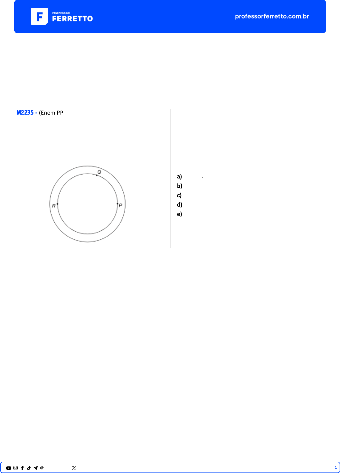 <p>ENEM</p><p>Trigonometria</p><p>Arcos na Circunferência</p><p>M2235 - (Enem PPL)</p><p>Uma pista circular delimitada por duas circunferências</p><p>concêntricas foi construída. Na circunferência interna dessa</p><p>pista, de raio 0,3 km, serão colocados aparelhos de ginástica</p><p>localizados nos pontos P, Q e R, conforme a figura.</p><p>O segmento RP é um diâmetro dessa circunferência</p><p>interna, e o ângulo 𝑃</p><p>^</p><p>𝑅𝑄 tem medida igual a π/5</p><p>radianos.</p><p>Para uma pessoa ir do ponto P ao ponto Q andando pela</p><p>circunferência interna no sen�do an�-horário, ela</p><p>percorrerá uma distância, em quilômetro, igual a</p><p>a) 0,009π.</p><p>b) 0,03π.</p><p>c) 0,06π.</p><p>d) 0,12π.</p><p>e) 0,18π.</p><p>1@professorferretto @prof_ferretto</p>