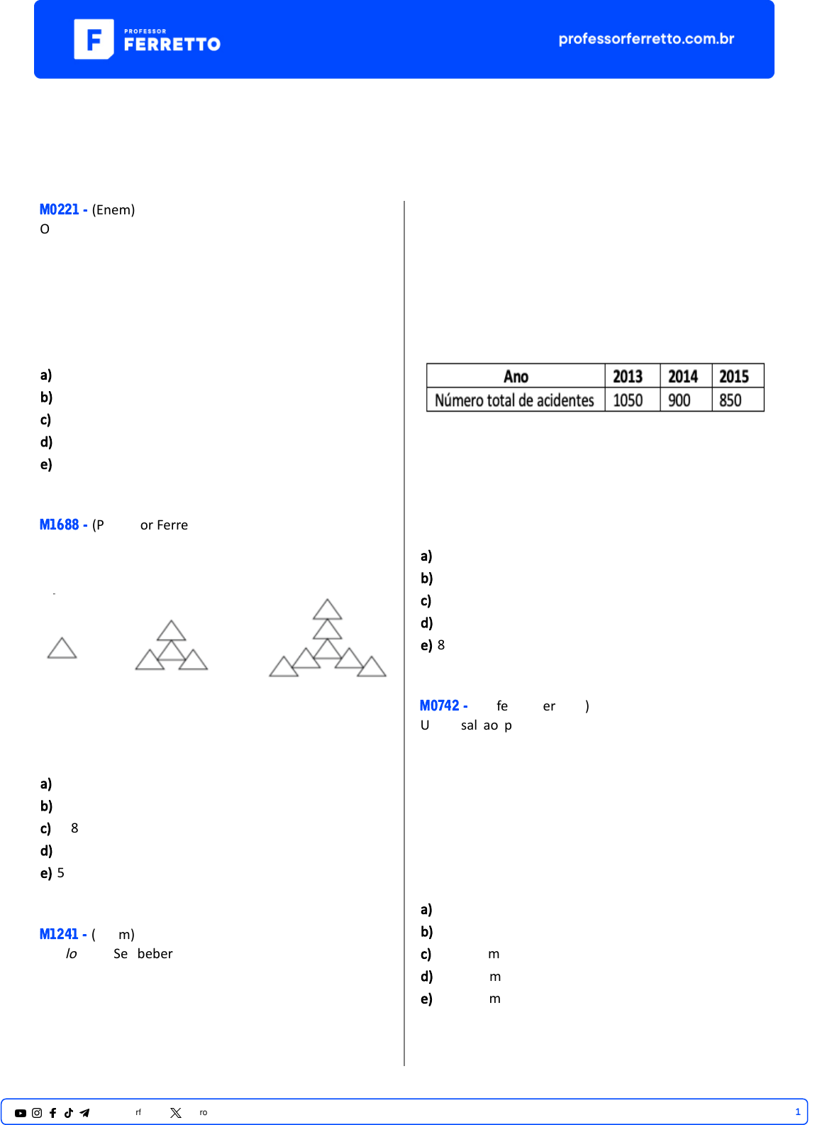 <p>Progressões</p><p>Progressão Aritmética</p><p>M0221 - (Enem)</p><p>O número mensal de passagens de uma determinada</p><p>empresa aérea aumentou no ano passado nas seguintes</p><p>condições: em janeiro foram vendidas 33 000 passagens;</p><p>em fevereiro, 34 500; em março, 36 000. Esse padrão de</p><p>crescimento se mantém para os meses subsequentes.</p><p>Quantas passagens foram vendidas por essa empresa em</p><p>julho do ano passado?</p><p>a) 38 000</p><p>b) 40 500</p><p>c) 41 000</p><p>d) 42 000</p><p>e) 48 000</p><p>M1688 - (Professor Ferre�o)</p><p>Abaixo está sendo representada uma sequência de</p><p>triângulos que vai aumentado conforme o padrão</p><p>apresentado.</p><p>Supondo que se mantenha constante o ritmo de</p><p>aumento, qual o número de triângulos que obteremos na</p><p>60ª figura (somente nela)?</p><p>a) 140</p><p>b) 180</p><p>c) 178</p><p>d) 240</p><p>e) 537</p><p>M1241 - (Enem)</p><p>O slogan “Se beber não dirija”, muito u�lizado em</p><p>campanhas publicitárias no Brasil, chama a atenção para</p><p>o grave problema da ingestão de bebida alcoólica por</p><p>motoristas e suas consequências para o trânsito. A</p><p>gravidade desse problema pode ser percebida</p><p>observando como o assunto é tratado pelo Código de</p><p>Trânsito Brasileiro. Em 2013, a quan�dade máxima de</p><p>álcool permi�da no sangue do condutor de um veículo,</p><p>que já era pequena, foi reduzida, e o valor da multa para</p><p>motoristas alcoolizados foi aumentado. Em consequência</p><p>dessas mudanças, observou-se queda no número de</p><p>acidentes registrados em uma suposta rodovia nos anos</p><p>que se seguiram às mudanças implantadas em 2013,</p><p>conforme dados no quadro.</p><p>Suponha que a tendência de redução no número de</p><p>acidentes nessa rodovia para os anos subsequentes seja</p><p>igual à redução absoluta observada de 2014 para 2015.</p><p>Com base na situação apresentada, o número de</p><p>acidentes esperados nessa rodovia em 2018 foi de</p><p>a) 150.</p><p>b) 450.</p><p>c) 550.</p><p>d) 700.</p><p>e) 800.</p><p>M0742 - (Professor Ferre�o)</p><p>Um casal ao planejar sua viagem de férias estabeleceu</p><p>uma programação quanto à quilometragem diária a ser</p><p>percorrida durante os 20 dias que estarão viajando. Ficou</p><p>decidido a seguinte regra: No primeiro dia, viajariam 500</p><p>km e, nos dias subsequentes, deveriam percorrer 20 km a</p><p>mais que no dia anterior.</p><p>A par�r das informações apresentadas, é correto afirmar</p><p>que o casal, para cumprir o planejamento, deverá</p><p>percorrer no mínimo:</p><p>a) 14.000 km</p><p>b) 13.800 km</p><p>c) 13.600 km</p><p>d) 13.400 km</p><p>e) 13.200 km</p><p>1@professorferretto @prof_ferretto</p><p>M0223 - (Enem)</p><p>O trabalho em empresas exige dos profissionais</p><p>conhecimentos de diferentes áreas. Na semana passada,</p><p>todos os funcionários de uma dessas empresas estavam</p><p>envolvidos na tarefa de determinar a quan�dade de</p><p>estrelas que seriam u�lizadas na confecção de um painel</p><p>de Natal.</p><p>Um dos funcionários apresentou um esboço das</p><p>primeiras cinco linhas do painel, que terá, no total, 150</p><p>linhas.</p><p>Após avaliar o esboço, cada um dos funcionários esboçou</p><p>sua resposta:</p><p>Funcionário I: aproximadamente 200 estrelas.</p><p>Funcionário II: aproximadamente 6 000 estrelas.</p><p>Funcionário III: aproximadamente 12 000 estrelas.</p><p>Funcionário IV: aproximadamente 22 500 estrelas.</p><p>Funcionário V: aproximadamente 22 800 estrelas.</p><p>Qual funcionário apresentou um resultado mais próximo</p><p>da quan�dade de estrelas necessária?</p><p>a) I</p><p>b) II</p><p>c) III</p><p>d) IV</p><p>e) V</p><p>M0228 - (Ifsul)</p><p>Uma das maneiras mais u�lizadas para expor latas de</p><p>produtos nos supermercados é o empilhamento,</p><p>formando uma torre, conforme figura abaixo.</p><p>Suponha que, ao fazer um empilhamento, tenham sido</p><p>u�lizadas 100 latas na base. E, em cada fileira seguinte,</p><p>sejam sempre u�lizadas 8 latas a menos que na fileira</p><p>inferior.</p><p>A quan�dade máxima de fileiras e latas na fileira do topo</p><p>que esse empilhamento pode ter são, respec�vamente,</p><p>a) 8 e 6</p><p>b) 9 e 1</p><p>c) 13 e 4</p><p>d) 14 e 4</p><p>e) 16 e 6</p><p>M0224 - (Enem)</p><p>Nos úl�mos anos, a corrida de rua cresce no Brasil.</p><p>Nunca se falou tanto no assunto como hoje, e a</p><p>quan�dade de adeptos aumenta progressivamente,</p><p>afinal, correr traz inúmeros bene�cios para a saúde �sica</p><p>e mental, além de ser um esporte que não exige um alto</p><p>inves�mento financeiro.</p><p>Um corredor es�pulou um plano de treinamento diário,</p><p>correndo 3 quilômetros no primeiro dia e aumentando</p><p>500 metros por dia, a par�r do segundo. Contudo, seu</p><p>médico cardiologista autorizou essa a�vidade até que o</p><p>corredor a�ngisse, no máximo, 10 km de corrida em um</p><p>mesmo dia de treino. Se o atleta cumprir a</p><p>recomendação médica e pra�car o treinamento</p><p>es�pulado corretamente em dias consecu�vos, pode-se</p><p>afirmar que esse planejamento de treino só poderá ser</p><p>executado em, exatamente,</p><p>a) 12 dias.</p><p>b) 13 dias.</p><p>c) 14 dias.</p><p>d) 15 dias.</p><p>e) 16 dias.</p><p>M1558 - (Professor Ferre�o)</p><p>Melhorando-se o nível de alimentação da população,</p><p>condições sanitárias das casas e ruas, vacinação das</p><p>crianças e pró-natal, é possível reduzir o índice de</p><p>mortalidade infan�l em determinada cidade.</p><p>Considerando-se que o gráfico abaixo representa o</p><p>número de crianças que foram a óbito a cada ano,</p><p>durante dez anos, e que os pontos do gráfico são</p><p>colineares, podemos afirmar corretamente que o total de</p><p>crianças mortas neste intervalo de tempo foi de:</p><p>2@professorferretto @prof_ferretto</p><p>a) 224</p><