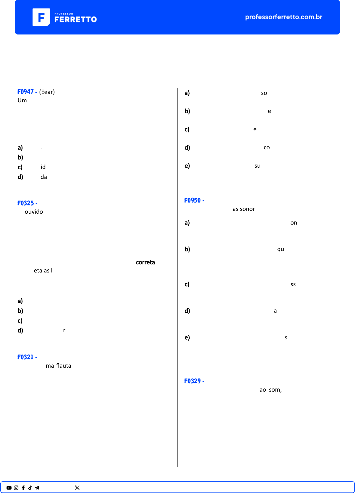 <p>Ondulatória</p><p>Propriedades Fisiológicas do Som</p><p>F0947 - (Eear)</p><p>Um professor de música esbraveja com seu discípulo:</p><p>“Você não é capaz de dis�nguir a mesma nota musical</p><p>emi�da por uma viola e por um violino!”.</p><p>A qualidade do som que permite essa dis�nção à que se</p><p>refere o professor é a (o)</p><p>a) altura.</p><p>b) �mbre.</p><p>c) intensidade.</p><p>d) velocidade de propagação.</p><p>F0325 - (Acafe)</p><p>O ouvido humano é o responsável pelo nosso sen�do</p><p>audi�vo. Ele dis�ngue no som três qualidades que são:</p><p>altura, intensidade e �mbre. A altura é a qualidade que</p><p>permite ao mesmo diferenciar sons graves de sons</p><p>agudos, dependendo somente da frequência do som.</p><p>Considerando os conhecimentos sobre ondas sonoras e o</p><p>exposto acima, assinale a alterna�va correta que</p><p>completa as lacunas das frases a seguir.</p><p>Podemos afirmar que o som será mais _______ quanto</p><p>________ for sua frequência.</p><p>a) grave - maior</p><p>b) agudo - menor</p><p>c) agudo - maior</p><p>d) intenso - maior</p><p>F0321 - (Enem)</p><p>Ao ouvir uma flauta e um piano emi�ndo a mesma nota</p><p>musical, consegue-se diferenciar esses instrumentos um</p><p>do outro.</p><p>Essa diferenciação se deve principalmente ao(a)</p><p>a) intensidade sonora do som de cada instrumento</p><p>musical.</p><p>b) potência sonora do som emi�do pelos diferentes</p><p>instrumentos musicais.</p><p>c) diferente velocidade de propagação do som emi�do</p><p>por cada instrumento musical.</p><p>d) �mbre do som, que faz com que os formatos das</p><p>ondas de cada instrumento sejam diferentes.</p><p>e) altura do som, que possui diferentes frequências para</p><p>diferentes instrumentos musicais.</p><p>F0950 - (Pucrs)</p><p>Em relação às ondas sonoras, é correto afirmar:</p><p>a) O fato de uma pessoa ouvir a conversa de seus</p><p>vizinhos de apartamento através da parede da sala é</p><p>um exemplo de reflexão de ondas sonoras.</p><p>b) A qualidade fisiológica do som que permite dis�nguir</p><p>entre um piano e um violino, tocando a mesma nota, é</p><p>chamada de �mbre e está relacionada com a forma da</p><p>onda.</p><p>c) Denominam-se infrassom e ultrassom as ondas</p><p>sonoras cujas frequências estão compreendidas entre</p><p>a mínima e a máxima percebidas pelo ouvido humano.</p><p>d) A grandeza �sica que diferencia o som agudo, emi�do</p><p>por uma flauta, do som grave, emi�do por uma tuba,</p><p>é a amplitude da onda.</p><p>e) A propriedade das ondas sonoras que permite aos</p><p>morcegos localizar obstáculos e suas presas é</p><p>denominada refração.</p><p>F0329 - (Ufscar)</p><p>Sabemos que, em relação ao som, quando se fala em</p><p>altura, o som pode ser agudo ou grave, conforme a sua</p><p>frequência. Portanto, é certo afirmar que:</p><p>1@professorferretto @prof_ferretto</p><p>a) o que determina a altura e a frequência do som é a</p><p>sua amplitude.</p><p>b) quanto maior a frequência da fonte geradora, mais</p><p>agudo é o som.</p><p>c) o som é mais grave de acordo com a intensidade ou</p><p>nível sonoros emi�dos.</p><p>d) sons mais agudos possuem menor velocidade de</p><p>propagação que sons mais graves.</p><p>e) sons graves ou agudos propagam-se com mesma</p><p>velocidade no ar e no vácuo.</p><p>F0326 - (Pucrs)</p><p>Nossos sen�dos percebem de forma dis�nta</p><p>caracterís�cas das ondas sonoras, como: frequência,</p><p>�mbre e amplitude. Observações em laboratório, com</p><p>auxílio de um gerador de áudio, permitem verificar o</p><p>comportamento dessas caracterís�cas em tela de vídeo e</p><p>confrontá-las com nossa percepção. Após atenta</p><p>observação, é correto concluir que as caracterís�cas que</p><p>determinam a altura do som e a sua intensidade são,</p><p>respec�vamente,</p><p>a) frequência e �mbre.</p><p>b) frequência e amplitude.</p><p>c) amplitude e frequência.</p><p>d) amplitude e �mbre.</p><p>e) �mbre e amplitude.</p><p>F0949 - (Eear)</p><p>A qualidade do som que permite dis�nguir um som forte</p><p>de um som fraco, por meio da amplitude de vibração da</p><p>fonte sonora é definida como</p><p>a) �mbre</p><p>b) altura</p><p>c) intensidade</p><p>d) tubo sonoro</p><p>F1393 - (Fer)</p><p>Considere as afirmações a seguir.</p><p>I. O eco é um fenômeno causado pela reflexão do som</p><p>num anteparo.</p><p>II. O som grave é um som de baixa frequência.</p><p>III. Timbre é a qualidade que permite dis�nguir dois sons</p><p>de mesma altura e intensidade emi�dos por fontes</p><p>diferentes.</p><p>São corretas as afirmações.</p><p>a) I, apenas.</p><p>b) I e II, apenas.</p><p>c) I e III, apenas.</p><p>d) II e III, apenas.</p><p>e) I, II e III.</p><p>F0954 - (U�pr)</p><p>Sobre ondas sonoras, considere as seguintes afirmações:</p><p>I - As ondas sonoras são ondas transversais.</p><p>II - A polarização é um fenômeno relacionado com a</p><p>reflexão da onda sonora.</p><p>III - A altura de um som depende da frequência da onda</p><p>sonora.</p><p>Está(ão) correta(s) somente:</p><p>a) I.</p><p>b) II.</p><p>c) III.</p><p>d) I e II.</p><p>e) II e III.</p><p>F0328 - (Ucs)</p><p>Um importante componente para um filme é sua trilha</p><p>sonora. Alguns sons, inclusive, já estão associados a</p><p>certas emoções que se desejam passar ao espectador em</p><p>uma cena. Por exemplo, em filmes de terror e mistério, é</p><p>comum o som de fundo da cena ser mais grave (embora</p><p>haja exceções). Imagine-se uma pessoa cuja percepção</p><p>sonora a permite dis�nguir os sons graves e agudos</p><p>emi�dos por um instrumento musical. Se ela receber do</p><p>mesmo aparelho de som em sequência, e sem que ocorra</p><p>nenhuma mudança no meio de propagação da onda,</p><p>primeiro uma onda sonora que ela classifica como de</p><p>som grave, e depois uma onda sonora que ela classifica</p><p>co