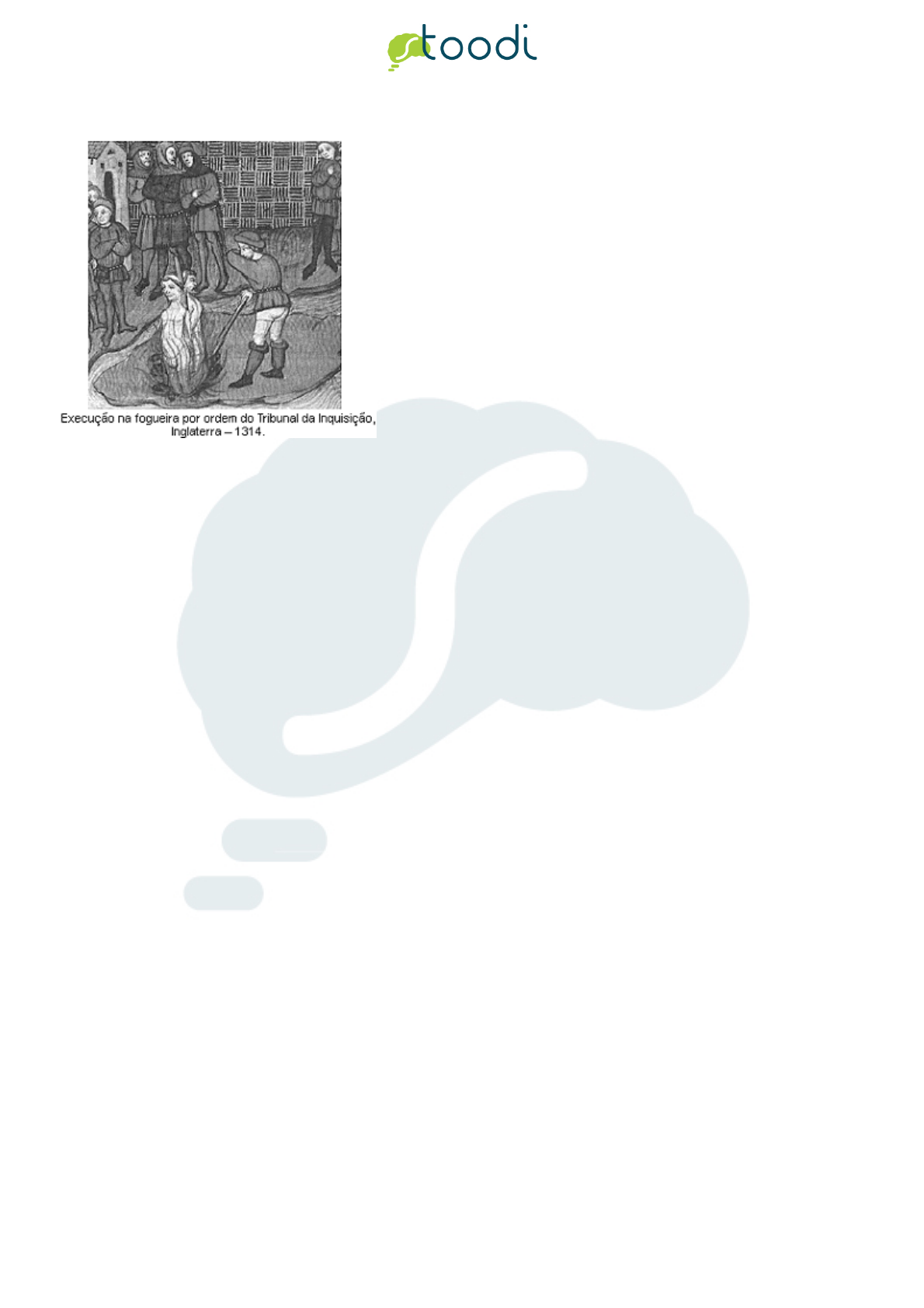 <p>Página 1</p><p>Copyright (c) 2013 - 2018 Stoodi Ensino e Treinamento a Distância LTDA - EPP - Todos os direitos reservados</p><p>1. UFPEL 2007</p><p>"Arrancada a confissão do réu, os inquisidores proferiam a sentença em uma sessão pública denominada sermão geral. As sentenças</p><p>previam três tipos básicos de penas: confiscação de bens, prisão e morte.</p><p>A maioria dos condenados à morte eram queimados vivos numa grande fogueira. Somente a alguns permitia-se o estrangulamento</p><p>antes de serem lançados ao fogo".</p><p>COTRIM, Gilberto. 6a ed. São Paulo: Saraiva, 2001.</p><p>O texto didático faz uma análise das ações do Tribunal da Inquisição, criado pela:</p><p>a. Igreja Anglicana, durante a Reforma Religiosa.</p><p>b. Religião muçulmana, no período das Cruzadas.</p><p>c. França dos Huguenotes, no período da Contra-Reforma.</p><p>d. Reforma Protestante, liderada por Lutero, no fim da Idade Média.</p><p>e. Igreja Católica Romana, durante a Idade Média.</p><p>2. UFSCAR 2008</p><p>"O Quarto Concílio de Latrão, em 1215, decretou medidas contra os senhores seculares caso protegessem heresias em seus</p><p>territórios, ameaçando-os até com a perda dos domínios. Já antes do Concílio e como consequência dele, as autoridades laicas</p><p>decretaram a pena de morte para evitar a disseminação de heresias em seus territórios, a começar por Aragão em 1197, Lombardia</p><p>em 1224, França em 1229, Roma em 1230, Sicília em 1231 e Alemanha em 1232".</p><p>(Nachman FaIbeI. "Heresias medievais", 1976.)</p><p>A respeito das heresias medievais, é correto afirmar que:</p><p>a. o termo heresia designava uma doutrina contrária aos princípios da fé oficialmente declarada pela Igreja Católica.</p><p>b. os heréticos eram filósofos e teólogos que debatiam racionalmente a natureza divina e humana da Trindade no século XlII.</p><p>c. a Igreja tinha atitudes tolerantes com os hereges de origem popular, que propunham uma nova visão ética da instituição</p><p>eclesiástica.</p><p>d. os primeiros heréticos apareceram nos séculos XlI e XIII e defendiam antigas doutrinas difundidas pelo império otomano.</p><p>e. a heresia era conciliável com o poder temporal do Papa, mas provocou a ruptura das relações entre a Igreja e o Estado.</p><p>3. ENEM 2014</p><p>Página 2</p><p>Copyright (c) 2013 - 2018 Stoodi Ensino e Treinamento a Distância LTDA - EPP - Todos os direitos reservados</p><p>Sou uma pobre e velha mulher,</p><p>Muito ignorante, que nem sabe ler.</p><p>Mostraram-me na igreja da minha terra</p><p>Um Paraíso com harpas pintado</p><p>E o Inferno onde fervem almas danadas,</p><p>Um enche-me de júbilo, o outro me aterra.</p><p>VILLON, F. In: GOMBRICH, E. História da arte. Lisboa: LTC, 1999.</p><p>Os versos do poeta francês François Villon fazem referência às imagens presentes nos templos católicos medievais. Nesse contexto,</p><p>as imagens eram usadas com o objetivo de</p><p>a. refinar o gosto dos cristãos.</p><p>b. incorporar ideais heréticos.</p><p>c. educar os fiéis através do olhar.</p><p>d. divulgar a genialidade dos artistas católicos.</p><p>e. valorizar esteticamente os templos religiosos.</p><p>4. MACKENZIE 1996</p><p>Em 1231, o Papa Gregório IX criou os Tribunais da Inquisição, tendo entre outros objetivos impor</p><p>a. o dogma monofisista que prega a ideia da natureza exclusivamente divina de Cristo, negando-lhe a natureza humana.</p><p>b. os pontos fundamentais e indiscutíveis da Igreja Católica, combatendo formas diferentes de interpretação.</p><p>c. a questão iconoclasta, propagando a destruição dos ícones e fortalecendo o poder dos monges.</p><p>d. os dogmas albigenses acerca da existência de um deus do bem, criador da alma e um deus do mal, criado do corpo.</p><p>e. os procedimentos teológicos da Igreja Católica, propagados pelo Bispo Ário, que reafirmam Cristo como um ser desprovido da</p><p>mesma substância do pai.</p><p>5. UFPE 2002</p><p>As transformações econômicas e sociais dos séculos XII e XIII provocaram a chamada "crise de consciência religiosa". Sobre os</p><p>movimentos heréticos surgidos neste período, assinale a alternativa correta.</p><p>a. Na Europa, durante estes séculos, a fé em Deus era um valor inquestionável; portanto, os movimentos heréticos católicos foram</p><p>contra as práticas religiosas desenvolvidas por seitas rurais.</p><p>b. A insatisfação com relação ao comportamento herético dos príncipes católicos, ávidos por mais poder do que o do Papa Bonifácio</p><p>III, fez com que Felipe, o Belo, rei da França, garantisse a cobrança de impostos junto aos príncipes tidos como heréticos.</p><p>c. As ordens mendicantes, consideradas como uma facção religiosa de hereges, foram duramente perseguidas durante o papado de</p><p>Honório III, no século XIII.</p><p>d. Com as invasões de povos germânicos, na Europa, durante a Alta Idade Média, a maioria das bibliotecas foi destruída, restando</p><p>apenas algumas pertencentes à Igreja Católica, que serviram de base para o surgimento dos movimentos heréticos europeus.</p><p>e. As heresias, que provocaram o surgimento de movimentos heréticos, foram doutrinas contrárias aos ensinamentos da Igreja,</p><p>devido à insatisfação em relação ao comportamento do clero.</p><p>6. UFG 2004</p><p>Página 3</p><p>Copyright (c) 2013 - 2018 Stoodi Ensino e Treinamento a Distância LTDA - EPP - Todos os direitos reservados</p><p>I. Só a Igreja romana foi fundada por Deus.</p><p>II. Só o pontífice romano, portanto, tem o direito de ser chamado universal.</p><p>III. Só ele pode nomear e depor bispos. [...]</p><p>VIII. Só ele pode usar a insígnia imperial.</p><p>IX. O papa é o único homem a quem todos os príncipes beijam os pés.</p><p>XII. É-Ihe lícito destituir os imperadores.</p><p>GREGÓRIO VII, Dictatus papae. Apud SOUZA, José Antonio C. R. de; BARBOSA, João Morais. "O reino de Deus e o reino dos</p><