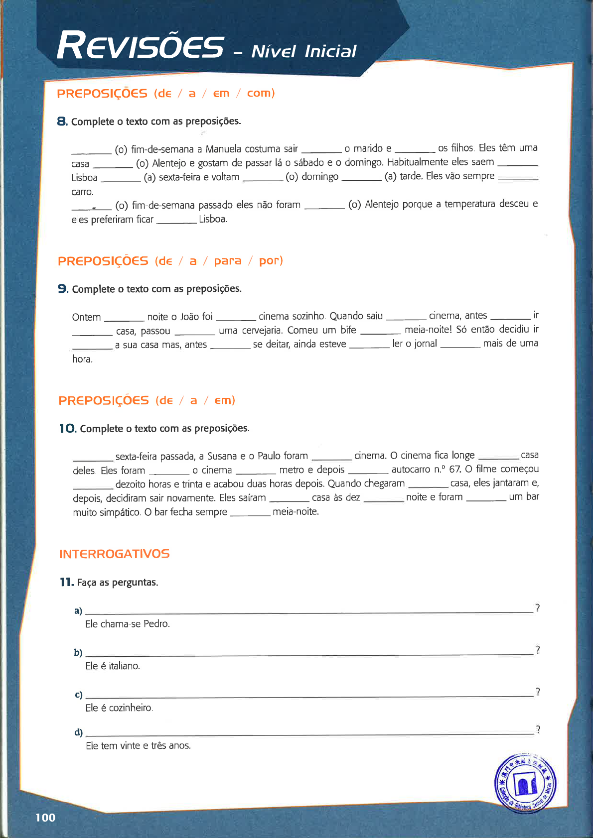 <p>Revsoes Níver tniciat</p><p>r00</p><p>PR€POSIçO€S (de / a / em / com)</p><p>El. Complete o texto com as preposiçöes.</p><p>(o) fim-de-semana a Manuela costuma sair</p><p>-</p><p>o marido e</p><p>-</p><p>os filhos. Eles têm uma</p><p>casa _ (o) Alentejo e gostam de passar lá o sábado e o domingo. Habitualmente eles saem</p><p>-</p><p>Lisboa</p><p>-</p><p>(a) sexta-feira e voltam (o) domingo (a) tarde. Eles vão semPre</p><p>carro.</p><p>-(o)</p><p>fim-de-semana passado eles não foram</p><p>-</p><p>(o) Alentejo porque a temPeratura desceu e</p><p>eles preferiram ficar Lisboa.</p><p>PR€POslçÓ€s @e / a / pana / por)</p><p>9, Complete o texto com as preposições.</p><p>Ontem noite o João foi cinema sozinho. Quando saiu</p><p>-</p><p>cinema, antes</p><p>-</p><p>ir</p><p>casa, passou uma cervejaria. Comeu um bife meia-noite! Só então decidiu ir</p><p>a sua casa mas, antes se deitar, ainda esteve ler o jornal mais de uma</p><p>hora.</p><p>PR€PoS|çÓ€S @e/a/em)</p><p>I O. Complete o texto com as preposições.</p><p>sexta-feira passada, a Susana e o Paulo foram cinema. O cinema fica longe casa</p><p>deles. Eles foram _ o cinema metro e depois autocarro nP 67. O filme começou</p><p>dezoito horas e trinta e acabou duas horas depois. Quando chegaram casa, eles jantaram e,</p><p>depois, decidiram sair novamente. Eles saíram casa às dez noite e foram</p><p>-</p><p>um bar</p><p>muito simpático. O bar fecha semPre meia-noite.</p><p>INT€RROGATIVOS</p><p>ll. raça as perguntas.</p><p>Ele chama-se Pedro.</p><p>a)</p><p>b)</p><p>Ele é italiano.</p><p>c)</p><p>Ele é cozinheiro.</p><p>d)</p><p>Ele tem vinte e três anos.</p><p>e)</p><p>Ele é solteiro.</p><p>f)</p><p>Ele é de Roma.</p><p>e)</p><p>Ele mora em Lisboa, na Rua do Sol, n.o 3.</p><p>h)</p><p>O apartamento dele fica no centro de Lisboa.</p><p>O apartamento é confortável, mas antigo.</p><p>j)</p><p>Ele deita-se às onze e meia.</p><p>PO55e55|VOS</p><p>I ?. Complete as frases com os possessivos.</p><p>a) A Ana tem um carro. O carro é dela.</p><p>b) Tu tens umas canetas. As canetas</p><p>c) O Paulo e a Joana têm uma casa. A casa</p><p>d) Eu tenho duas malas.</p><p>e) Você tem os livros.</p><p>f) Ele tem uma pasta e um caderno.</p><p>g Nós temos umas canetas novas. As canetas são</p><p>h) Vocês têm um dicionário.</p><p>13, Complete o diálogo com os possesstvos.</p><p>A Paula e a irmã vão a uma festa e estão a vestir-se no quarto delas.</p><p>Paula: Ana, onde estão os (eu) sapatos? Não os encontro.</p><p>lrmã:Os (tu) sapatos estão debaixo da cama.</p><p>Paula: E a (eu) saia nova? Não está no armário.</p><p>lrmã: Que chatalA (tu) saia está em cima da cadeira. Não vês?</p><p>Paula: Ana, onde é que a mãe tem a maquilhagem (ela)? Eu quero pintar-me.</p><p>lrmã: Não sei. Tu já sabes que a mãe fica furiosa quando mexes nas coisas</p><p>Paula: Achas que a festa do Pedro e da Catarina vai ser gira?</p><p>(ela)</p><p>lrmã: Sim. Acho que a festa (eles) vai ser giríssima.</p><p>ñ</p><p>:Y-g</p><p>nJ</p><p>z</p><p>I</p><p>uì</p><p>u,</p><p>rQ</p><p>.9</p><p>u,</p><p>É.</p><p>Rgvsoes Níver tniciat</p><p>t02</p><p>D€MONSTRATIVOS</p><p>14. Responda às perguntas</p><p>(tNVARrAVetS)</p><p>com os demonstrativos (invariáveis).</p><p>a) O que é isto aqui? (canetas)</p><p>b) O que é isso a? (caderno)</p><p>c) O que é aquilo ali? (livros)</p><p>d) O que é isso afl (lápis)</p><p>e) O que é isto aqui? (ganafa de água)</p><p>D€MONSTRATTVOS (VARTAV€t5)</p><p>15. Complete o diálogo com os demonstrativos (variáveís).</p><p>O Pedro e o Rui encontram-se na escola por acaso e o Rui apresenta a namorada ao amigo.</p><p>Rui: Olá, Pedro. Como estás? Tudo bem?</p><p>Pedro: Olá. Viva. Tudo bem.</p><p>Rui: Pedro, é a minha namorada, a Susana.</p><p>Pedro: Olá, Susana. Eu sou o Pedro.</p><p>Susana: Muito prazeç Pedro. Também estudas (em + esta) escola?</p><p>Rui: Sim. Vou estudar aqui ano, pela primeira vez.</p><p>Pedro: Bom... Temos de ir. A aula vai começar. Até logo, Rui.</p><p>Rui: Até logo.</p><p>16. Complete as frases com os demonstrativos variáveis ou invariáveis.</p><p>a)</p><p>b)</p><p>c)</p><p>d)</p><p>e)</p><p>f)</p><p>Oqueé</p><p>caneta aqui é nova, mas</p><p>ali? -</p><p>ali é mais velha.</p><p>são os meus cadernos novos.</p><p>museu fica ao lado do jardim.</p><p>carro aí é do meu pai.</p><p>casacos aqui são dos nossos amigos.</p><p>ali é um museu.</p><p>pessoas aqui estão na fila para o cinema.</p><p>PR€S€NT€ DO INDICATIVO</p><p>17. faça frases com os verbos na forma correcta.</p><p>ser / estar / ter / haver / estudar / falar / trabalhar / morar / jogar / comprar</p><p>a) Eles portugueses.</p><p>b) A Joana de Lisboa.</p><p>c) Ele vinte e dois anos.</p><p>doente.</p><p>muitos alunos.</p><p>d) Eu</p><p>e) Na sala</p><p>f) Tu</p><p>g Ela</p><p>j¡ Vocês</p><p>l) Os alunos chineses</p><p>em Lisboa ou no Porto?</p><p>futebol com o amigo.</p><p>um dicionário.</p><p>um café e um bolo.</p><p>nos Correios.</p><p>português.</p><p>h) Eu</p><p>I Ele</p><p>18. Complete o texto com os verbos.</p><p>Maria, em Lisboa.</p><p>(estar) em Lisboa. No Alentejo não</p><p>-</p><p>(haver) Faculdade de Medicina.</p><p>amrSos.</p><p>19. Complete o texto com os verbos.</p><p>O Nuno (ter) vinte e sete anos e (ser) do Porto. Ele (ser) estu-</p><p>dante em Lisboa e (morar) com dois colegas num apaftamento. O apartamento</p><p>(ficar) no centro de Lisboa. O apartamento</p><p>muito arrumado.</p><p>(ser) pequeno, mas (estar) sempre</p><p>Durante a semana, ele e os colegas nunca (estar) em casa porque não (ter)</p><p>tempo. Eles (almoçar) na cantina ao meio-dia e depois (estudar) na biblioteca</p><p>(comprar) comida.</p><p>da Universidade.</p><p>Antes de voltar para casa, o Nuno (ir) ao supermercado e</p><p>Quando (chegar)acasa,oNuno (fazer) o jantar e (antar) com</p><p>os colegas.</p><p>Depois do jantaç eles</p><p>(ver) televisão.</p><p>O Nuno</p><p>(arrumar) a cozinha, (tomar) um c