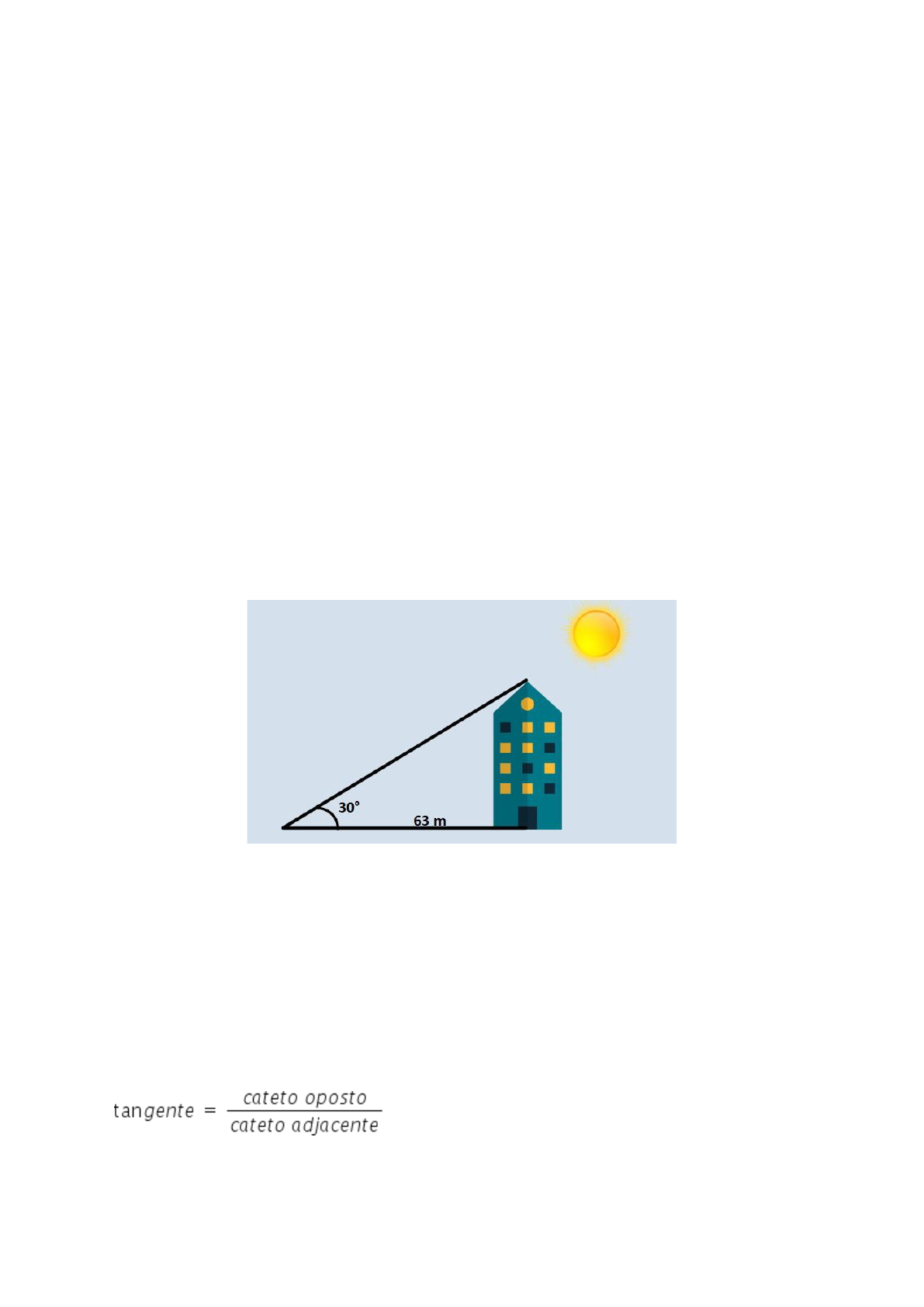 <p>Exercícios de trigonometria no triângulo</p><p>retângulo</p><p>A trigonometria é um importante tema na Matemática que possibilita</p><p>conhecer lados e ângulos em um triângulo retângulo, através do seno,</p><p>cosseno e tangente, além de outras funções trigonométricas.</p><p>Exercício 1</p><p>Observando pela manhã a sombra de um prédio no chão, uma pessoa</p><p>verificou que essa media 63 metros quando os raios de Sol faziam um ângulo</p><p>de 30° com a superfície. Baseado nessas informações, calcule a altura do</p><p>prédio.</p><p>Resposta correta: Aproximadamente 36,37 m.</p><p>O prédio, a sombra e o raio de Sol, determinam um triângulo retângulo.</p><p>Utilizando o ângulo de 30° e a tangente, podemos determinar a altura do</p><p>prédio.</p><p>Sendo h a altura do prédio, temos:</p><p>Exercício 2</p><p>Em uma circunferência de diâmetro igual a 3, um segmento AC, chamado de</p><p>corda, forma um ângulo de 90° com outra corda CB, de mesmo comprimento.</p><p>Qual é a medida das cordas?</p><p>Resposta correta: O comprimento da corda é 2,12 cm.</p><p>Como os segmentos AC e CB formam um ângulo de 90° e possuem o mesmo</p><p>comprimento, o triângulo formado é isósceles e os ângulos da base são</p><p>iguais.</p><p>Como a soma dos ângulos internos de um triângulo é igual a 180º e, já temos</p><p>um ângulo de 90°, sobram outros 90° para serem divididos igualmente entre</p><p>os dois ângulos da base. Assim, o valor desses é igual 45º cada.</p><p>Sendo o diâmetro igual a 3 cm, o raio vale 1,5 cm e podemos utilizar o</p><p>cosseno de 45° para determinar o comprimento da corda.</p><p>Exercício 3</p><p>Uma ciclista participando de um campeonato se aproxima da linha de</p><p>chegada que se encontra no alto de uma ladeira. O comprimento total dessa</p><p>última parte da prova é de 60 m e o ângulo formado entre a rampa e a</p><p>horizontal é de 30°. Sabendo disso, calcule a altura vertical que a ciclista</p><p>precisa subir.</p><p>Resposta correta: A altura será de 30 m.</p><p>Chamando a altura de h, temos:</p><p>Exercício 4</p><p>A seguinte figura é formada por três triângulos onde a altura h determina dois</p><p>ângulos retos. Os valores dos elementos são:</p><p>α = 30°</p><p>β = 60°</p><p>h = 21</p><p>Determine o valor de a+b.</p><p>Resposta correta:</p><p>Podemos determinar as medidas dos segmentos a e b, utilizando as</p><p>tangentes dos ângulos fornecidos.</p><p>Cálculo de a:</p><p>Cálculo de b:</p><p>Assim,</p><p>Exercício 5</p><p>Um avião decolou da cidade A e voou 50 km em linha reta até pousar na</p><p>cidade B. Após, voou mais 40 km, dessa vez indo na direção da cidade D.</p><p>Essas duas rotas fazem um ângulo de 90° entre si. No entanto, devido às</p><p>condições climáticas desfavoráveis, o piloto recebeu um comunicado da torre</p><p>de comando informando que não poderia pousar na cidade D e, que deveria</p><p>voltar para a cidade A.</p><p>Para que fizesse o retorno a partir do ponto C, o piloto deveria fazer uma</p><p>curva de quantos graus à direita?</p><p>Considere:</p><p>sen 51° = 0,77</p><p>cos 51° = 0,63</p><p>tan 51° = 1,25</p><p>Resposta correta: O piloto deve realizar uma curva de 129° à direita.</p><p>Analisando a figura vemos que o trajeto forma um triângulo retângulo.</p><p>Vamos chamar o ângulo que estamos procurando de W. Os ângulos W e Z</p><p>são suplementares, ou seja, formam um ângulo raso, de 180°.</p><p>Assim, W + Z = 180°.</p><p>W = 180 - Z (equação 1)</p><p>Nossa tarefa agora é determinar o ângulo Z e, para isso, vamos utilizar a sua</p><p>tangente.</p><p>Devemos nos perguntar: Qual é o ângulo cuja tangente é 1,25?</p><p>O problema nos fornece esse dado, tan 51° = 1,25.</p><p>Esse valor também pode ser encontrado em uma tabela trigonométrica ou</p><p>com uma calculadora científica, utilizando a função:</p><p>Substituindo o valor de Z na equação 1, temos:</p><p>W = 180° - 51° = 129°</p><p>Exercício 6</p><p>Um raio de luz monocromática ao passar de um meio para outro, sofre um</p><p>desvio em sua direção. Essa mudança na sua propagação está relacionada</p><p>aos índices de refração dos meios, conforme a seguinte relação:</p><p>Lei de Snell - Descartes</p><p>Sendo i e r os ângulos de incidência e refração e, n1 e n2, os índices de</p><p>refração dos meios 1 e 2.</p><p>Ao incidir na superfície de separação entre o ar e o vidro, um raio de luz altera</p><p>sua direção, como mostra a figura. Qual o índice de refração do vidro?</p><p>Dado: Índice de refração do ar igual a 1.</p><p>Resposta correta: O índice de refração do vidro é igual a .</p><p>Substituindo os valores temos:</p><p>Exercício 7</p><p>Para arrastar uma tora de madeira até sua oficina, um serralheiro amarrou</p><p>uma corda a tora e a puxou por três metros através de uma superfície</p><p>horizontal. Uma força de 40 N através da corda fez um ângulo de 45° com o</p><p>sentido do deslocamento. Calcule o trabalho da força aplicada.</p><p>Resposta correta: O trabalho realizado é de, aproximadamente, 84,85 J.</p><p>O trabalho é uma grandeza escalar obtida pelo produto entre a força e o</p><p>deslocamento. Se a força não possui a mesma direção do deslocamento,</p><p>devemos decompor está força e considerar apenas a componente nesta</p><p>direção.</p><p>Nesse caso, devemos multiplicar o módulo da força pelo cosseno do ângulo.</p><p>Assim temos:</p>