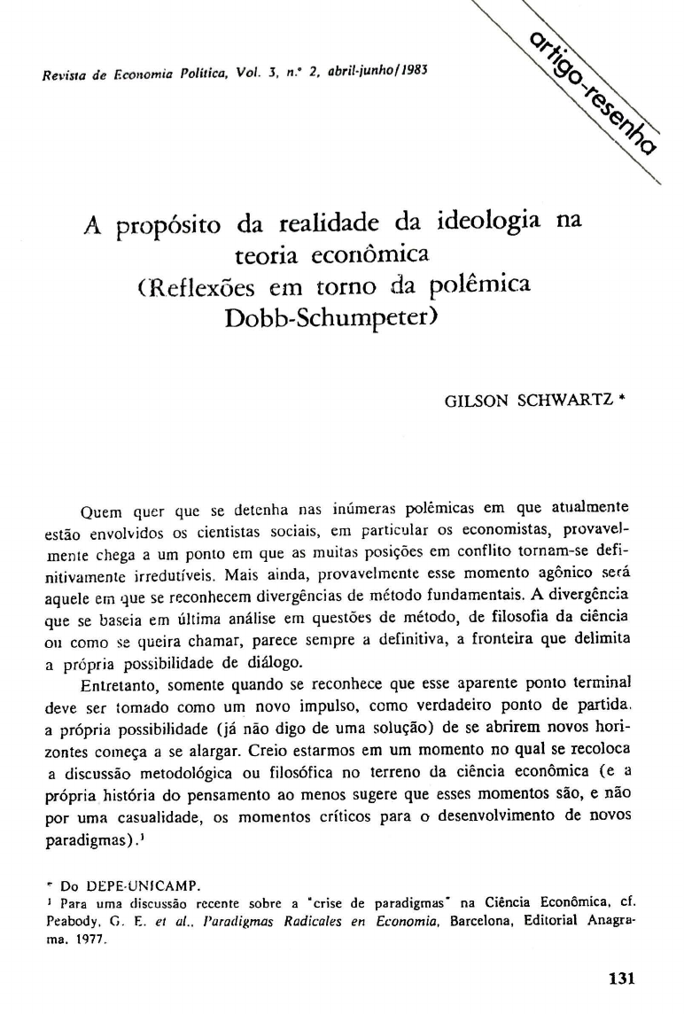 <p>Revis1a de fco11om ia Polí1ica, Vol. J , n.• 2, abril-junho/ 1983</p><p>A propósjto da realidade da ideologia na</p><p>teoria econômica</p><p>(Reflexões em torno da polêmica</p><p>Dobb-Schumpeter)</p><p>GILSON SCHWARTZ *</p><p>Quem quer que se detenha nas inúmeras polêmicas em que atualmente</p><p>estão envolvidos os cientistas sociais, em particular os economistas, provavel-</p><p>mente chega a um ponto em que as muitas posições em conflito tornam-se defi-</p><p>nitivamente irredutíveis . Mais ainda, provavelmente esse momento agônico se(á</p><p>aquele em que se reconhecem divergências de método fundamentais. A divergência</p><p>que se baseia em última análise em questões de método, de filosofia da ciência</p><p>ou como se queira chamar, parece sempre a definitiva, a fronteira que delimita</p><p>a própria possibilidade de diálogo.</p><p>Entretanto, somente quando se reconhece que esse aparente ponto terminal</p><p>deve ser tomado como um novo impulso, como verdadeiro ponto de partida.</p><p>a própria possibilidade (já não digo de uma solução) de se abrirem novos hori-</p><p>zontes começa a se alargar. Creio estarmos em um momento no qual se recoloca</p><p>a discussão metodológica ou filosófica no terreno da ciência econômica ( e a</p><p>própria história do pensamento ao menos sugere que esses momentos são, e não</p><p>por uma casualidade, os momentos críticos para o desenvolvimento de novos</p><p>paradigmas) .1</p><p>• Do DEPE-UNICAMP.</p><p>1 Para uma discussão recente sobre a "crise de paradigmas· na Ciência Econômica, cf.</p><p>Peabody. G. E. et ai .. l'aradigmas Radicales en Economia, Barcelona. Editorial Anagra-</p><p>ma . 1977 .</p><p>131</p><p>Pretendo examinar a seguir, partindo de algumas considerações gerais em</p><p>tomo dessas preocupações ditas metodológicas, o modo como elas podem ser</p><p>postas no terreno da teoria econômica, pelo exame de uma polêmica exemplar</p><p>que Dobb pretende entreter com Schumpeter.2</p><p>E fato notável que a ciência tenha se tornado, principalmente a partir do</p><p>século passado, um universo identificável de "sabores" especializados, · autóno-</p><p>mos (quando não compartimentados) e patrocinados por instituições distintas,</p><p>não escapando a uma divisão operacional do trabalho intelectual que paga tri-</p><p>butos à produtividade.</p><p>Por razões diversas, o caráter instrumental das ciências foi sendo conti-</p><p>nuadamente reposto como o próprio critério e condição de cientificidade, nessa</p><p>medida teorizado e tomado como inspiração para algumas tradições filosóficas</p><p>contemporâneas.</p><p>Mas deveria o desenvolvimento organizado e organizativo da ciência no</p><p>capitalismo servir de tema para mais uma especialização, a sociologia da ciência?</p><p>Ou será que essa referência crítica aos contextos sociais e históricos pode inau-</p><p>gurar de alguma forma e internamente às diversas disciplinas essa discussão</p><p>metodológica a que aludimos, superando a compartimentação excessiva?</p><p>E a partir de uma tal perspectiva inicial que algumas distinções como "in-</p><p>terno" ou "externo" à teoria, "análise conceitual'' ou "condicionamento social",</p><p>" juízo positivo" ou " normativo", "lógico" ou "histórico" precisam ser repensadas.ª</p><p>Está em jogo, nesse momento, a própria definição de ciência, essa criação</p><p>humana plantada sobre o solo da linguagem. E aí começam as grandes dificul-</p><p>dades. "Onde quer que a relevância da linguagem esteja em risco, as questões</p><p>tornam-se políticas por definição, pois é a linguagem o que toma o homem um</p><p>ser político. " 4</p><p>Que os problemas nesse momento relacionados à linguagem c1entüica ultra-</p><p>passem em muito as dificuldades de o rdem sintática é também o ponto de</p><p>partida para a discussão que se segue.</p><p>Em suma aqui se pergunta acerca de conceitos, teorias, explicações, predi-</p><p>ções associados à produção científica. T arefa clássica da filosofia da ciência,</p><p>o que tem ela a nos dizer?</p><p>2 Dobb, M. Teorias do Valor e Distribuição desde Adam Smith, cap. I: "Introdução: A</p><p>Propósito de Ideologia·, Ed. Presença-Martins Fontes, Lisboa, s.d.; Schumpeter, J. A.,</p><p>History o/ Economic Analysis, Part 1: "Scope and Method", Nova Iorque, Oxford Univer-</p><p>sity Press, 1961. Trato aqui apenas de comentar criticamente esses textos, sem me preocu-</p><p>par em reproduzir extensivamente suas idéias, aliás suficientemente divulgadas entre os</p><p>economistas.</p><p>:-: Cf. Agassi, J., Externalism, UNICAMP-CLE, manuscrito, vol. II, n.º 1, 1978; também</p><p>a polêmica de fundo para esse artigo entre Thomas Kuhn e lmre Lakatos in Boston Studies</p><p>in the Philosophy o/ Science, vol. VIII.</p><p>4 Arendt, H., The Human Condition, Prólogo, p. 3, University of Chicago Press, 1958.</p><p>132</p><p>Na prática, consoante as indicações do modelo fisicalista, a superestimação</p><p>do dado empírico leva a classificar tudo que esteja além do instrumentalizável</p><p>no campo da cláusula ceteris paribus. A filosofia, nesse sentido, é acessória à</p><p>ciência (natural ou social). Acessória mas condicionando ( uma vez que se</p><p>estabelece um paradigma) o próprio trabalho de pesquisa, introduzindo regula-</p><p>mentações que acabam por distinguir pensamento de vida social (ao classificar</p><p>juízos de valor, evitar discussões históricas, ignorando a dimensão política da</p><p>produção científica etc.).</p><p>Como são formuladas e introduzidas essas distinções e regulamentações?</p><p>Mais precisamente nas ciências humanas, na teoria econômica? Além das dis-</p><p>cussões gerais em torno da filosofia da ciência ( como por exemplo aquelas cata-</p><p>lizadas pela tradição empirista-lógica), de que forma todas essas preocupações</p><p>se efetivam no terre