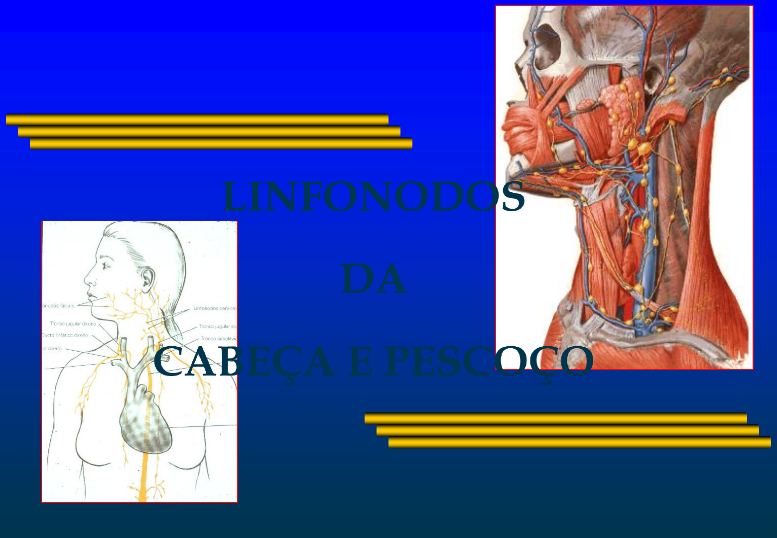 <p>LINFONODOS</p><p>DA</p><p>CABEÇA E PESCOÇO</p><p>Linfonodos</p><p>Regionais da Cabeça</p><p>•Occiptal</p><p>•Retroauricular</p><p>•Auricular anterior</p><p>•Parotídico</p><p>Superficial</p><p>•Faciais</p><p>SOBOTTA-2000</p><p>Linfonodo Occipital</p><p>• Localização: base posterior da cabeça (bilateralmente).</p><p>• Drenagem: couro cabeludo da região occipital.</p><p>• Destino: linfonodos cervicais profundos.</p><p>Linfonodos Retroauricular, Auricular</p><p>Anterior, Parotídico Superficial</p><p>Drenagem: orelha</p><p>externa e regiões</p><p>adjacentes do couro</p><p>cabeludo e face.</p><p>Destino: Linfonodos</p><p>cervicais profundo.</p><p>Linfonodos Faciais</p><p>•Localização: ao longo da</p><p>veia facial.</p><p>•Drenagem: pele e mucosa</p><p>onde os linfonodos estão</p><p>localizados.</p><p>•Destino: linfonodos</p><p>submandibulares.</p><p>Linfonodos Regionais</p><p>do Pescoço</p><p>Superficiais:</p><p>Submental</p><p>Submandibular</p><p>Cervicais Profundos:</p><p>Anterior</p><p>Inferior</p><p>Linfonodos Submentuais</p><p>Localização</p><p>Drenagem: mento e lábio</p><p>inferior, soalho da boca,</p><p>ponta da língua e</p><p>incisivos inferiores com</p><p>seus tecidos de suporte.</p><p>Destino: linfonodos</p><p>submandibulares.</p><p>Linfonodos Submandibulares</p><p>• Localização</p><p>• Drenagem: bochecha, lábio superior, corpo da língua, porção</p><p>anterior do palato duro, dentes e seus tecidos de suporte (exceto</p><p>incisivo inferior e 3.o molar).</p><p>• Destino: linfonodos cervicais profundo.</p><p>Linfonodos Cervicais Profundos Anteriores</p><p>Localização: ao longo da v. jugular interna, profundamente ao m. esternocleidomastóideo</p><p>Drenagem: porção posterior da cavidade nasal, porção posterior do palato duro,</p><p>palato mole, base da língua, 3o molar e seus tecidos de suporte.</p><p>Destino: linfonodos cervicais profundos inferiores.</p><p>Linfonodos Cervicais Profundos Inferiores</p><p>• Localização: posterior e profundamente ao músculo</p><p>esternocleidomastóideo</p><p>• Drenagem: posterior do couro cabeludo e pescoço,</p><p>peitoral superficial e porção do braço.</p><p>• Destino: tronco jugular.</p><p>Através dos linfonodos</p><p>enfartados será possível</p><p>distinguir a lesão por</p><p>câncer de uma infecção.</p>
