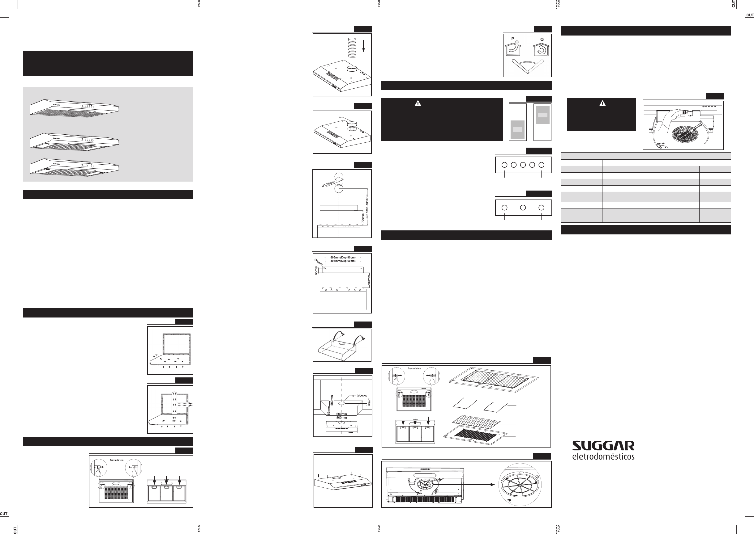 <p>Manual de Instruções</p><p>Termo de Garantia</p><p>SUGGAR da SUGGAR</p><p>O depurador mais vendido do país.</p><p>Modelo Slim</p><p>ELIMINA FUMAÇA, GORDURA E CHEIROS FORTES NA SUA COZINHA</p><p>RECOMENDAÇÕES IMPORTANTES DE SEGURANÇA</p><p>- Este aparelho não se destina à utilização por pessoas (inclusive crianças) com</p><p>capacidades físicas, sensoriais ou mentais reduzidas, ou por pessoas com falta de</p><p>experiência e conhecimento, a menos que tenham recebido instruções referentes à</p><p>utilização do aparelho ou estejam sob a supervisão de uma pessoa responsável pela</p><p>sua segurança.</p><p>- Existe risco de incêndio se a limpeza não for realizada de acordo com as instruções.</p><p>- Recomenda-se que as crianças sejam vigiadas para assegurar que elas não</p><p>estejam brincando com o aparelho.</p><p>- Antes de ligar o seu SUGGAR, verifique se a tensão da rede é a mesma do</p><p>aparelho (127V ou 220V).</p><p>- Nunca utilize extensões ou benjamim.</p><p>- Certifique-se de que a tomada elétrica esteja em boa condições de uso.</p><p>- Se o cordão de alimentação está danificado, ele deve ser substituído pelo</p><p>fabricante ou agente autorizado ou pessoa qualificada, a fim de evitar riscos;</p><p>- Nunca flambe alimentos sobre o fogão, com o depurador ligado;</p><p>- No preparo de frituras, esteja sempre alerta, pois o óleo, altamente inflamável,</p><p>pode provocar chamas na manta filtrante do depurador;</p><p>- Deverá haver uma ventilação adequada do ambiente, quando o exaustor</p><p>for utilizado ao mesmo tempo em que os fogões que consomem gás ou outros</p><p>combustíveis.</p><p>- O ar aspirado pelo depurador não deverá ser descarregado em um duto utilizado na</p><p>exaustão de vapores gerados por aparelhos que consomem gás ou outros combustíveis.</p><p>- Não flambar alimentos embaixo do depurador;</p><p>- Atenção: As partes acessíveis podem ficar quentes quando usado com os</p><p>aparelhos de cozinhar.</p><p>DESCRIÇÃO</p><p>O aparelho pode ser instalado no modo depurador ou</p><p>exaustor para os modelos LLDI61/62BR, LLDI61/62PT,</p><p>LLDI61/62IX, LLDI61/62PR, LLDI61/62VM, LLDI81/82BR,</p><p>LLDI81/82PT, LLDI81/82IX, LLDI81/82PR, LLDI81/82VM;</p><p>e no modo depurador para os modelos LLDI60BIBR,</p><p>LLDI80BIBR, LLDI601/602BR, LLDI801/802BR.</p><p>Modo Depurador (Fig. 1): o aparelho aspira o ar</p><p>impregnado de fumaça e cheiros da cozinha, depurando-o</p><p>através dos filtros anti-gordura e carvão ativado, e depois</p><p>reintroduz o ar purificado no ambiente. Para que a sua</p><p>eficiência seja constante, é necessário substituir o filtro de</p><p>carvão periodicamente.</p><p>Modo Exaustor (Fig. 2): o aparelho aspira o ar</p><p>impregnado de fumaça e cheiros da cozinha, fazendo-o</p><p>passar através do filtro anti-gordura, e depois expele-o para</p><p>o exterior através de um duto de descarga. Nesta versão não</p><p>é necessário utilizar o filtro de carvão.</p><p>Decidir, inicialmente, o tipo de instalação desejada:</p><p>depurador ou exaustor, de acordo com o modelo adquirido.</p><p>Fig. 1</p><p>Fig. 2</p><p>INSTALAÇÃO</p><p>Fig. 3</p><p>Fig. 11Aconselhamos:</p><p>1. Para os modelos no modo depurador ou exaustor,</p><p>verificar se a alavanca Depurador/Exaustor está correta: a</p><p>referida alavanca está situada no grupo motor e, em caso</p><p>de instalação na versão exaustor, deverá ser colocada em</p><p>cima do símbolo (E) (Fig. 11).</p><p>2. Lembrar-se também que, na versão Exaustor,</p><p>não é necessário usar filtro de carvão. Neste caso siga a</p><p>instrução de manutenção dos filtros da seção (LIMPEZA E</p><p>MANUTENÇÃO - Fig.14).</p><p>FUNCIONAMENTO</p><p>O produto Suggar adquirido no estado de conservação que se encontra</p><p>não tem direito a troca. O mesmo pode apresentar avarias, amassados,</p><p>riscos, sujeira, ausência de embalagem, de manual e de alguns acessórios,</p><p>componentes e/ou peças. Este produto terá apenas a garantia de 90 dias para</p><p>peças funcionais.</p><p>TERMO DE GARANTIA</p><p>REV.01/19</p><p>RAZÃO SOCIAL:</p><p>Madson Eletrometalúrgica Ltda.</p><p>Belo Horizonte/MG</p><p>Rua Jerônimo Marcucci, 74</p><p>Bairro Olhos D´água</p><p>CEP: 30390-150</p><p>www.suggar.com.br</p><p>CENTRAL DE RELACIONAMENTO</p><p>0800 200 5050</p><p>INOX - LLDI61IX/LLDI62IX</p><p>BRANCO - LLDI61BR/LLDI62BR</p><p>PRETO - LLDI61PT/LLDI62PT</p><p>PRATA - LLDI61PR/LLDI62PR</p><p>VERMELHO - LLDI61VM/LLDI62VM</p><p>FILTRO DE CARVÃO</p><p>ATIVADO</p><p>DEPURADORES 60cm BIVOLT</p><p>BRANCO - LLDI60BIBR</p><p>DEPURADORES 80cm BIVOLT</p><p>BRANCO - LLDI80BIBR</p><p>INOX - LLDI81IX/LLDI82IX</p><p>BRANCO - LLDI81BR/LLDI82BR</p><p>PRETO - LLDI81PT/LLDI82PT</p><p>PRATA - LLDI81PR/LLDI82PR</p><p>VERMELHO - LLDI81VM/LLDI82VM</p><p>O depurador Slim funciona com 1 lâmpada incandescente soquete (rosca) E14 de 15W</p><p>para os depuradores de 3 velocidades e 1 lâmpada incandescente soquete (rosca) E14 de</p><p>40W para depuradores de 1 velocidade.</p><p>ADVERTÊNCIA: Desligue sempre a alimentação elétrica, antes de realizar qualquer tipo</p><p>de manutenção no aparelho. Cuidado ao manusear a lâmpada se ela estiver quente.</p><p>Para trocar as lâmpadas:</p><p>1. Retire os filtros e a tela metálica cofnorme instrução anterior.</p><p>2. Retire a lâmpada com as mãos.</p><p>3. Instale uma lâmpada nova do tipo E14 de 15W (modelos de 3 velocidades) ou do tipo</p><p>E14 de 40W (modelo de 1 velocidade) de mesma tensão de sua residência. Não toque na</p><p>lâmpada com as mãos desprotegidas!</p><p>CARACTERÍSTICAS TÉCNICAS</p><p>MODELO SLIM 3 VELOCIDADES SLIM 1 VELOCIDADE</p><p>TAMANHO 60cm 80cm 60cm 80cm</p><p>TENSÃO (V) 127 220 127 220 BIVOLT BIVOLT</p><p>POTÊNCIA (W) 105 105 105 105 105 105</p><p>CONSUMO (kWh) 0,11 0,11 0,11 0,11 0,11 0,11</p><p>PESO</p><p>S/ EMBALAGEM (kg) 4,6 5,1 4,6 5,1</p><p>FREQÜÊNCIA (Hz) 60 60 60 60</p><p>PRODUTO</p><