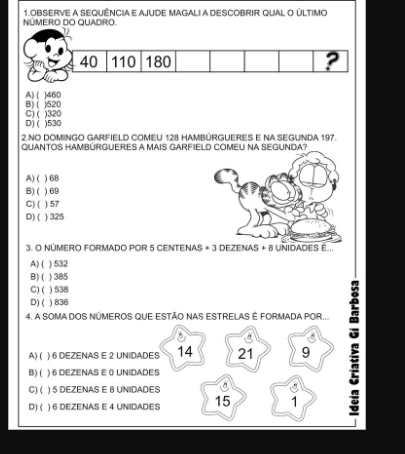A SEQUÊNCIA E AJUDE MAGALI A DESCOBRIR QUAL O NÚMERO DO QUADRO 40 110 180 ? A) ( ( C) ( D) ( )530 2 NO DOMINGO GARFIELD COMEU 128 HAMBURGUERES E NA SEGUNDA 197 QUANTOS HAMBURGUERES A MAIS GARFIELD COMEU NA SEGUNDA? A) B) 69 C) D) 325 O NÚMERO FORMADO POR 5 CENTENAS + 3 DEZENAS 8 UNIDADES A) 532 B) 385 C) D) 4 A SOMA DOS NÚMEROS QUE ESTÃO NAS ESTRELAS É FORMADA ID A) DEZENAS E 2 UNIDADES 14 21 9 B) 6 DEZENAS E 0 UNIDADES C) 5 DEZENAS E 8 UNIDADES 15 1 D) ( ) 6 DEZENAS E 4 UNIDADES