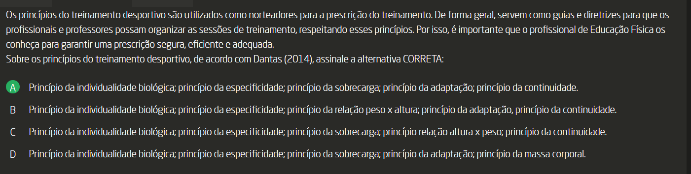 Os princípios do treinamento desportivo são utilizados como norteadores para a prescrição do treinamento. De forma geral, servem como guias e diretrizes para que os profissionais e professores possam organizar as sessões de treinamento, respeitando esses princípios. Por isso, é importante que profissional de Educação Física os conheça para garantir uma prescrição segura, eficiente e Sobre os princípios do treinamento desportivo, de acordo com Dantas (2014), assinale a alternativa CORRETA: A Princípio da individualidade biológica; princípio da especificidade; princípio da sobrecarga; princípio da adaptação; princípio da continuidade. B Princípio da individualidade biológica; princípio da especificidade; princípio da relação peso altura; princípio da adaptação, princípio da continuidade. C Princípio da individualidade biológica; princípio da especificidade; princípio da sobrecarga; princípio relação altura peso; princípio da continuidade. D Princípio da individualidade biológica; princípio da especificidade; princípio da sobrecarga; princípio da adaptação; princípio da massa corporal.
