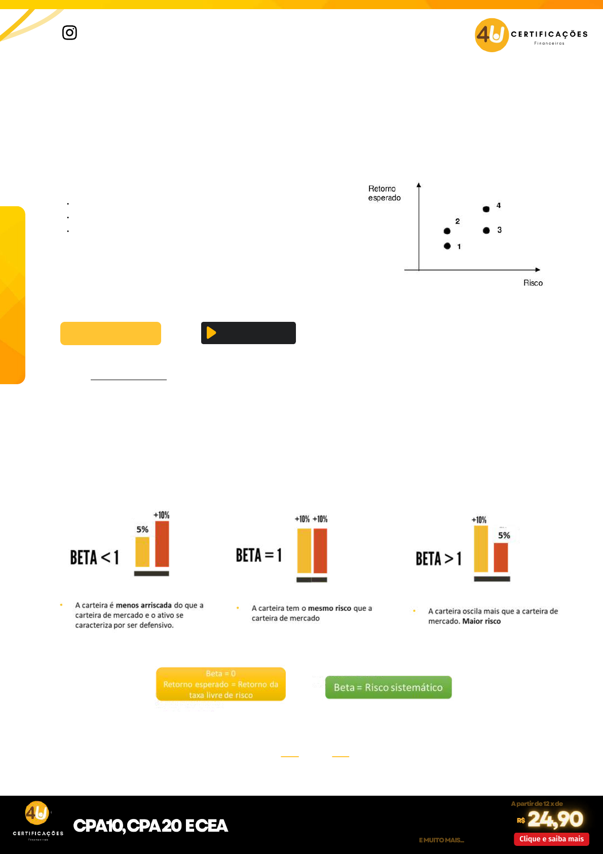 <p>173</p><p>O coeficiente beta vai medir a sensibilidade de um ativo em relação a uma carteira de mercado. Por</p><p>exemplo o índice Bovespa, é também chamado de Índice Beta ou apenas Beta. O Beta é útil para colocar em</p><p>foco o comportamento de um ativo no mercado financeiro, durante um período de tempo, por meio do seu</p><p>nível de risco.</p><p>O beta é utilizado para medir o Risco Sistemático (não diversificável) e serve como comparação de um</p><p>ativo em particular em relação ao mercado como um todo. Para retornos mais próximos do benchmark</p><p>(Carteira de mercado) o investidor deve buscar um beta mais próximo ou igual a 1.</p><p>www.4ucertifica.com.br</p><p>M</p><p>ód</p><p>ul</p><p>o</p><p>7</p><p>-</p><p>C</p><p>PA</p><p>20</p><p>4u.certifica</p><p>O princípio da dominância afirma que o investidor racional prefere o investimento que proporcione o maior</p><p>retorno esperado para o mesmo nível de risco. Ou ainda o menor risco para o mesmo retorno esperado.</p><p>Princío da Dominância</p><p>Com base nesse princípio, na figura acima é possível obter as seguintes</p><p>conclusões:</p><p>o ativo 2 domina o 1;</p><p>o ativo 4 domina o 3;</p><p>o ativo 2 domina o 3;</p><p>Contudo, nada pode-se dizer sobre o ativo 2 e o 4 e nem sobre o 1 e o 3. A</p><p>escolha de um desses ativos dependerá do nível de aversão ao risco do</p><p>investidor.</p><p>Índice Beta</p><p>Quero saber maisQuero saber maisQuero saber mais</p><p>Clique e saiba mais</p><p>R$R$</p><p>CONHEÇA NOSSOS CURSOS</p><p>A partir de 12 x deA partir de 12 x de</p><p>+ Aulas fáceis e didáticas</p><p>+ simulados</p><p>+ 1000 questões comentadas (reais)</p><p>+ Tire dúvidas no privado com O professor</p><p>E MUITO MAIS...E MUITO MAIS...</p><p>+ Plano de Estudos</p><p>+ Mapas Mentais</p><p>+ grupo de estudos</p><p>*VALORES SUJEITOS A ALTERAÇÃO</p><p>Assistir Aula</p><p>Clique acima</p>