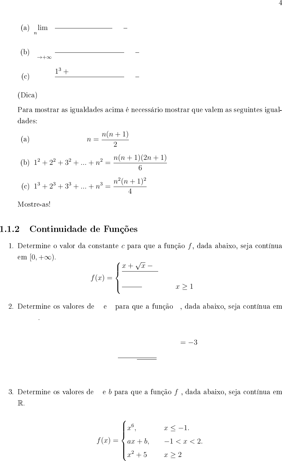 <p>4</p><p>(a) lim</p><p>n→+∞</p><p>1 + 2 + 3 + ...+ n</p><p>n2</p><p>=</p><p>1</p><p>2</p><p>(b) lim</p><p>n→+∞</p><p>12 + 22 + 32 + ...+ n2</p><p>n3</p><p>=</p><p>1</p><p>3</p><p>(c) lim</p><p>n→+∞</p><p>13 + 23 + 33 + ...+ n3</p><p>n4</p><p>=</p><p>1</p><p>4</p><p>(Dica)</p><p>Para mostrar as igualdades acima é necessário mostrar que valem as seguintes igual-</p><p>dades:</p><p>(a) 1 + 2 + 3 + ...+ n =</p><p>n(n+ 1)</p><p>2</p><p>(b) 12 + 22 + 32 + ...+ n2 =</p><p>n(n+ 1)(2n+ 1)</p><p>6</p><p>(c) 13 + 23 + 33 + ...+ n3 =</p><p>n2(n+ 1)2</p><p>4</p><p>Mostre-as!</p><p>1.1.2 Continuidade de Funções</p><p>1. Determine o valor da constante c para que a função f , dada abaixo, seja contínua</p><p>em [0,+∞).</p><p>f(x) =</p><p></p><p>x+</p><p>√</p><p>x− 2</p><p>x− 1</p><p>, 0 ≤ x</p>