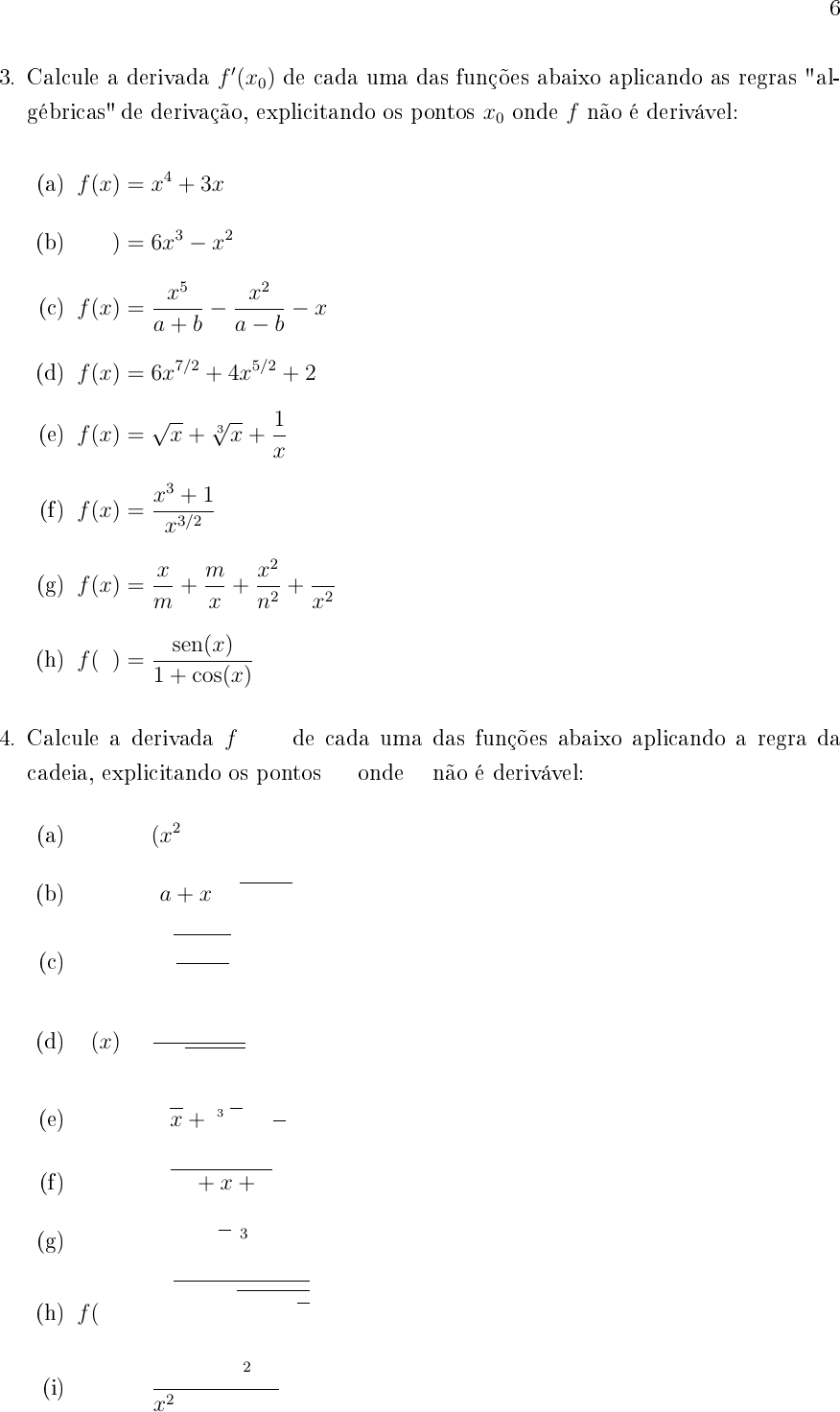 <p>6</p><p>3. Calcule a derivada f ′(x0) de cada uma das funções abaixo aplicando as regras "al-</p><p>gébricas" de derivação, explicitando os pontos x0 onde f não é derivável:</p><p>(a) f(x) = x4 + 3x2 + 6</p><p>(b) f(x) = 6x3 − x2</p><p>(c) f(x) =</p><p>x5</p><p>a+ b</p><p>− x2</p><p>a− b − x</p><p>(d) f(x) = 6x7/2 + 4x5/2 + 2</p><p>(e) f(x) =</p><p>√</p><p>x+ 3</p><p>√</p><p>x+</p><p>1</p><p>x</p><p>(f) f(x) =</p><p>x3 + 1</p><p>x3/2</p><p>(g) f(x) =</p><p>x</p><p>m</p><p>+</p><p>m</p><p>x</p><p>+</p><p>x2</p><p>n2</p><p>+</p><p>n2</p><p>x2</p><p>(h) f(x) =</p><p>sen(x)</p><p>1 + cos(x)</p><p>4. Calcule a derivada f ′(x0) de cada uma das funções abaixo aplicando a regra da</p><p>cadeia, explicitando os pontos x0 onde f não é derivável:</p><p>(a) f(x) = (x2 + a2)5</p><p>(b) f(x) = (a+ x)</p><p>√</p><p>a− x</p><p>(c) f(x) =</p><p>√</p><p>a+ x</p><p>a− x</p><p>(d) f(x) =</p><p>2x2 − 1</p><p>x</p><p>√</p><p>1 + x2</p><p>(e) f(x) =</p><p>√</p><p>x+ 3</p><p>√</p><p>x+</p><p>1</p><p>x</p><p>(f) f(x) =</p><p>3</p><p>√</p><p>x2 + x+ 1</p><p>(g) f(x) = (1 + 4</p><p>√</p><p>x)3</p><p>(h) f(x) =</p><p>√</p><p>x+</p><p>√</p><p>x+</p><p>√</p><p>x</p><p>(i) f(x) =</p><p>1 + 4x2</p><p>x2(1 + x2)3/2</p>