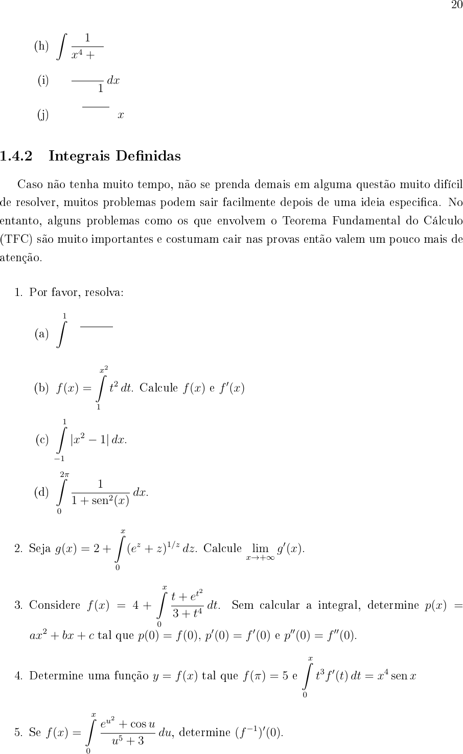 <p>20</p><p>(h)</p><p>∫</p><p>1</p><p>x4 + 1</p><p>dx</p><p>(i)</p><p>∫</p><p>1</p><p>x6 + 1</p><p>dx</p><p>(j)</p><p>∫ √</p><p>tg(x) dx</p><p>1.4.2 Integrais De�nidas</p><p>Caso não tenha muito tempo, não se prenda demais em alguma questão muito difícil</p><p>de resolver, muitos problemas podem sair facilmente depois de uma ideia especi�ca. No</p><p>entanto, alguns problemas como os que envolvem o Teorema Fundamental do Cálculo</p><p>(TFC) são muito importantes e costumam cair nas provas então valem um pouco mais de</p><p>atenção.</p><p>1. Por favor, resolva:</p><p>(a)</p><p>1∫</p><p>−1</p><p>√</p><p>4− x2 dx</p><p>(b) f(x) =</p><p>x2∫</p><p>1</p><p>t2 dt. Calcule f(x) e f ′(x)</p><p>(c)</p><p>1∫</p><p>−1</p><p>|x2 − 1| dx.</p><p>(d)</p><p>2π∫</p><p>0</p><p>1</p><p>1 + sen2(x)</p><p>dx.</p><p>2. Seja g(x) = 2 +</p><p>x∫</p><p>0</p><p>(ez + z)1/z dz. Calcule lim</p><p>x→+∞</p><p>g′(x).</p><p>3. Considere f(x) = 4 +</p><p>x∫</p><p>0</p><p>t+ et</p><p>2</p><p>3 + t4</p><p>dt. Sem calcular a integral, determine p(x) =</p><p>ax2 + bx+ c tal que p(0) = f(0), p′(0) = f ′(0) e p′′(0) = f ′′(0).</p><p>4. Determine uma função y = f(x) tal que f(π) = 5 e</p><p>x∫</p><p>0</p><p>t3f ′(t) dt = x4 senx</p><p>5. Se f(x) =</p><p>x∫</p><p>0</p><p>eu</p><p>2</p><p>+ cosu</p><p>u5 + 3</p><p>du, determine (f−1)′(0).</p>