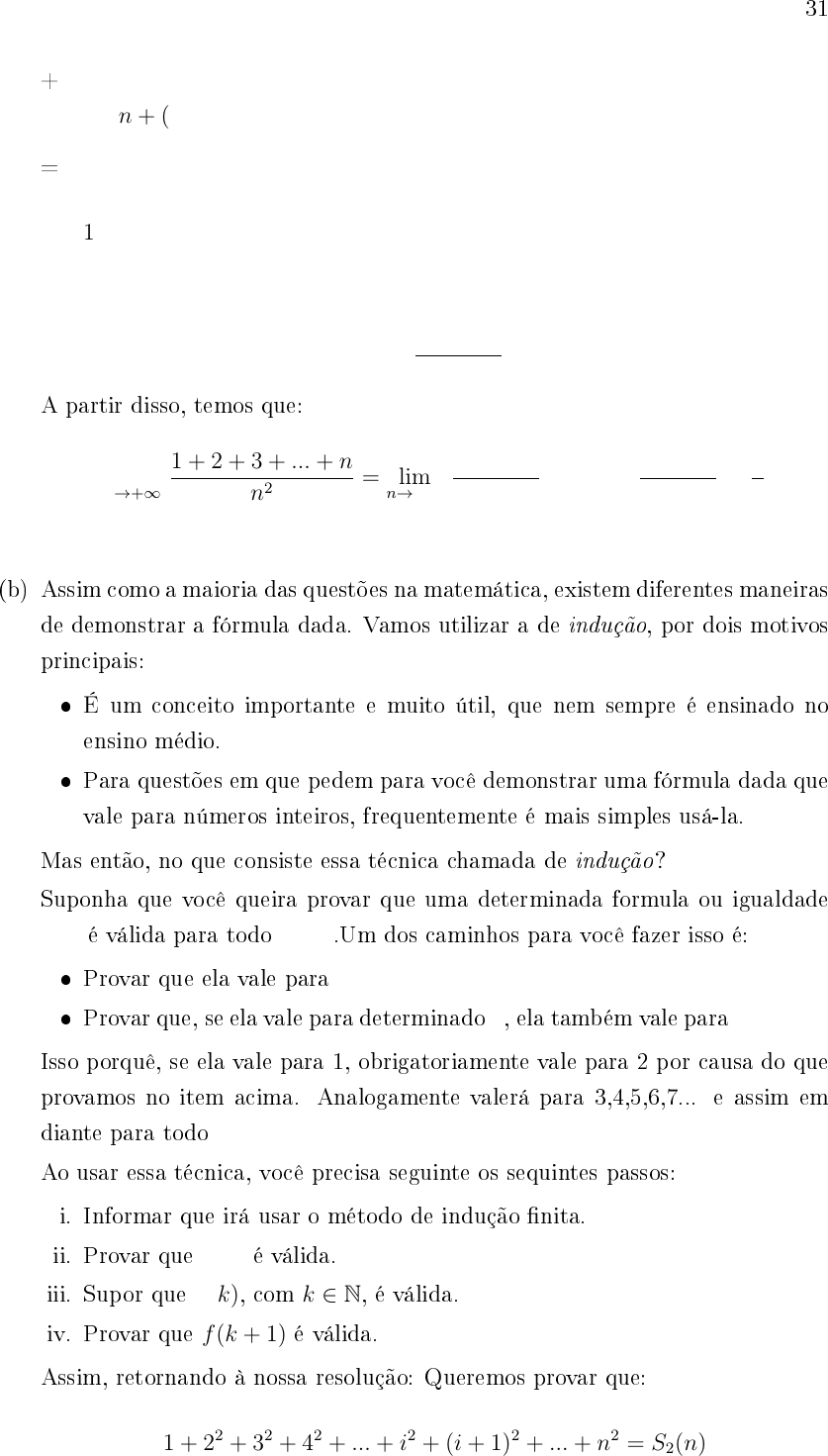 <p>31</p><p>+</p><p>n+ (n− 1) + (n− 2) + ...+ (n− i+ 1) + (n− i) + ...+ 1 = S</p><p>=</p><p>(n+1)+(n−1+2)+(n−2+3)+...+(n−i−1+i)+(n−i+i+1)+...+(n+1) = 2S</p><p>n(n+ 1) = 2S</p><p>S =</p><p>n(n+ 1)</p><p>2</p><p>A partir disso, temos que:</p><p>lim</p><p>n→+∞</p><p>1 + 2 + 3 + ...+ n</p><p>n2</p><p>= lim</p><p>n→+∞</p><p>n(n+ 1)</p><p>2n2</p><p>= lim</p><p>n→+∞</p><p>1 + n−2</p><p>2</p><p>=</p><p>1</p><p>2</p><p>�</p><p>(b) Assim como a maioria das questões na matemática, existem diferentes maneiras</p><p>de demonstrar a fórmula dada. Vamos utilizar a de indução, por dois motivos</p><p>principais:</p><p>� É um conceito importante e muito útil, que nem sempre é ensinado no</p><p>ensino médio.</p><p>� Para questões em que pedem para você demonstrar uma fórmula dada que</p><p>vale para números inteiros, frequentemente é mais simples usá-la.</p><p>Mas então, no que consiste essa técnica chamada de indução?</p><p>Suponha que você queira provar que uma determinada formula ou igualdade</p><p>f(i) é válida para todo i ∈ N.Um dos caminhos para você fazer isso é:</p><p>� Provar que ela vale para i = 1</p><p>� Provar que, se ela vale para determinado k, ela também vale para k′ = k+1</p><p>Isso porquê, se ela vale para 1, obrigatoriamente vale para 2 por causa do que</p><p>provamos no item acima. Analogamente valerá para 3,4,5,6,7... e assim em</p><p>diante para todo n ∈ N</p><p>Ao usar essa técnica, você precisa seguinte os sequintes passos:</p><p>i. Informar que irá usar o método de indução �nita.</p><p>ii. Provar que f(1) é válida.</p><p>iii. Supor que f(k), com k ∈ N, é válida.</p><p>iv. Provar que f(k + 1) é válida.</p><p>Assim, retornando à nossa resolução: Queremos provar que:</p><p>1 + 22 + 32 + 42 + ...+ i2 + (i+ 1)2 + ...+ n2 = S2(n)</p>