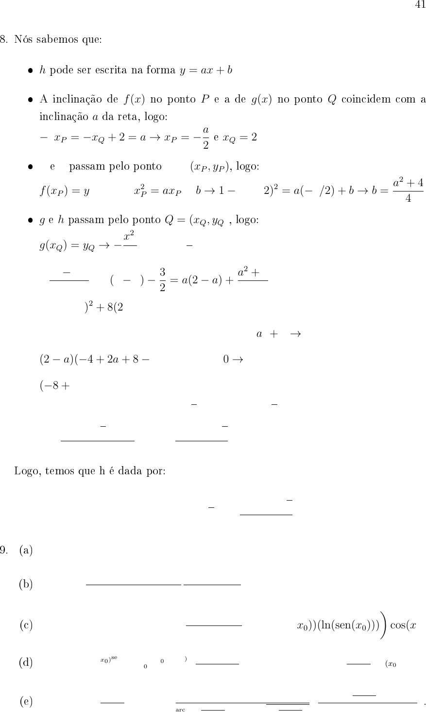 <p>41</p><p>8. Nós sabemos que:</p><p>� h pode ser escrita na forma y = ax+ b</p><p>� A inclinação de f(x) no ponto P e a de g(x) no ponto Q coincidem com a</p><p>inclinação a da reta, logo:</p><p>−2xP = −xQ + 2 = a→ xP = −a</p><p>2</p><p>e xQ = 2− a</p><p>� f e h passam pelo ponto P = (xP , yP ), logo:</p><p>f(xP ) = yP → 1− x2</p><p>P = axP + b→ 1− (−a/2)2 = a(−a/2) + b→ b =</p><p>a2 + 4</p><p>4</p><p>� g e h passam pelo ponto Q = (xQ, yQ), logo:</p><p>g(xQ) = yQ → −</p><p>x2</p><p>Q</p><p>2</p><p>+ 2xQ −</p><p>3</p><p>2</p><p>= axQ + b→</p><p>−(2− a)2</p><p>2</p><p>+ 2(2− a)− 3</p><p>2</p><p>= a(2− a) +</p><p>a2 + 4</p><p>4</p><p>→</p><p>−2(2− a)2 + 8(2− a)− 6 = 4a(2− a) + a2 + 4→</p><p>(2− a)(−2(2− a) + 8)− 6 = (2− a)(4a) + a2 + 4→</p><p>(2− a)(−4 + 2a+ 8− 4a) = +a2 + 10→</p><p>(−8 + 4a+ 16− 8a) + (+a4− 2a2 − 8a+ 4a2) = +a2 + 10→</p><p>a2 − 8a− 2 = 0→ a = 4± 3</p><p>√</p><p>2→ a = 4− 3</p><p>√</p><p>2→</p><p>b =</p><p>(4− 3</p><p>√</p><p>2)2 + 4</p><p>4</p><p>→ b =</p><p>19− 12</p><p>√</p><p>2</p><p>2</p><p>Logo, temos que h é dada por:</p><p>y = (4− 3</p><p>√</p><p>2)x+</p><p>19− 12</p><p>√</p><p>2</p><p>2</p><p>9. (a) f ′1(x0) = ee</p><p>ex0</p><p>ee</p><p>x0ex0</p><p>(b) f ′2(x0) =</p><p>e1+e1+x0</p><p>1 + ln(1 + e1+e1+x0 )</p><p>ln (1 + e)</p><p>1 + e1+e1+x0</p><p>(1 + e)1+x0</p><p>(c) f ′3(x0) = (sen(x0))sen(sen(x0))</p><p>(</p><p>sen(sen(x0)</p><p>sen(x0)</p><p>+ cos(sen(x0))(ln(sen(x0)))</p><p>)</p><p>cos(x0)</p><p>(d) f ′4(x0)=cos(x</p><p>sen(x0)</p><p>sen(x0)</p><p>0 )x</p><p>sen(x</p><p>sen(x0)</p><p>0 )</p><p>0</p><p>(</p><p>sen(x</p><p>sen(x0)</p><p>0 )</p><p>x0</p><p>+ln(x0) cos(x</p><p>sen(x0)</p><p>0 )xsen(x)</p><p>(</p><p>sen(x0)</p><p>x0</p><p>+ln(x0) cos(x0)</p><p>))</p><p>(e) f ′5(x0)=(arcsen</p><p>(</p><p>x0</p><p>sen(x0)</p><p>)</p><p>)ln(sen(e</p><p>x</p><p>0 ))</p><p> (sen(x0)−x0 cos(x0)) ln(sen(e</p><p>x</p><p>0 ))</p><p>arcsen</p><p>(</p><p>x0</p><p>sen(x0)</p><p>)</p><p>sen2(x0)</p><p>√</p><p>1−[</p><p>x0</p><p>sen(x0)</p><p>]2</p><p>+</p><p>ln(arcsen</p><p>(</p><p>x0</p><p>sen(x0)</p><p>)</p><p>) cos(ex0 )ex0</p><p>sen(ex0 )</p><p>.</p>