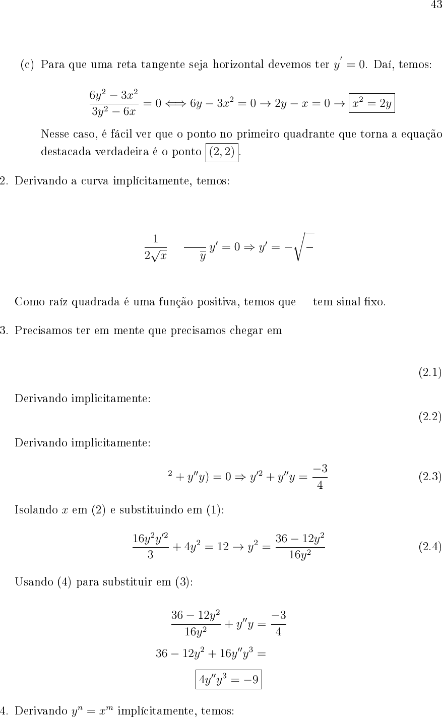 <p>43</p><p>(c) Para que uma reta tangente seja horizontal devemos ter y</p><p>′</p><p>= 0. Daí, temos:</p><p>6y2 − 3x2</p><p>3y2 − 6x</p><p>= 0⇐⇒ 6y − 3x2 = 0→ 2y − x = 0→ x2 = 2y</p><p>Nesse caso, é fácil ver que o ponto no primeiro quadrante que torna a equação</p><p>destacada verdadeira é o ponto (2, 2) .</p><p>2. Derivando a curva implícitamente, temos:</p><p>1</p><p>2</p><p>√</p><p>x</p><p>+</p><p>1</p><p>2</p><p>√</p><p>y</p><p>y′ = 0⇒ y′ = −</p><p>√</p><p>y</p><p>x</p><p>Como raíz quadrada é uma função positiva, temos que y′ tem sinal �xo.</p><p>3. Precisamos ter em mente que precisamos chegar em 4y′′y3 = −9</p><p>3x2 + 4y2 = 12 (2.1)</p><p>Derivando implicitamente:</p><p>6x+ 8yy′ = 0 (2.2)</p><p>Derivando implicitamente:</p><p>6 + 8(y′2 + y′′y) = 0⇒ y′2 + y′′y =</p><p>−3</p><p>4</p><p>(2.3)</p><p>Isolando x em (2) e substituindo em (1):</p><p>16y2y′2</p><p>3</p><p>+ 4y2 = 12→ y2 =</p><p>36− 12y2</p><p>16y2</p><p>(2.4)</p><p>Usando (4) para substituir em (3):</p><p>36− 12y2</p><p>16y2</p><p>+ y′′y =</p><p>−3</p><p>4</p><p>36− 12y2 + 16y′′y3 = −12y2</p><p>4y′′y3 = −9</p><p>4. Derivando yn = xm implícitamente, temos:</p>