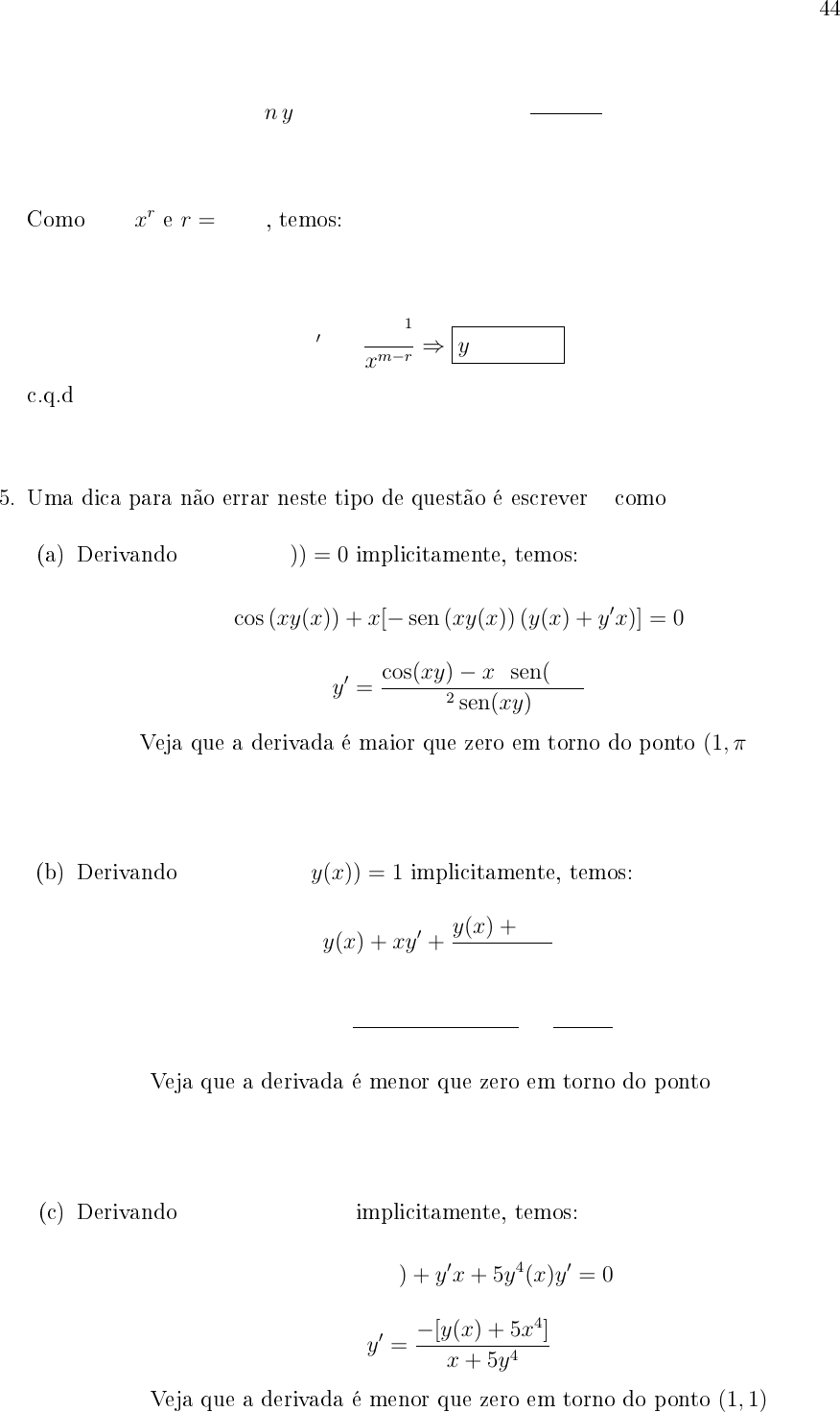 <p>44</p><p>n yn−1y′ = mxm−1 ⇒ y′ =</p><p>mxm−1</p><p>n yn−1</p><p>Como y = xr e r = m/n, temos:</p><p>y′ = r</p><p>xm−1</p><p>xm−r</p><p>⇒ y′ = rxr−1</p><p>c.q.d</p><p>5. Uma dica para não errar neste tipo de questão é escrever y como y(x)</p><p>(a) Derivando x cos (xy(x)) = 0 implicitamente, temos:</p><p>cos (xy(x)) + x[− sen (xy(x)) (y(x) + y′x)] = 0</p><p>y′ =</p><p>cos(xy)− xy sen(xy)</p><p>x2 sen(xy)</p><p>Veja que a derivada é maior que zero em torno do ponto (1, π/2)</p><p>(b) Derivando xy(x) + ln (xy(x)) = 1 implicitamente, temos:</p><p>y(x) + xy′ +</p><p>y(x) + y′x</p><p>xy(x)</p><p>= 0</p><p>y′ =</p><p>−y(x)[xy(x) + 1]</p><p>x[xy(x) + 1]</p><p>=</p><p>−y(x)</p><p>x</p><p>Veja que a derivada é menor que zero em torno do ponto (1, 1)</p><p>(c) Derivando x5 + xy + y5 = 3 implicitamente, temos:</p><p>5x4 + y(x) + y′x+ 5y4(x)y′ = 0</p><p>y′ =</p><p>−[y(x) + 5x4]</p><p>x+ 5y4</p><p>Veja que a derivada é menor que zero em torno do ponto (1, 1)</p>