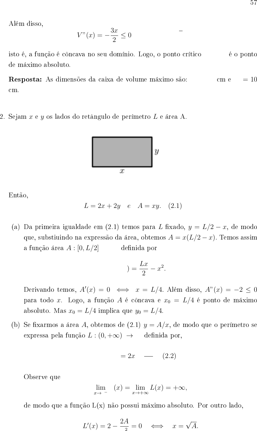<p>57</p><p>Além disso,</p><p>V ”(x) = −3x</p><p>2</p><p>≤ 0, ∀x ∈</p><p>[</p><p>0, 20</p><p>√</p><p>3</p><p>]</p><p>,</p><p>isto é, a função é côncava no seu domínio. Logo, o ponto crítico x0 = 20 é o ponto</p><p>de máximo absoluto.</p><p>Resposta: As dimensões da caixa de volume máximo são: x0 = 20 cm e h0 = 10</p><p>cm.</p><p>2. Sejam x e y os lados do retângulo de perímetro L e área A.</p><p>Então,</p><p>L = 2x+ 2y e A = xy. (2.1)</p><p>(a) Da primeira igualdade em (2.1) temos para L �xado, y = L/2 − x, de modo</p><p>que, substiuindo na expressão da área, obtemos A = x(L/2− x). Temos assim</p><p>a função área A : [0, L/2] → R de�nida por</p><p>A(x) =</p><p>Lx</p><p>2</p><p>− x2.</p><p>Derivando temos, A′(x) = 0 ⇐⇒ x = L/4. Além disso, A”(x) = −2 ≤ 0</p><p>para todo x. Logo, a função A é côncava e x0 = L/4 é ponto de máximo</p><p>absoluto. Mas x0 = L/4 implica que y0 = L/4.</p><p>(b) Se �xarmos a área A, obtemos de (2.1) y = A/x, de modo que o perímetro se</p><p>expressa pela função L : (0,+∞) → R de�nida por,</p><p>L(x) = 2x+</p><p>2A</p><p>x</p><p>. (2.2)</p><p>Observe que</p><p>lim</p><p>x→0−</p><p>L(x) = lim</p><p>x→+∞</p><p>L(x) = +∞,</p><p>de modo que a função L(x) não possui máximo absoluto. Por outro lado,</p><p>L′(x) = 2− 2A</p><p>x2</p><p>= 0 ⇐⇒ x =</p><p>√</p><p>A.</p>