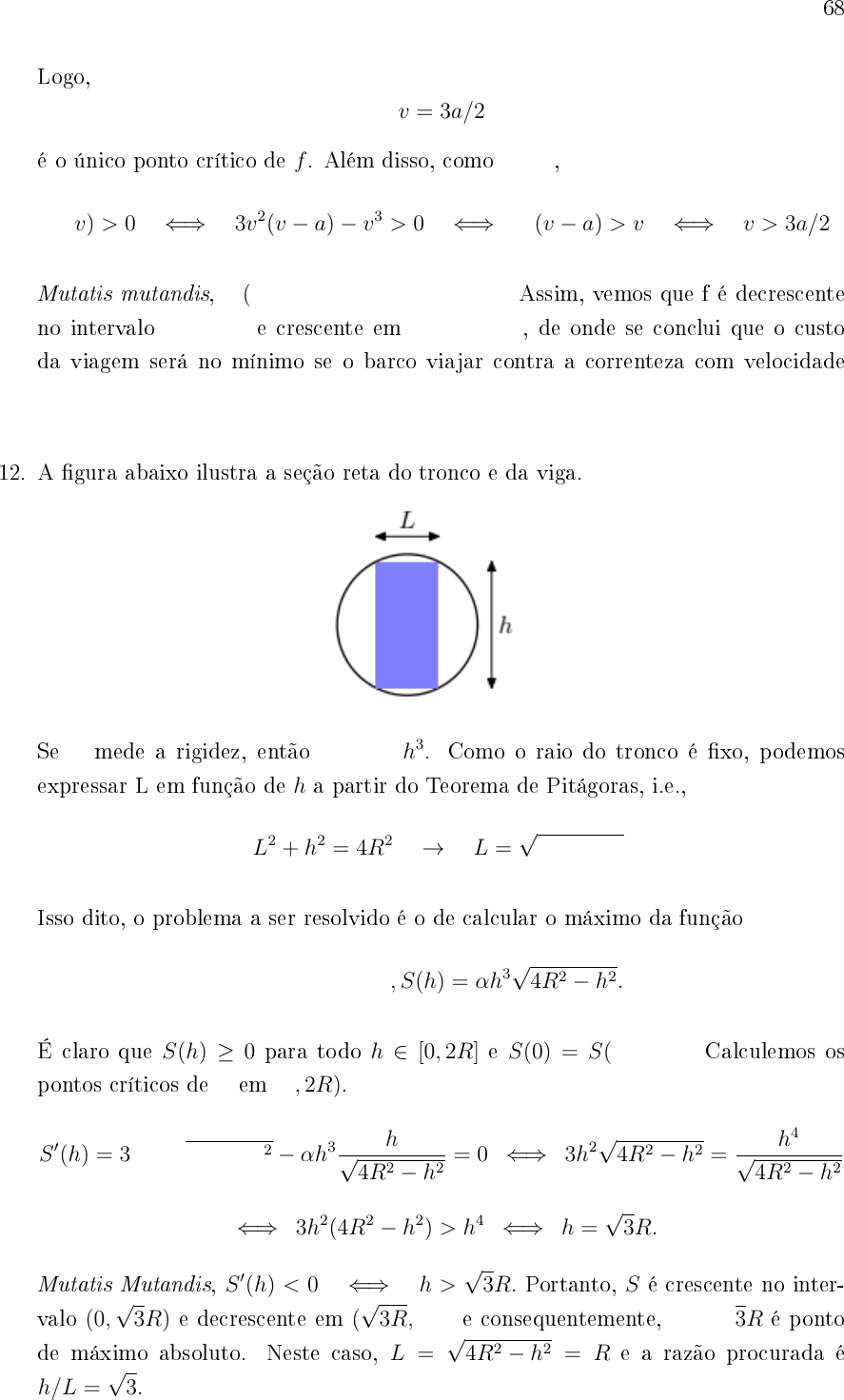 <p>68</p><p>Logo,</p><p>v = 3a/2</p><p>é o único ponto crítico de f . Além disso, como v > 0,</p><p>f ′(v) > 0 ⇐⇒ 3v2(v − a)− v3 > 0 ⇐⇒ 3(v − a) > v ⇐⇒ v > 3a/2.</p><p>Mutatis mutandis, f ′(v) h4 ⇐⇒ h =</p><p>√</p><p>3R.</p><p>Mutatis Mutandis, S ′(h)</p><p>√</p><p>3R. Portanto, S é crescente no inter-</p><p>valo (0,</p><p>√</p><p>3R) e decrescente em (</p><p>√</p><p>3R, 2R) e consequentemente, h =</p><p>√</p><p>3R é ponto</p><p>de máximo absoluto. Neste caso, L =</p><p>√</p><p>4R2 − h2 = R e a razão procurada é</p><p>h/L =</p><p>√</p><p>3.</p>