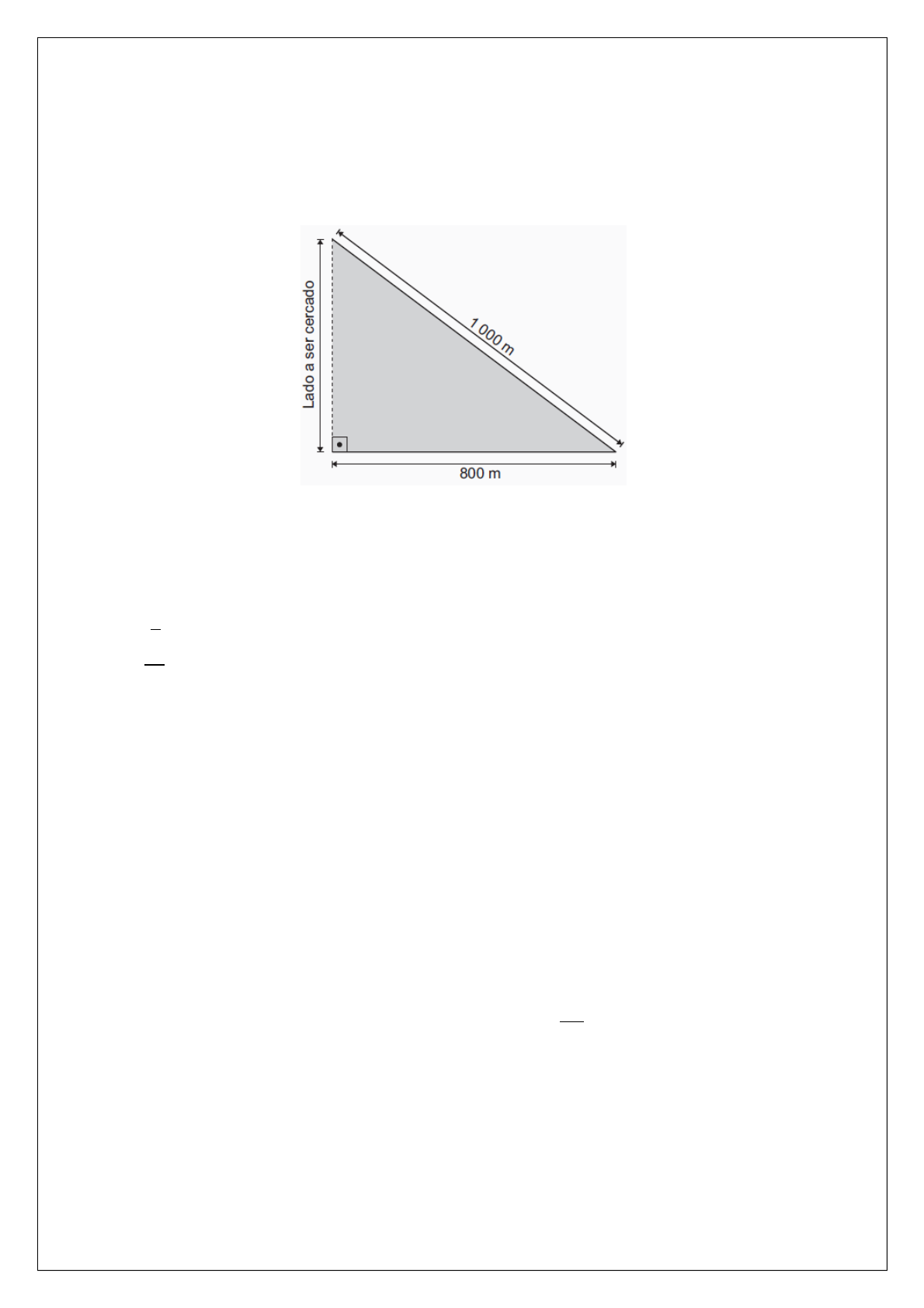 <p>D2 – Reconhecer aplicações das relações métricas do triângulo retângulo em um problema que envolva figuras</p><p>planas ou espaciais.</p><p>01)(SPAECE). Getúlio cercará um terreno triangular que será utilizado no plantio de</p><p>algodão. Esse terreno já possui cerca em dois de seus lados, sendo necessário cercar</p><p>apenas o terceiro lado, conforme representado na figura abaixo.</p><p>Qual é a medida do comprimento do lado desse terreno que deverá ser cercado?</p><p>A) 200 m</p><p>B) 600 m</p><p>C) 800 m</p><p>D)400√5 m</p><p>E)200√41 m</p><p>02) Duas pessoas, partindo de um mesmo local, caminham em direções ortogonais. Uma</p><p>pessoa caminhou 12 metros para o sul, a outra, 5 metros para o leste. Qual a distância que</p><p>separa essas duas pessoas?</p><p>(A) 7 m</p><p>(B) 13 m</p><p>(C) 17 m</p><p>(D) 60 m</p><p>(E) 119 m</p><p>03)A figura ABCD abaixo é um retângulo e o segmento EF é paralelo ao lado AD.</p><p>D2 – Reconhecer aplicações das relações métricas do triângulo retângulo em um problema que envolva figuras</p><p>planas ou espaciais.</p><p>Qual é o comprimento do segmento EG , indicado por x?</p><p>(A) 5 m</p><p>(B) 7 m</p><p>(C) 11 m</p><p>(D) 12 m</p><p>(E) 17 m</p><p>04)Uma empresa quer acondicionar seus produtos, quem tem o formato de uma pirâmide</p><p>de base quadrada, em caixa de papelão para exportação.</p><p>A altura da caixa de papelão deve ter a altura mínima de:</p><p>(A) 6 cm.</p><p>(B) 120 cm.</p><p>(C) 44 cm.</p><p>(D) 22 cm.</p><p>(E) 8 cm.</p><p>05)Um fazendeiro quer colocar uma tábua em diagonal na sua porteira.</p><p>D2 – Reconhecer aplicações das relações métricas do triângulo retângulo em um problema que envolva figuras</p><p>planas ou espaciais.</p><p>Sabendo que a folha da porteira mede 1,2m por 1,6m. O comprimento dessa tábua é:</p><p>(A) 2,8m</p><p>(B) 2 m</p><p>(C) 0,8 m</p><p>(D) 1,92m</p><p>(E) 3 m.</p><p>06)Um bloco de formato retangular ABCDEFGH, representado pela figura abaixo, tem as</p><p>arestas que medem 3 cm, 4 cm e 6 cm.</p><p>A medida da diagonal FC do bloco retangular, em centímetros, é:</p><p>(A) 3.</p><p>(B) 5.</p><p>(C) 4 6</p><p>(D)2 13</p><p>(E) 61</p><p>07)(PROEB). Um avião decola de um aeroporto formando um ângulo de 30° com o solo,</p><p>como mostra a figura abaixo.</p><p>D2 – Reconhecer aplicações das relações métricas do triângulo retângulo em um problema que envolva figuras</p><p>planas ou espaciais.</p><p>Para atingir a altitude de 10 km, qual a distância que esse avião deverá percorrer?</p><p>A) 10 km</p><p>B) 20 km</p><p>C) 35 km</p><p>D) 50 km</p><p>E) 60 km</p><p>08)(PROEB). Para reforçar a estrutura PQR, foi colocada uma trave PM, como mostra a</p><p>figura abaixo.</p><p>Qual a medida do comprimento da trave PM?</p><p>A) 1,0 m</p><p>B) 2,4 m</p><p>C) 3,0 m</p><p>D) 3,5 m</p><p>E) 5,0 m</p><p>09)Um marceneiro fixou uma tábua de passar roupa perpendicular a uma parede, a 0,90</p><p>metros do chão. Para aumentar a resistência, ele colocou dois apoios, como mostra a</p><p>figura abaixo.</p><p>D2 – Reconhecer aplicações das relações métricas do triângulo retângulo em um problema que envolva figuras</p><p>planas ou espaciais.</p><p>O comprimento “x” do apoio menor é</p><p>A) 0,42</p><p>B) 0,48</p><p>C) 0,72</p><p>D) 0,75</p><p>E) 0,87</p><p>10)No seu treinamento diário, um atleta percorre várias vezes o trajeto indicado na figura,</p><p>cujas dimensões estão em quilômetros.</p><p>Dessa maneira, pode-se afirmar que a cada volta nesse trajeto ele percorre</p><p>(A) 1 200 m.</p><p>(B) 1 400 m.</p><p>(C) 1 500 m.</p><p>(D) 1 600 m.</p><p>(E) 1 800 m.</p><p>11)Observe a figura abaixo:</p><p>D2 – Reconhecer aplicações das relações métricas do triângulo retângulo em um problema que envolva figuras</p><p>planas ou espaciais.</p><p>Ela sugere uma praça em forma de um quadrado com 200m de perímetro. Uma pessoa que</p><p>atravessa essa praça em diagonal percorre, em metros, a seguinte distância aproximada:</p><p>2 = 1,41).(Considere:</p><p>a) 67,5</p><p>b) 68,5</p><p>c) 69,5</p><p>d) 70,5</p><p>e) 71, 5</p><p>12)Pela figura abaixo, é possível perceber que as alturas do edifício e do hidrante são,</p><p>respectivamente, de 30 metros e 1,5 metro. Se a sombra do hidrante mede 50</p><p>centímetros, quanto mede a distância do prédio ao hidrante em metros?</p><p>A) 5,5</p><p>B) 7,0</p><p>C) 8,5</p><p>D) 9,0</p><p>E) 9,5</p><p>13)(Saresp 2007). Se a diagonal de um quadrado mede 60 2 m, quanto mede o lado deste</p><p>quadrado.</p><p>D2 – Reconhecer aplicações das relações métricas do triângulo retângulo em um problema que envolva figuras</p><p>planas ou espaciais.</p><p>(A) 50 m</p><p>(B) 60 m</p><p>(C) 75 cm</p><p>(D) 90 m</p><p>(E) 100 m</p><p>14)(Saresp 2007). A altura de uma árvore é 3 m e ela está a 20 m de um edifício cuja altura</p><p>é 18 m.</p><p>A distância entre o ponto mais alto da árvore e o ponto mais alto do edifício é</p><p>(A) 15 m</p><p>(B) 18 m</p><p>(C) 20 m</p><p>(D) 25 m</p><p>(E) 30 m</p><p>15)(Saresp 2007). Uma pequena torre, representada abaixo, tem um telhado com a forma</p><p>de pirâmide regular de base quadrada que coincide com o topo do corpo da torre, que</p><p>tem a forma de um paralelepípedo reto de base quadrada.</p><p>D2 – Reconhecer aplicações das relações métricas do triângulo retângulo em um problema que envolva figuras</p><p>planas ou espaciais.</p><p>A altura h da torre é de aproximadamente</p><p>(A) 10 m</p><p>(B) 9,6 m</p><p>(C) 7,6 m</p><p>(D) 2,6 m</p><p>(E) 15 m</p><p>16)(Saresp 2007). O sólido representado na figura é um prisma reto retangular, e tem</p><p>dimensões medindo 6 cm, 8 cm e 10 cm.</p><p>Qual é, em centímetros, a soma das medidas dos segmentos AM e MP?</p><p>(A) 20</p><p>(B) 10 2</p><p>(C) 10 +10 2</p><p>(D) 24</p><p>(E) 30</p><p>17)(Supletivo 2011). Aparelhos de TV e monitores de computador são vendidos com</p><p>medidas em polegadas. 