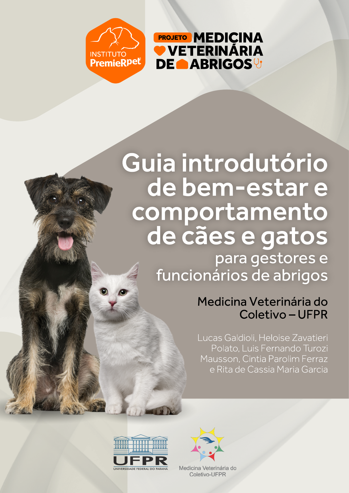 <p>1</p><p>GUIA INTRODUTÓRIO DE BEM-ESTAR E COMPORTAMENTO DE CÃES E GATOS PARA GESTORES</p><p>E FUNCIONÁRIOS DE ABRIGOS</p><p>Editores e Organizadores:</p><p>Lucas Galdioli</p><p>Heloise Zavatieri Polato</p><p>Luis Fernando Turozi Mausson</p><p>Cíntia Parolim Ferraz</p><p>Rita de Cassia Maria Garcia</p><p>Apoio e Revisão:</p><p>Instituto PremieRpet®</p><p>1ª Edição: julho, 2021</p><p>Esta obra está licenciada com uma Licença Creative Commons Atribuição-Não Comercial 4.0 Internacional.</p><p>G149</p><p>Galdioli, Lucas</p><p>Guia introdutório de bem-estar e comportamento de</p><p>cães e gatos para gestores e funcionários de abrigos</p><p>[recurso eletrônico]. / Lucas Galdioli, Heloise Zavatieri</p><p>Polato, Luis Fernando Turozi Mausson, Cintia Parolim</p><p>Ferraz, Rita de Cassia Maria Garcia (Editores e</p><p>Organizadores). – Curitiba : MVC, 2021.</p><p>1.295 Kb – 72 p.: il. col.</p><p>Inclui bibliografia.</p><p>ISBN eBook 978-65-89713-09-8 (online).</p><p>1. Medicina veterinária. 2. Animais - Proteção. 3. Abrigos</p><p>para animais - Manuais, guias, etc. I. Título. II. Universidade</p><p>Federal do Paraná. III. Medicina Veterinária do Coletivo - UFPR</p><p>(MVC).</p><p>CDD 636.0832</p><p>Catalogação na Fonte UFPR – Sistema de Bibliotecas - SIBI</p><p>Bibliotecário: Guilherme Luiz Cintra Neves - CRB9/1572</p><p>2</p><p>Sumário</p><p>Apresentação ...................................................................................................................................................... 3</p><p>Capítulo 1 - Senciência e Bem-estar Animal ....................................................................................................... 5</p><p>Capítulo 2 - Indicadores para monitoramento de níveis de bem-estar animal para cães e gatos em abrigos .. 7</p><p>Capítulo 3 - Etograma de Cão e Gato ............................................................................................................... 14</p><p>Capítulo 4 - Como os cães e gatos se comunicam? .......................................................................................... 19</p><p>Capítulo 5 - Aspectos sensoriais dos cães e gatos de abrigos que podem influenciar no bem-estar animal .. 32</p><p>Capítulo 6 – Socialização .................................................................................................................................. 35</p><p>Capítulo 7 - Avaliação e Tratamento Comportamental .................................................................................... 39</p><p>Capítulo 8 – Educação e adestramento pré-adoção ........................................................................................ 50</p><p>Capítulo 9 - Principais problemas que causam baixos níveis de bem-estar animal para cães e gatos em</p><p>abrigos .............................................................................................................................................................. 53</p><p>Capítulo 10 - Enriquecimento Ambiental ......................................................................................................... 62</p><p>Capítulo 11 - Monitoramento das adoções e aconselhamento comportamental ........................................... 66</p><p>Capítulo 12 - Orientações básicas para adotantes sobre o comportamento de cães e gatos ......................... 68</p><p>Referências ....................................................................................................................................................... 70</p><p>3</p><p>Apresentação</p><p>A dificuldade de coibir e prevenir o abandono de cães e gatos é uma realidade em diversos</p><p>países, tendo implicações tanto para a saúde pública como para o bem-estar dos animais. As</p><p>mudanças de políticas no manejo populacional de cães e gatos demandaram novos conhecimentos</p><p>para os serviços de controle de zoonoses, já que os animais capturados não podiam mais ser</p><p>eliminados, devendo ser tratados, avaliados e destinados adequadamente. Esse fato impulsionou</p><p>os cursos e estudos da Medicina Veterinária em abrigos no Brasil. A preocupação de proporcionar</p><p>apenas os cuidados básicos, como abrigo, água e alimento, foi, aos poucos, incluindo os aspectos</p><p>comportamentais e psicológicos para a promoção de uma boa qualidade de vida dos animais</p><p>abrigados.</p><p>Nos abrigos com atuação da proteção animal, os médicos-veterinários clínicos de pequenos</p><p>animais auxiliam no tratamento dos cães e gatos, aplicando o conhecimento da clínica médica</p><p>individual de forma coletiva. No entanto, novas abordagens, conhecimentos e práticas são</p><p>necessários para prevenir doenças e diminuir os gastos e o período de manutenção dos animais</p><p>antes da sua adoção. A lógica da clínica médica centrada no individuo precisa ser repensada para o</p><p>coletivo. Os médicos-veterinários, em geral, não estão preparados para cuidar dos animais no</p><p>coletivo, pois uma nova abordagem é necessária para que os animais sejam recuperados física e</p><p>psicologicamente antes da adoção, e em um tempo curto de permanência no abrigo para diminuir</p><p>o risco de adoecimento do animal e economizar recursos.</p><p>O grande desafio dos abrigos é garantir bons níveis de bem-estar aos animais e cuidar de</p><p>suas necessidades individualmente, sem perder o foco no grupo. Os espaços devem ser projetados</p><p>para acolher, cuidar dos animais e encaminhá-los para adoção o mais brevemente possível. Quando</p><p>a permanência se faz necessária por mais tempo, muitos dos lugares não estão preparados para</p><p>atender às demandas, tanto físicas quanto comportamentais, dos animais. A rotina dos abrigos</p><p>exige conhecimento e comprometimento dos funcionários, médicos-veterinários e</p><p>administradores, pois apenas a “boa intenção” no momen