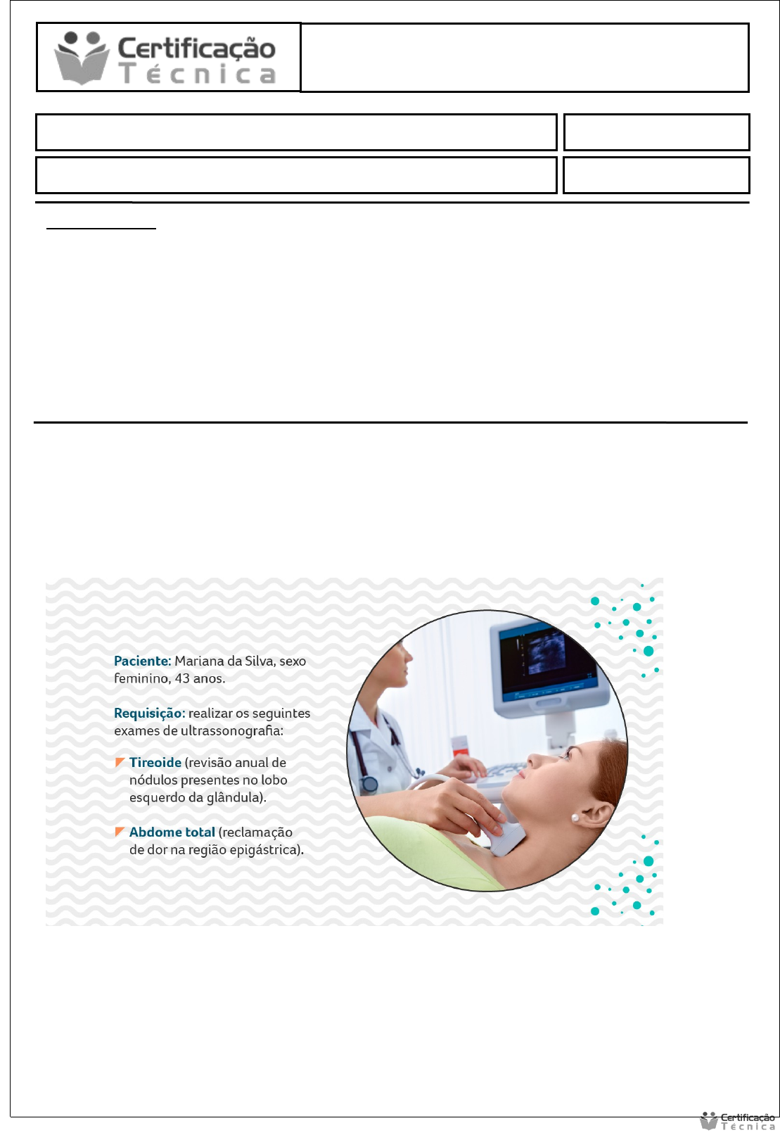 <p>Princípios de Eletromagnetismo</p><p>Data:12/01/2021.</p><p>Aluno (a): Henryl da Rosa Paim</p><p>Avaliação Pratica</p><p>INSTRUÇÕES:</p><p>· Esta Avaliação contém 1 (uma) questão, totalizando 10 (dez) pontos;</p><p>· Baixe o arquivo disponível com a Atividade Pratica;</p><p>· Você deve preencher dos dados no Cabeçalho para sua identificação:</p><p>· Nome / Data de entrega.</p><p>· As respostas devem ser digitadas abaixo de cada pergunta;</p><p>· Ao terminar grave o arquivo com o nome Atividade Prática;</p><p>· Quando solicitado</p><p>· Envio o arquivo pelo sistema no local indicado;</p><p>· Em caso de dúvidas consulte o seu Tutor.</p><p>Na ultrassonografia, o equipamento que adquire as imagens apresenta uma variedade de transdutores para o estudo de diferentes partes do corpo. Esses transdutores são calibrados para gerarem ondas sonoras de frequências específicas de ultrassom.</p><p>Nesse contexto, imagine que você faz parte da equipe de diagnóstico por imagem de uma clínica e recebeu a seguinte solicitação:</p><p>Agora, suponha que o equipamento que você vai utilizar tem apenas dois transdutores: um de formato retangular, com frequência de 10MHz, e outro convexo, com frequência de 3,5MHz. Baseando sua resposta nos aspectos físicos das ondas sonoras, qual seria o transdutor indicado para cada exame? Justifique a sua resposta.</p><p>O transdutor é um dispositivo e/ou sensor que tem como finalidade converter um tipo de energia em outro tipo. No ultrassom, o transdutor gera ondas ultra-sônicas, montados de maneira a produzir e receber ecos gerados pelas diversas interfaces do aparelho.</p><p>Os transdutores de menor frequência são utilizados para exames de tecido profundos como o fígado, baço, entre outros. Já os transdutores de maior frequência são utilizados para exame em tecidos superficiais como a mama e a pele, entre outros.</p><p>No exame da paciente Mariana da Silva, de 43 anos, para a ultrassonografia da tireoide é indicado o transdutor retangular de 10 MHz, pois quanto maior a frequência do transdutor utilizada no exame, menor o comprimento da onda sonora e melhor resolução espacial.</p><p>Para a ultrassonografia do abdome total é indicado o transdutor convexo de 3,5MHz, pois quanto menor a frequência do transdutor utilizada no exame, maior o comprimento da onda sonora e menor resolução espacial.</p><p>image1.png</p><p>image2.png</p>