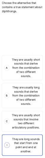 Choose the alternative that contains a true statement about diphthongs. They are usually short sounds that derive A from the combination of two different sounds. They are usually long sounds that derive B from the combination of two different They are usually short sounds that involve C two different articulatory positions. They are long sounds that start from one D point and end at another.