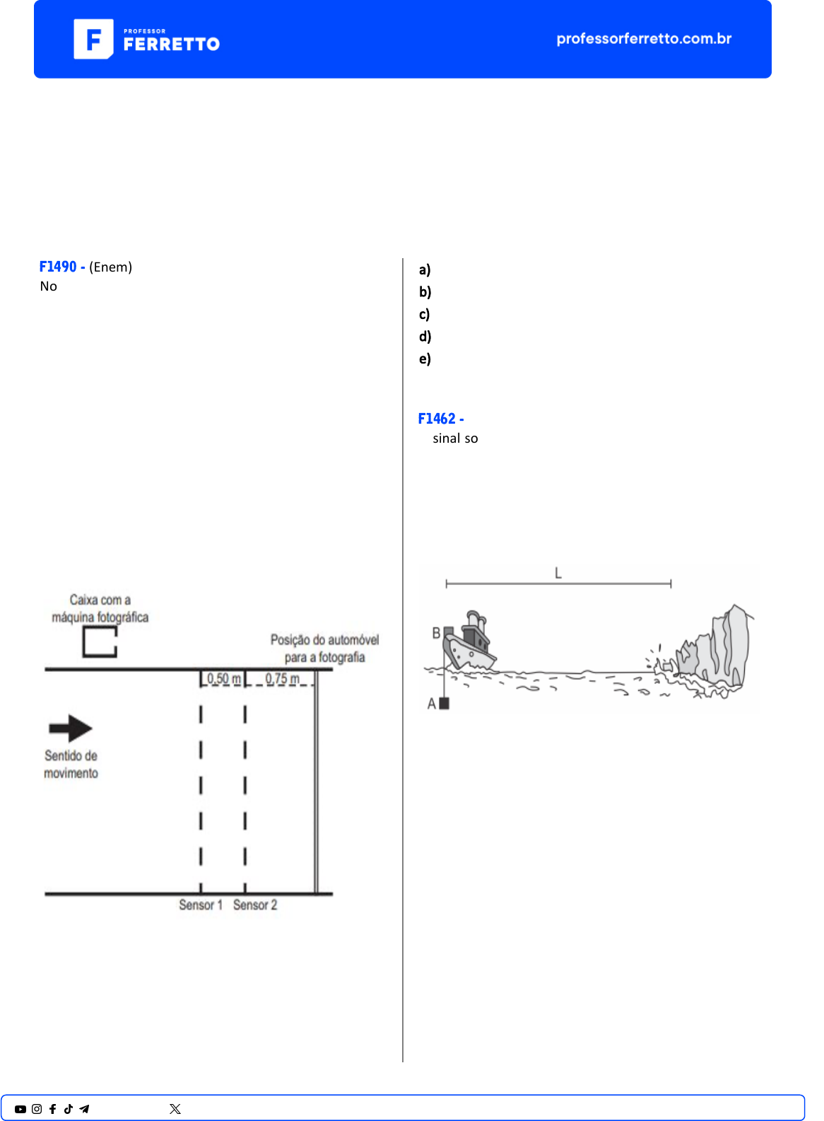 <p>ENEM</p><p>Cinemática</p><p>Introdução à Cinemática</p><p>F1490 - (Enem)</p><p>No Brasil, a quan�dade de mortes decorrentes de</p><p>acidentes por excesso de velocidade já é tratada como</p><p>uma epidemia. Uma forma de profilaxia é a instalação de</p><p>aparelhos que medem a velocidade dos automóveis e</p><p>registram, por meio de fotografias, os veículos que</p><p>trafegam acima do limite de velocidade permi�do. O</p><p>princípio de funcionamento desses aparelhos consiste na</p><p>instalação de dois sensores no solo, de forma a registrar</p><p>os instantes em que o veículo passa e, em caso de</p><p>excesso de velocidade, fotografar o veículo quando ele</p><p>passar sobre uma marca no solo, após o segundo sensor.</p><p>Considere que o disposi�vo representado na figura esteja</p><p>instalado em uma via com velocidade máxima permi�da</p><p>de 60 km/h.</p><p>No caso de um automóvel que trafega na velocidade</p><p>máxima permi�da, o tempo, em milissegundos, medido</p><p>pelo disposi�vo, é</p><p>a) 8,3.</p><p>b) 12,5.</p><p>c) 30,0.</p><p>d) 45,0.</p><p>e) 75,0.</p><p>F1462 - (Enem)</p><p>O sinal sonoro oriundo da queda de um grande bloco de</p><p>gelo de uma geleira é detectado por dois disposi�vos</p><p>situados em um barco, sendo que o detector A está</p><p>imerso em água e o B, na proa da embarcação. Sabe-se</p><p>que a velocidade do som na água é de 1540 m/s no ar é</p><p>de 340 m/s</p><p>Os gráficos indicam, em tempo real, o sinal sonoro</p><p>detectado pelos dois disposi�vos, os quais foram ligados</p><p>simultaneamente em um instante anterior à queda do</p><p>bloco de gelo. Ao comparar pontos correspondentes</p><p>desse sinal em cada disposi�vo, é possível obter</p><p>informações sobre a onda sonora.</p><p>1@professorferretto @prof_ferretto</p><p>A distância L, em metro, entre o barco e a geleira é mais</p><p>próxima de</p><p>a) 339.000</p><p>b) 78.900</p><p>c) 14.400</p><p>d) 5.240</p><p>e) 100</p><p>2@professorferretto @prof_ferretto</p>