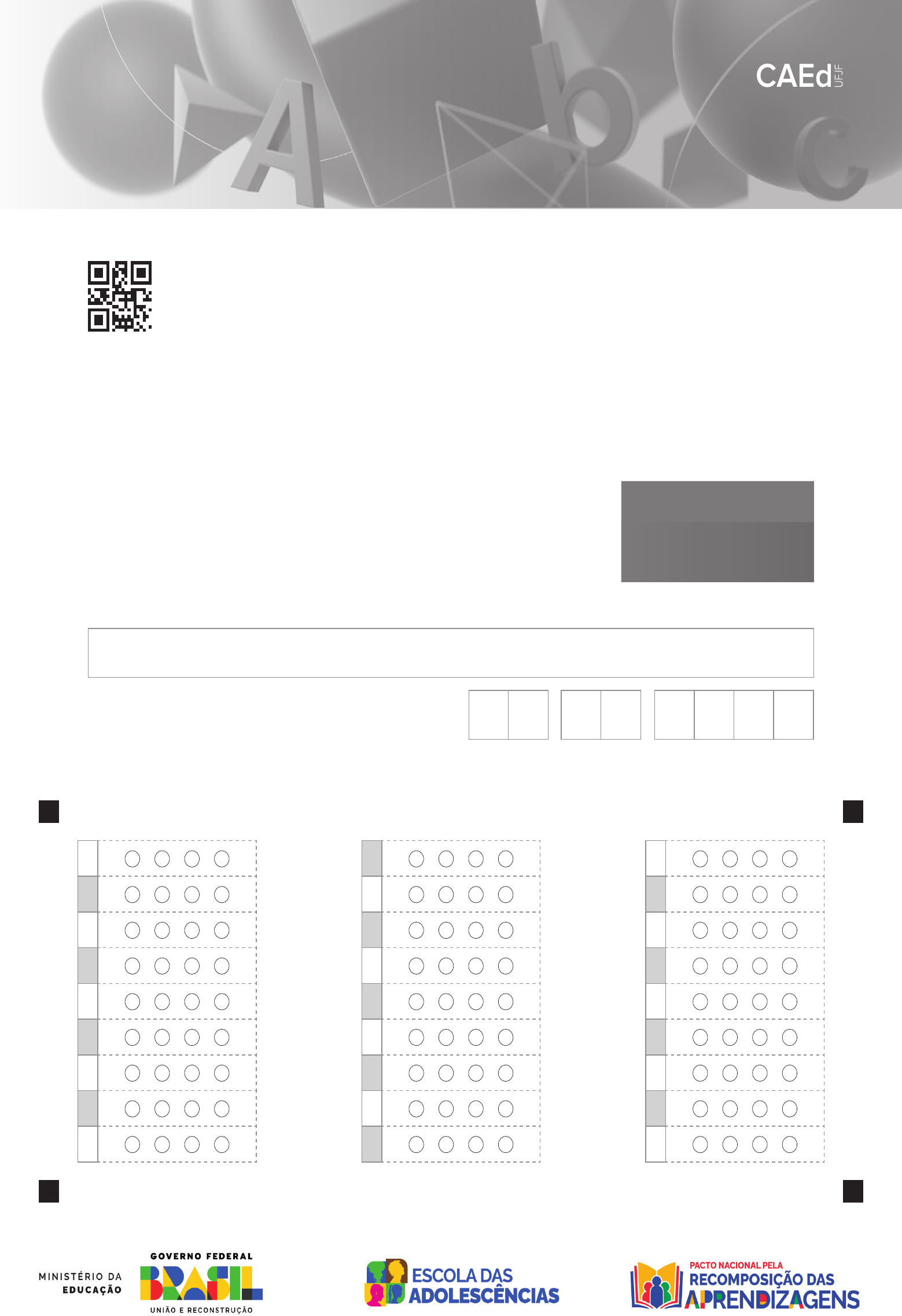 <p>CA D E R N O</p><p>Data de Nascimento</p><p>do(a) estudante</p><p>Nome do(a) estudante</p><p>N 0 70 1</p><p>AVALIAÇÃO CONTÍNUA DA APRENDIZAGEM</p><p>NOS ANOS FINAIS CICLO II</p><p>2024</p><p>1965N0701</p><p>7º ano do Ensino Fundamental</p><p>CIÊNCIAS DA NATUREZA</p><p>44220033220033662222</p><p>01</p><p>02</p><p>03</p><p>04</p><p>05</p><p>06</p><p>07</p><p>08</p><p>09</p><p>10</p><p>11</p><p>12</p><p>13</p><p>14</p><p>15</p><p>16</p><p>17</p><p>18</p><p>19</p><p>20</p><p>21</p><p>22</p><p>23</p><p>24</p><p>25</p><p>26</p><p>27</p><p>A B C D A B C D A B C D</p><p>BL01N07</p><p>Leia e observe as informações do quadro abaixo para responder às três questões a seguir.</p><p>Diego possui um carro do qual o motor funciona a partir da queima de um produto denominado gasolina.</p><p>Um dia, durante seu retorno para casa, ele precisou acionar o serviço de um caminhão guincho por</p><p>conta de uma pane seca. A pane seca ocorre quando a gasolina do carro acaba e, dessa forma, o</p><p>carro para de funcionar. Observe, na imagem abaixo, a estrutura indicada pela seta que foi usada para</p><p>levantar o carro do chão e posicioná‑lo sobre o guincho.</p><p>Disponível em: https://meulink.fit/P0929. Acesso em: 12 set. 2024. Adaptado para fins didáticos.</p><p>(N00090507_CEN)</p><p>01) (N00090507) Essa estrutura facilita o posicionamento do carro sobre o guincho, pois</p><p>A) anula a força peso do carro.</p><p>B) aumenta a potência do guincho.</p><p>C) diminui a intensidade da força necessária para elevar o carro.</p><p>D) reduz o atrito dos pneus do carro com a plataforma do guincho.</p><p>02) (N00090508) O motor desse carro funciona a partir da conversão da</p><p>A) temperatura em rendimento.</p><p>B) temperatura em movimento.</p><p>C) energia térmica em rendimento.</p><p>D) energia térmica em movimento.</p><p>03) (N00090509) O produto mencionado nesse texto desempenha, no carro, o papel de</p><p>A) fornecer energia ao motor.</p><p>B) limpar os componentes mecânicos.</p><p>C) lubrificar as peças internas.</p><p>D) manter a temperatura do motor adequada.</p><p>N0701</p><p>1</p><p>BL01N07</p><p>Leia e observe as informações do quadro abaixo para responder às quatro questões a seguir.</p><p>As enchentes são um fenômeno de origem natural, intensificado pelas ações humanas. Elas ocorrem</p><p>quando um grande volume de chuva atinge um determinado local e ultrapassa a capacidade de</p><p>escoamento e de absorção do solo. Esse fenômeno é prejudicial para a saúde da população, pois</p><p>pode elevar os casos de doenças, como a hepatite A, que é transmitida a partir do contato com a água</p><p>contaminada com o vírus HAV. Algumas das formas de prevenção dessa doença são a administração</p><p>da vacina, que é uma substância produzida a partir do próprio vírus, e o acesso a serviços públicos.</p><p>Observe, no gráfico abaixo, o número de casos de enchentes ocorridas durante 12 meses em</p><p>determinadas cidades.</p><p>0</p><p>1</p><p>2</p><p>3</p><p>4</p><p>5</p><p>6</p><p>7</p><p>8</p><p>Cidade 4Cidade 3Cidade 2Cidade 1</p><p>Número de casos de enchentes durante um período de</p><p>12 meses em determinadas cidades</p><p>Cidades</p><p>N</p><p>úm</p><p>er</p><p>o</p><p>de</p><p>e</p><p>nc</p><p>he</p><p>nt</p><p>es</p><p>(N00090469_CEN)</p><p>04) (N00090469) Uma ação humana que contribui para a intensificação do fenômeno mencionado nesse</p><p>texto é</p><p>A) o uso intensivo de irrigadores, removendo os sais minerais presentes no solo.</p><p>B) o asfaltamento dos centros urbanos, promovendo a impermeabilização do solo.</p><p>C) a utilização dos pesticidas na agricultura, diminuindo a fertilidade do solo.</p><p>D) a realização de atividades de mineração, depositando contaminantes no solo.</p><p>05) (N00090470) De acordo com esse gráfico, a cidade em que a população estava mais exposta à</p><p>contaminação por essa doença está indicada pelo número</p><p>A) 1.</p><p>B) 2.</p><p>C) 3.</p><p>D) 4.</p><p>06) (N00090471) Uma ação do serviço público que previne a doença mencionada nesse texto é</p><p>A) a construção de viadutos.</p><p>B) a poda de árvores.</p><p>C) o asfaltamento de rodovias.</p><p>D) o saneamento básico.</p><p>07) (N00090472) O mecanismo de ação da substância mencionada nesse texto atua</p><p>A) estimulando a produção de anticorpos.</p><p>B) fornecendo nutrientes que fortalecem o organismo.</p><p>C) impedindo a desidratação do organismo.</p><p>D) oferecendo anticorpos que matam micróbios.</p><p>N0701</p><p>2</p><p>BL02N07</p><p>Leia e observe as informações do quadro abaixo para responder às cinco questões a seguir.</p><p>A Amazônia é o maior bioma brasileiro e corresponde a cerca de 49% do território nacional. Algumas</p><p>das características desse bioma são a grande quantidade de água disponível e a alta incidência de</p><p>luz solar. Atualmente, um problema ambiental tem preocupado a sociedade: a grande ocorrência de</p><p>queimadas ao longo desse território, que intensifica o fenômeno do efeito estufa. Observe, no gráfico</p><p>abaixo, os impactos dessa ação na saúde humana.</p><p>Disponível em: https://meulink.fit/woHVyKHaaepAbvG. Acesso em: 23 set. 2024. Adaptado para fins didáticos.</p><p>(N00090473_CEN)</p><p>08) (N00090473) As características desse bioma contribuem para a ocorrência de</p><p>A) solo úmido e lodoso.</p><p>B) grande diversidade de animais.</p><p>C) predominância do clima árido no local.</p><p>D) vegetação composta por arbustos e gramíneas.</p><p>09) (N00090474) O problema ambiental mencionado nesse texto contribui para</p><p>A) a diminuição da biodiversidade.</p><p>B) a impermeabilização do solo.</p><p>C) o aumento da poluição sonora.</p><p>D) o desperdício de água potável.</p><p>10) (N00090475) Esse gráfico evidencia que nesse período ocorreu a</p><p>A) ampliação do acesso aos serviços de saúde no primeiro semestre.</p><p>B) inte