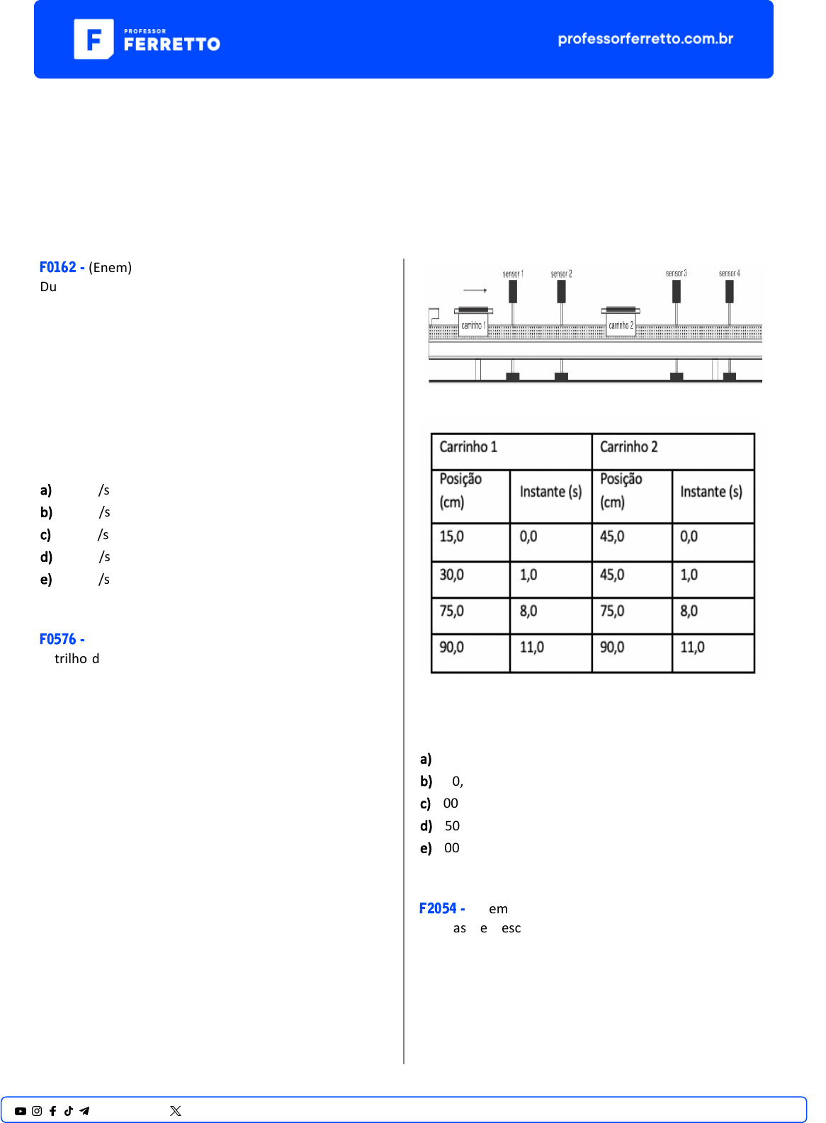 <p>ENEM</p><p>Dinâmica</p><p>Quantidade de Movimento e Impulso</p><p>F0162 - (Enem)</p><p>Durante um reparo na estação espacial internacional, um</p><p>cosmonauta, de massa 90 kg, subs�tui uma bomba do</p><p>sistema de refrigeração, de massa 360 kg, que estava</p><p>danificada. Inicialmente, o cosmonauta e a bomba estão</p><p>em repouso em relação à estação. Quando ele empurra a</p><p>bomba para o espaço, ele é empurrado no sen�do</p><p>oposto. Nesse processo, a bomba adquire uma</p><p>velocidade de 0,2 m/s em relação à estação.</p><p>Qual é o valor da velocidade escalar adquirida pelo</p><p>cosmonauta, em relação à estação, após o empurrão?</p><p>a) 0,05 m/s</p><p>b) 0,20 m/s</p><p>c) 0,40 m/s</p><p>d) 0,50 m/s</p><p>e) 0,80 m/s</p><p>F0576 - (Enem)</p><p>O trilho de ar é um disposi�vo u�lizado em laboratórios</p><p>de �sica para analisar movimentos em que corpos de</p><p>prova (carrinhos) podem se mover com atrito</p><p>desprezível. A figura ilustra um trilho horizontal com dois</p><p>carrinhos (1 e 2) em que se realiza um experimento para</p><p>obter a massa do carrinho 2. No instante em que o</p><p>carrinho 1, de massa 150,0 g, passa a se mover com</p><p>velocidade escalar constante, o carrinho 2 está em</p><p>repouso. No momento em que o carrinho 1 se choca com</p><p>o carrinho 2, ambos passam a se movimentar juntos com</p><p>velocidade escalar constante. Os sensores eletrônicos</p><p>distribuídos ao longo do trilho determinam as posições e</p><p>registram os instantes associados à passagem de cada</p><p>carrinho, gerando os dados do quadro.</p><p>Com base nos dados experimentais, o valor da massa do</p><p>carrinho 2 é igual a:</p><p>a) 50,0 g.</p><p>b) 250,0 g.</p><p>c) 300,0 g.</p><p>d) 450,0 g.</p><p>e) 600,0 g.</p><p>F2054 - (Enem PPL)</p><p>Esteiras e escadas rolantes são disposi�vos que</p><p>deslocam, a velocidade constante, os objetos neles</p><p>colocados, por meio de sistemas de controle com</p><p>sensores. Quando a massa total do disposi�vo varia, seja</p><p>pelo acréscimo ou pela re�rada de objetos, a ação de</p><p>forças impulsivas mantém a velocidade constante. Como</p><p>exemplo, considere que a massa total diminua de 1200</p><p>1@professorferretto @prof_ferretto</p><p>kg para 1000 kg em um intervalo de tempo de 0,10 s, e</p><p>que, então, seja aplicada uma força impulsiva constante</p><p>de 250 N para manter constante a velocidade.</p><p>No exemplo mencionado, o valor da velocidade</p><p>constante do disposi�vo rolante é, em m/s,</p><p>a) 0,011.</p><p>b) 0,021.</p><p>c) 0,025.</p><p>d) 0,125.</p><p>e) 0,500.</p><p>F0554 - (Enem)</p><p>Em uma colisão frontal entre dois automóveis, a força</p><p>que o cinto de segurança exerce sobre o tórax e</p><p>abdômen do motorista pode causar lesões graves nos</p><p>órgãos internos. Pensando na segurança do seu produto,</p><p>um fabricante de automóveis realizou testes em cinco</p><p>modelos diferentes de cinto. Os testes simularam uma</p><p>colisão de 0,30 segundo de duração, e os bonecos que</p><p>representavam os ocupantes foram equipados com</p><p>acelerômetros. Esse equipamento registra o módulo da</p><p>desaceleração do boneco em função do tempo. Os</p><p>parâmetros como massa dos bonecos, dimensões dos</p><p>cintos e velocidade imediatamente antes e após o</p><p>impacto foram os mesmos para todos os testes. O</p><p>resultado final ob�do está no gráfico de aceleração por</p><p>tempo.</p><p>Qual modelo de cinto oferece menor risco de lesão</p><p>interna ao motorista?</p><p>a) 1</p><p>b) 2</p><p>c) 3</p><p>d) 4</p><p>e) 5</p><p>F0602 - (Enem)</p><p>O pêndulo de Newton pode ser cons�tuído por cinco</p><p>pêndulos idên�cos suspensos em um mesmo suporte.</p><p>Em um dado instante, as esferas de três pêndulos são</p><p>deslocadas para a esquerda e liberadas, deslocando-se</p><p>para a direita e colidindo elas�camente com as outras</p><p>duas esferas, que inicialmente estavam paradas.</p><p>O movimento dos pêndulos após a primeira colisão está</p><p>representado em:</p><p>2@professorferretto @prof_ferretto</p><p>a)</p><p>b)</p><p>c)</p><p>d)</p><p>e)</p><p>F2012 - (Enem PPL)</p><p>Ao soltar um martelo e uma pena na Lua em 1973, o</p><p>astronauta David Sco� confirmou que ambos a�ngiram</p><p>juntos a super�cie. O cien�sta italiano Galileu Galilei</p><p>(1564-1642), um dos maiores pensadores de todos os</p><p>tempos, previu que, se minimizarmos a resistência do ar,</p><p>os corpos chegariam juntos à super�cie.</p><p>OLIVEIRA, A. A influência do olhar Disponível em:</p><p>www.cienciahoje.org.br. Acesso em: 15 ago. 2016</p><p>(adaptado).</p><p>Na demonstração, o astronauta deixou cair em um</p><p>mesmo instante e de uma mesma altura um martelo de</p><p>1,32 kg e uma pena de 30 g. Durante a queda no vácuo,</p><p>esses objetos apresentam iguais</p><p>a) inércias.</p><p>b) impulsos.</p><p>c) trabalhos.</p><p>d) acelerações.</p><p>e) energias potenciais.</p><p>F1461 - (Enem)</p><p>Em um autódromo, os carros podem derrapar em uma</p><p>curva e bater na parede de proteção. Para diminuir o</p><p>impacto de uma ba�da, pode-se colocar na parede uma</p><p>barreira de pneus, isso faz com que a colisão seja mais</p><p>demorada e o carro retorne com velocidade reduzida.</p><p>Outra opção é colocar uma barreira de blocos de um</p><p>material que se deforma, tornando-a tão demorada</p><p>quanto a colisão com os pneus, mas que não permite a</p><p>volta do carro após a colisão.</p><p>Comparando as duas situações, como ficam a força</p><p>média exercida sobre o carro e a energia mecânica</p><p>dissipada?</p><p>a) A força é maior na colisão com a barreira de pneus, e a</p><p>energia dissipada é maior na colisão com a barreira de</p><p>blocos.</p><p>b) A força é maior na colisão com a barreira de blocos, e</p><p>energia dissipada é maior na colisão com a barreira de</p><p>pneus.</p><p>c) A força 