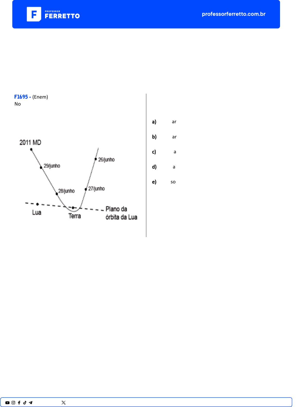 <p>ENEM</p><p>Dinâmica</p><p>Força Centrípeta</p><p>F1695 - (Enem)</p><p>No dia 27 de junho de 2011, o asteroide 2011 MD, com</p><p>cerca de 10 m de diâmetro, passou a 12 mil quilômetros</p><p>do planeta Terra, uma distância menor do que a órbita de</p><p>um satélite. A trajetória do asteroide é apresentada</p><p>A explicação �sica para a trajetória descrita é o fato de o</p><p>asteroide</p><p>a) deslocar-se em um local onde a resistência do ar é</p><p>nula.</p><p>b) deslocar-se em um ambiente onde não há interação</p><p>gravitacional.</p><p>c) sofrer a ação de uma força resultante no mesmo</p><p>sen�do de sua velocidade.</p><p>d) sofrer a ação de uma força gravitacional resultante no</p><p>sen�do contrário ao de sua velocidade.</p><p>e) estar sob a ação de uma força resultante cuja direção</p><p>é diferente da direção de sua velocidade.</p><p>1@professorferretto @prof_ferretto</p>