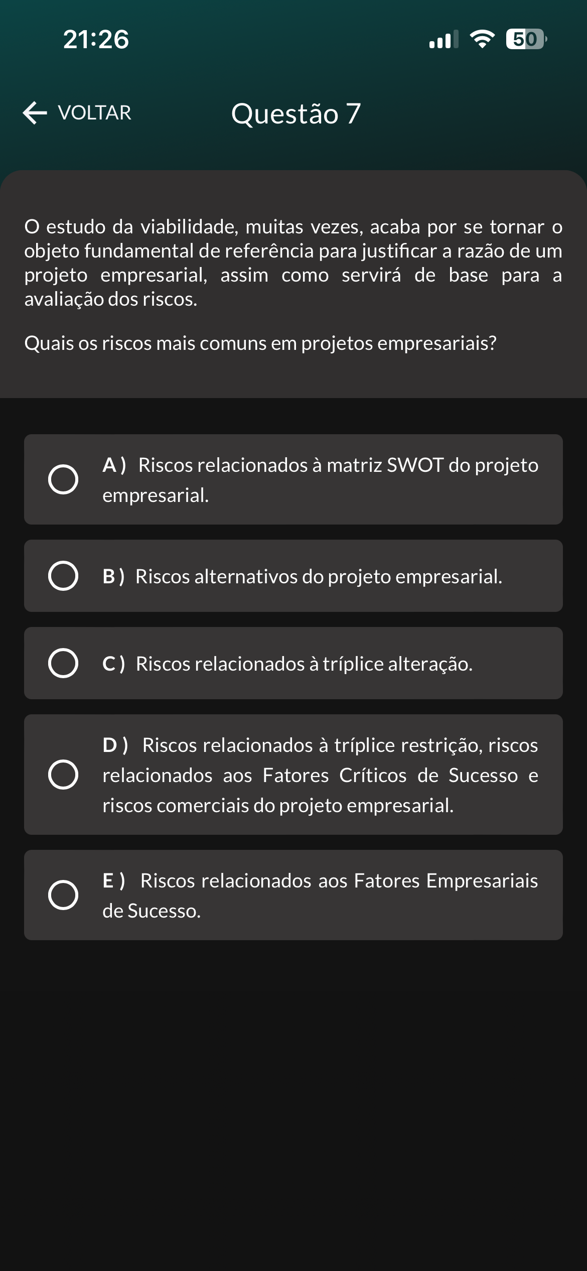 21:26 50 VOLTAR Questão 7 O estudo da viabilidade, muitas vezes, acaba por se tornar objeto fundamental de referência para justificar a razão de um projeto empresarial, assim como servirá de base para a avaliação dos riscos. Quais os riscos mais comuns em projetos empresariais? A) Riscos relacionados à matriz SWOT do projeto empresarial. B) Riscos alternativos do projeto empresarial. C) Riscos relacionados à tríplice alteração. D) Riscos relacionados à tríplice restrição, riscos relacionados aos Fatores Críticos de Sucesso e riscos comerciais do projeto empresarial. E) Riscos relacionados aos Fatores Empresariais de Sucesso.