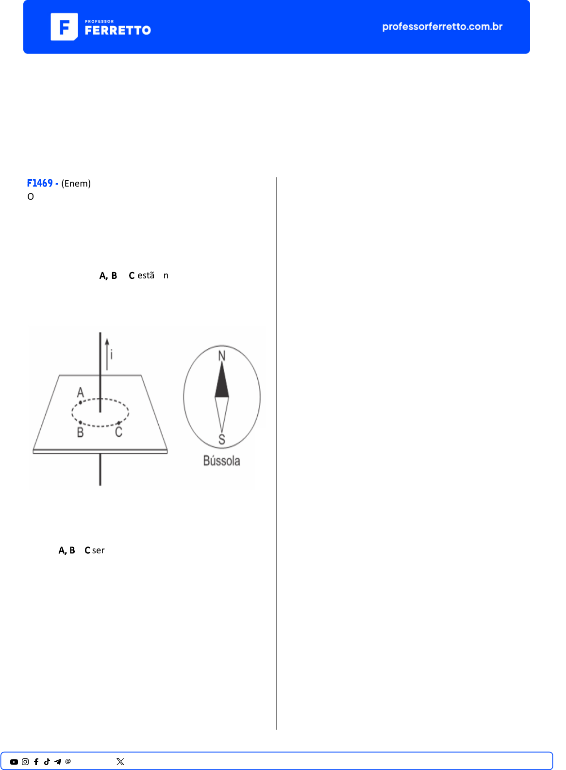 <p>ENEM</p><p>Eletromagnetismo</p><p>Fontes de Campo Magnético</p><p>F1469 - (Enem)</p><p>O �sico Hans C. Oersted observou que um fio</p><p>transportando corrente elétrica produz um campo</p><p>magné�co. A presença do campo magné�co foi verificada</p><p>ao aproximar uma bússola de um fio conduzindo</p><p>corrente elétrica. A figura ilustra um fio percorrido por</p><p>uma corrente elétrica i, constante e com sen�do para</p><p>cima. Os pontos A, B e C estão num plano transversal e</p><p>equidistantes do fio. Em cada ponto foi colocada uma</p><p>bússola.</p><p>Considerando apenas o campo magné�co por causa da</p><p>corrente i, as respec�vas configurações das bússolas nos</p><p>pontos A, B e C serão</p><p>1@professorferretto @prof_ferretto</p><p>a)</p><p>b)</p><p>c)</p><p>d)</p><p>e)</p><p>F0560 - (Enem)</p><p>Para demonstrar o processo de transformação de energia</p><p>mecânica em elétrica, um estudante constrói um</p><p>pequeno gerador u�lizando:</p><p>- um fio de cobre de diâmetro D enrolado em N espiras</p><p>circulares de área A;</p><p>- dois ímãs que criam no espaço entre eles um campo</p><p>magné�co uniforme de intensidade B e</p><p>- um sistema de engrenagens que lhe permite girar as</p><p>espiras em torno de um eixo com uma frequência f.</p><p>Ao fazer o gerador funcionar, o estudante obteve uma</p><p>tensão máxima V e uma corrente de curto-circuito i.</p><p>Para dobrar o valor da tensão máxima V do gerador</p><p>mantendo constante o valor da corrente de curto i, o</p><p>estudante deve dobrar o(a)</p><p>a) número de espiras.</p><p>b) frequência de giro.</p><p>c) intensidade do campo magné�co.</p><p>d) área das espiras.</p><p>e) à diâmetro do fio.</p><p>2@professorferretto @prof_ferretto</p>