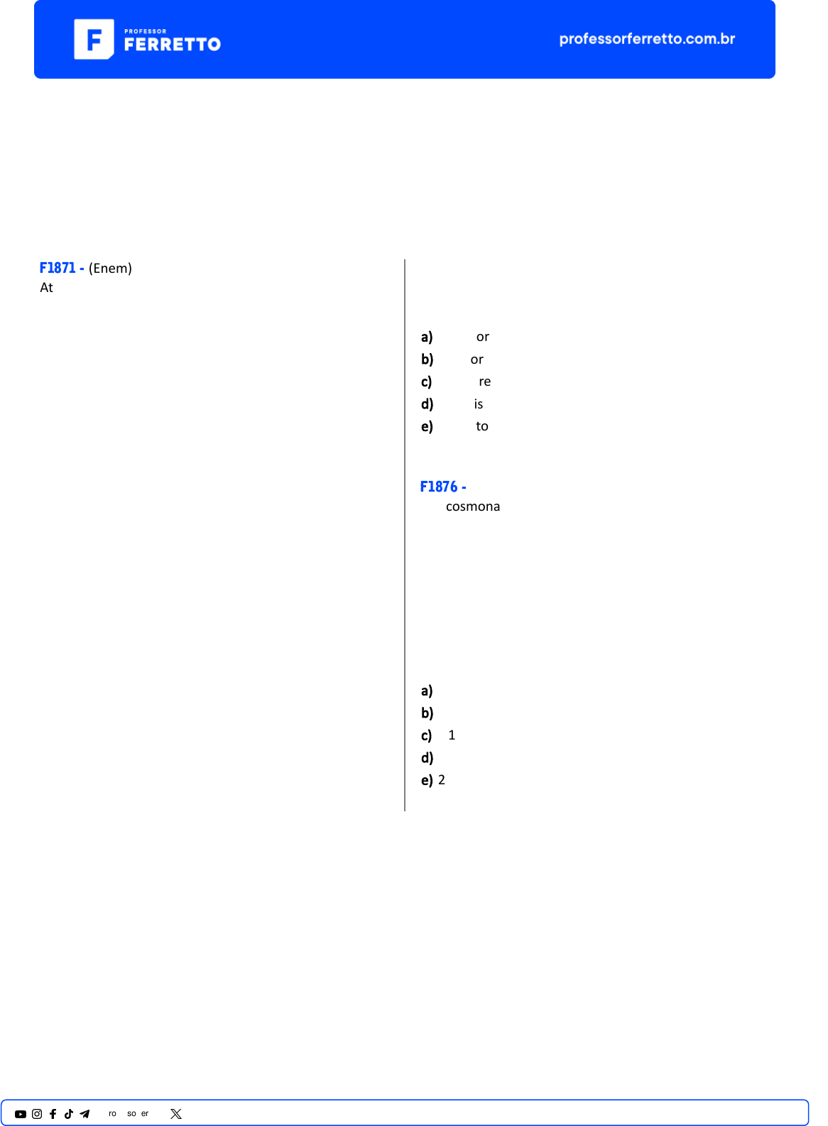 <p>ENEM</p><p>Eletrostática</p><p>Capacitores</p><p>F1871 - (Enem)</p><p>Atualmente, existem inúmeras opções de celulares com</p><p>telas sensíveis ao toque (touchscreen). Para decidir qual</p><p>escolher, é bom conhecer as diferenças entre os</p><p>principais �pos de telas sensíveis ao toque existentes no</p><p>mercado. Existem dois sistemas básicos usados para</p><p>reconhecer o toque de uma pessoa:</p><p>- O primeiro sistema consiste de um painel de vidro</p><p>normal, recoberto por duas camadas afastadas por</p><p>espaçadores. Uma camada resistente a riscos é colocada</p><p>por cima de todo o conjunto. Uma corrente elétrica passa</p><p>através das duas camadas enquanto a tela está</p><p>operacional. Quando um usuário toca a tela, as duas</p><p>camadas fazem contato exatamente naquele ponto. A</p><p>mudança no campo elétrico é percebida, e as</p><p>coordenadas do ponto de contato são calculadas pelo</p><p>computador.</p><p>- No segundo sistema, uma camada que armazena carga</p><p>elétrica é colocada no painel de vidro do monitor.</p><p>Quando um usuário toca o monitor com seu dedo, parte</p><p>da carga elétrica é transferida para o usuário, de modo</p><p>que a carga na camada que a armazena diminui. Esta</p><p>redução é medida nos circuitos localizados em cada canto</p><p>do monitor. Considerando as diferenças rela�vas de carga</p><p>em cada canto, o computador calcula exatamente onde</p><p>ocorreu o toque.</p><p>Disponível em: h�p://eletronicos.hsw.uol.com.br. Acesso</p><p>em: 18 set. 2010 (adaptado).</p><p>O elemento de armazenamento de carga análogo ao</p><p>exposto no segundo sistema e a aplicação co�diana</p><p>correspondente são, respec�vamente,</p><p>a) receptores — televisor.</p><p>b) resistores — chuveiro elétrico.</p><p>c) geradores — telefone celular.</p><p>d) fusíveis — caixa de força residencial.</p><p>e) capacitores — flash de máquina fotográfica.</p><p>F1876 - (Enem)</p><p>Um cosmonauta russo estava a bordo da estação espacial</p><p>MIR quando um de seus rádios de comunicação quebrou.</p><p>Ele constatou que dois capacitores do rádio de 3 µF e 7</p><p>µF ligados em série estavam queimados. Em função da</p><p>disponibilidade, foi preciso subs�tuir os capacitores</p><p>defeituosos por um único capacitor que cumpria a</p><p>mesma função.</p><p>Qual foi a capacitância, medida em µF, do capacitor</p><p>u�lizado pelo cosmonauta?</p><p>a) 0,10</p><p>b) 0,50</p><p>c) 2,1</p><p>d) 10</p><p>e) 21</p><p>1@professorferretto @prof_ferretto</p>