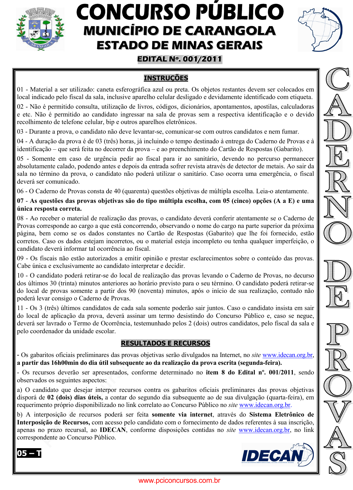 <p>pcimarkpci MDAwMDowMDAwOjAwMDA6MDAwMDowMDAwOmZmZmY6YjEzMzo0OWZj:TW9uLCAyMSBPY3QgMjAyNCAxNjoxMzoxMSAtMDMwMA==</p><p>www.pciconcursos.com.br</p><p>MMMUUUNNNIIICCCÍÍÍPPPIIIOOO DDDEEE CCCAAARRRAAANNNGGGOOOLLLAAA</p><p>EEESSSTTTAAADDDOOO DDDEEE MMMIIINNNAAASSS GGGEEERRRAAAIIISSS</p><p>EEEDDDIIITTTAAALLL NNNººº... 000000111///222000111111</p><p>INSTRUÇÕES</p><p>01 - Material a ser utilizado: caneta esferográfica azul ou preta. Os objetos restantes devem ser colocados em</p><p>local indicado pelo fiscal da sala, inclusive aparelho celular desligado e devidamente identificado com etiqueta.</p><p>02 - Não é permitido consulta, utilização de livros, códigos, dicionários, apontamentos, apostilas, calculadoras</p><p>e etc. Não é permitido ao candidato ingressar na sala de provas sem a respectiva identificação e o devido</p><p>recolhimento de telefone celular, bip e outros aparelhos eletrônicos.</p><p>03 - Durante a prova, o candidato não deve levantar-se, comunicar-se com outros candidatos e nem fumar.</p><p>04 - A duração da prova é de 03 (três) horas, já incluindo o tempo destinado à entrega do Caderno de Provas e à</p><p>identificação – que será feita no decorrer da prova – e ao preenchimento do Cartão de Respostas (Gabarito).</p><p>05 - Somente em caso de urgência pedir ao fiscal para ir ao sanitário, devendo no percurso permanecer</p><p>absolutamente calado, podendo antes e depois da entrada sofrer revista através de detector de metais. Ao sair da</p><p>sala no término da prova, o candidato não poderá utilizar o sanitário. Caso ocorra uma emergência, o fiscal</p><p>deverá ser comunicado.</p><p>06 - O Caderno de Provas consta de 40 (quarenta) questões objetivas de múltipla escolha. Leia-o atentamente.</p><p>07 - As questões das provas objetivas são do tipo múltipla escolha, com 05 (cinco) opções (A a E) e uma</p><p>única resposta correta.</p><p>08 - Ao receber o material de realização das provas, o candidato deverá conferir atentamente se o Caderno de</p><p>Provas corresponde ao cargo a que está concorrendo, observando o nome do cargo na parte superior da próxima</p><p>página, bem como se os dados constantes no Cartão de Respostas (Gabarito) que lhe foi fornecido, estão</p><p>corretos. Caso os dados estejam incorretos, ou o material esteja incompleto ou tenha qualquer imperfeição, o</p><p>candidato deverá informar tal ocorrência ao fiscal.</p><p>09 - Os fiscais não estão autorizados a emitir opinião e prestar esclarecimentos sobre o conteúdo das provas.</p><p>Cabe única e exclusivamente ao candidato interpretar e decidir.</p><p>10 - O candidato poderá retirar-se do local de realização das provas levando o Caderno de Provas, no decurso</p><p>dos últimos 30 (trinta) minutos anteriores ao horário previsto para o seu término. O candidato poderá retirar-se</p><p>do local de provas somente a partir dos 90 (noventa) minutos, após o início de sua realização, contudo não</p><p>poderá levar consigo o Caderno de Provas.</p><p>11 - Os 3 (três) últimos candidatos de cada sala somente poderão sair juntos. Caso o candidato insista em sair</p><p>do local de aplicação da prova, deverá assinar um termo desistindo do Concurso Público e, caso se negue,</p><p>deverá ser lavrado o Termo de Ocorrência, testemunhado pelos 2 (dois) outros candidatos, pelo fiscal da sala e</p><p>pelo coordenador da unidade escolar.</p><p>RESULTADOS E RECURSOS</p><p>- Os gabaritos oficiais preliminares das provas objetivas serão divulgados na Internet, no site www.idecan.org.br,</p><p>a partir das 16h00min do dia útil subsequente ao da realização da prova escrita (segunda-feira).</p><p>- Os recursos deverão ser apresentados, conforme determinado no item 8 do Edital nº. 001/2011, sendo</p><p>observados os seguintes aspectos:</p><p>a) O candidato que desejar interpor recursos contra os gabaritos oficiais preliminares das provas objetivas</p><p>disporá de 02 (dois) dias úteis, a contar do segundo dia subsequente ao de sua divulgação (quarta-feira), em</p><p>requerimento próprio disponibilizado no link correlato ao Concurso Público no site www.idecan.org.br.</p><p>b) A interposição de recursos poderá ser feita somente via internet, através do Sistema Eletrônico de</p><p>Interposição de Recursos, com acesso pelo candidato com o fornecimento de dados referentes à sua inscrição,</p><p>apenas no prazo recursal, ao IDECAN, conforme disposições contidas no site www.idecan.org.br, no link</p><p>correspondente ao Concurso Público.</p><p>05 – T</p><p>www.pciconcursos.com.br</p><p>pcimarkpci MDAwMDowMDAwOjAwMDA6MDAwMDowMDAwOmZmZmY6YjEzMzo0OWZj:TW9uLCAyMSBPY3QgMjAyNCAxNjoxMzoxMSAtMDMwMA==</p><p>www.pciconcursos.com.br</p><p>CCCOOONNNCCCUUURRRSSSOOO PPPÚÚÚBBBLLLIIICCCOOO ––– MMMUUUNNNIIICCCÍÍÍPPPIIIOOO DDDEEE CCCAAARRRAAANNNGGGOOOLLLAAA///MMMGGG</p><p>AGENTE ADMINISTRATIVO – CREAS</p><p>www.idecan.org.br / atendimento@idecan.org.br - 2 -</p><p>CCAARRGGOO:: AAGGEENNTTEE AADDMMIINNIISSTTRRAATTIIVVOO –– CCRREEAASS</p><p>TEXTO: Só no dicionário</p><p>Tem sentido, hoje, dizer de alguém que tem excelente caráter? Que é sincera? Que nela dá para confiar?</p><p>Quais as qualidades mais valorizadas nos dias de hoje?</p><p>Bem, como tudo mudou, vou falar de algumas, as que dão mais ibope, e não pela ordem.</p><p>É preciso ser ligado, antenado e, sobretudo bem informado; é aquele que presta atenção a tudo, a quem nada escapa.</p><p>Com esses predicados, é possível abrir as portas para uma carreira brilhante e um futuro promissor, e se tiver também</p><p>alguma inteligência, o sucesso é garantido. Afinal, é por meio das boas informações que são feitos os grandes negócios e</p><p>as tramas políticas acontecem.</p><p>Mas é preciso também ser esperto para usar essas informações na hora certa, com a pessoa certa.</p><p>Esperteza, essa sim, uma enorme qualidade. Quem tiver esse dom pode se tornar milionári