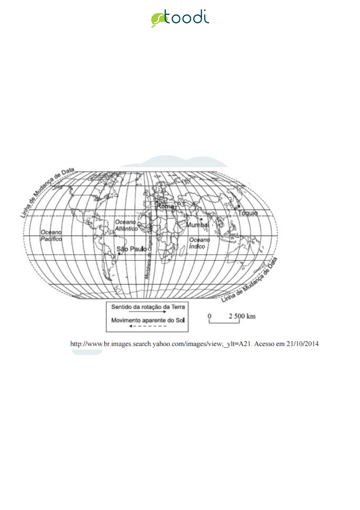 <p>Página 1</p><p>Copyright (c) 2013 - 2018 Stoodi Ensino e Treinamento a Distância LTDA - EPP - Todos os direitos reservados</p><p>1. UEMG 2015</p><p>ÁGUAS MANSAS</p><p>“No tempo sem tempo da infância, o trabalho dos relógios demarcando a vida é coisa dos adultos, é a hora imposta de fora. Nós,</p><p>entre os intervalos de correrias e agitação, contemplamos. Tudo é possível nessa fase: o tempo em curso, de que nos falam as vozes</p><p>que parecem vir de tão longe, pode ser apenas uma invenção malévola dos bem intencionados adultos para nos controlar.</p><p>Só aos poucos o dentro e fora de nós assumirá desenhos e figuras, o fluir das águas se impõe – e terá início a nossa história(...).”</p><p>LUFT, 2014, p. 23</p><p>Mesmo sem o saber, a criança do texto fala da invenção do controle tempo. Criamos, é claro, as horas como uma forma de contar o</p><p>tempo para podermos gerenciar nossas atividades diárias. Em 1883, numa conferência internacional, em Roma, foi elaborado um</p><p>sistema de fusos horários, conforme a representação no mapa abaixo:</p><p>Antes de esse sistema ser criado, o horário era definido pelo relógio de sol, onde o meio-dia era observado, quando os raios solares</p><p>estavam a pino.</p><p>Com relação aos fusos horários, é CORRETO afirmar que</p><p>a. mesmo tendo um total de 24 horas dentro do sistema de fusos, cada país, independentemente de seu tamanho, possui um único</p><p>horário.</p><p>b. usando-se o número de graus existentes nos meridianos, sabemos que a Terra gira 24 graus a cada 1 hora.</p><p>c. o uso do fuso horário é extremamente rígido em cada território, não sendo permitido adaptá-lo às necessidades de sua população.</p><p>d. o sistema foi criado a partir da necessidade de se organizar as atividades humanas relacionadas com as diferenças de horas</p><p>geradas pelo movimento de rotação da Terra.</p><p>2. G1 - UFTPR 2012</p><p>Na Copa do Mundo de Futebol de 2010, na África do Sul, o Brasil estreou contra a Coreia do Norte, em jogo realizado às 15h30min</p><p>na cidade de Joanesburgo (horário local), sendo o jogo transmitido em tempo real para todo o mundo. Considerando que esta cidade</p><p>Página 2</p><p>Copyright (c) 2013 - 2018 Stoodi Ensino e Treinamento a Distância LTDA - EPP - Todos os direitos reservados</p><p>encontra-se no fuso horário da longitude 30° Leste, o horário em que este jogo foi transmitido para a cidade de Curitiba (Brasil, –3</p><p>GMT) e Sydney (Austrália, +10 GMT) foram, respectivamente:</p><p>a. 2h30min e 12h30min.</p><p>b. 18h30min e 1h30min.</p><p>c. 10h30min e 23h30min.</p><p>d. 3h30min e 10h30min.</p><p>e. 5h30min e 19h30min.</p><p>3. UEL 2012</p><p>TEXTO PARA A PRÓXIMA QUESTÃO:</p><p>Planisférios e globos terrestres são representações da Terra que permitem conhecê-la em sua totalidade, indicando o domínio da</p><p>espécie humana sobre o mundo. Com base no globo terrestre, no planisfério e nos conhecimentos cartográficos, considere as</p><p>afirmativas a seguir.</p><p>I. Pela rede de coordenadas geográficas, com a identificação de pontos onde se cruzam paralelos e meridianos, é possível localizar</p><p>qualquer ponto na superfície terrestre.</p><p>II. A medida angular de longitude varia de 0º, em Greenwich, a 180º, em posição oposta, o antimeridiano, onde se localiza a Linha</p><p>Internacional de Mudança de Data (LIMD).</p><p>III. O Equador é o paralelo principal, traçado a igual distância dos polos, que divide a Terra horizontalmente em dois hemisférios: o</p><p>Setentrional ou Boreal e o Meridional ou Austral.</p><p>IV. A representação da Terra, tanto pelo globo quanto pelo planisfério, permite visualizar toda a superfície terrestre de uma só vez,</p><p>Página 3</p><p>Copyright (c) 2013 - 2018 Stoodi Ensino e Treinamento a Distância LTDA - EPP - Todos os direitos reservados</p><p>com a distribuição uniforme de superfícies continentais e oceânicas.</p><p>Assinale a alternativa correta.</p><p>a. Somente as afirmativas I e IV são corretas.</p><p>b. Somente as afirmativas II e III são corretas.</p><p>c. Somente as afirmativas III e IV são corretas.</p><p>d. Somente as afirmativas I, II e III são corretas.</p><p>e. Somente as afirmativas I, II e IV são corretas.</p><p>4. UECE 2015</p><p>Analise as afirmações que tratam sobre os mapas temáticos considerando sua confecção e suas características principais. Assinale</p><p>com V as afirmações verdadeiras e com F as afirmações falsas.</p><p>( ) Dentre os objetivos dos mapas temáticos está a representação de um fenômeno ou uma característica particular de um lugar</p><p>qualquer do planeta.</p><p>( ) Título, escala, sistema de projeção, sistema de coordenadas e convenções são alguns dos elementos presentes nos mapas</p><p>temáticos.</p><p>( ) Os mapas temáticos devem apresentar elementos visuais de fácil e imediata compreensão.</p><p>( ) Um mapa temático pode ser produzido a partir de outras bases cartográficas ou outros tipos de mapa, como um mapa base, por</p><p>exemplo.</p><p>A sequência correta, de cima para baixo, é:</p><p>a. V - F - F - F.</p><p>b. V - V - V - V.</p><p>c. F - V - V - F.</p><p>d. V - F - V - F.</p><p>5. ENEM 2016</p><p>Página 4</p><p>Copyright (c) 2013 - 2018 Stoodi Ensino e Treinamento a Distância LTDA - EPP - Todos os direitos reservados</p><p>A ONU faz referência a uma projeção cartográfica em seu logotipo. A figura que ilustra o modelo dessa projeção é:</p><p>a.</p><p>b.</p><p>c.</p><p>d.</p><p>Página 5</p><p>Copyright (c) 2013 - 2018 Stoodi Ensino e Treinamento a Distância LTDA - EPP - Todos os direitos reservados</p><p>e.</p><p>6. G1 - IFSC 2014</p><p>Um técnico em agroecologia pretende orientar a implementação de pomares em pequenas propriedades rurais. Para isso ele produz</p><p>uma cartilha, com informações sobre quais espécies plantar e como deverá ser a disposição do pomar. Junto à cartilha, o