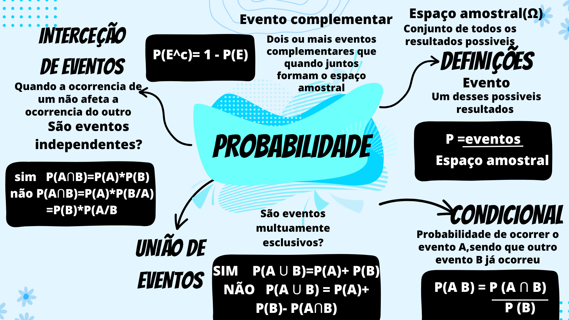 Evento complementar Espaço INTERCEÇÃO Conjunto de todos os Dois ou mais eventos resultados possiveis P(E^c)= 1 - P(E) complementares que DE EVENTOS quando juntos formam o espaço Quando a ocorrencia de Evento amostral um não afeta a Um desses possiveis ocorrencia do outro resultados São eventos independentes? PROBABILIDADE P =eventos Espaço amostral sim P(ANB)=P(A)*P(B) não =P(B)*P(A/B São eventos CONDICIONAL multuamente Probabilidade de ocorrer o DE esclusivos? evento A, sendo que outro evento B já ocorreu EVENTOS SIM P(A U P(B) NÃO P(A U P(A B) = P (ANB) P(B)- P(ANB) P (B)