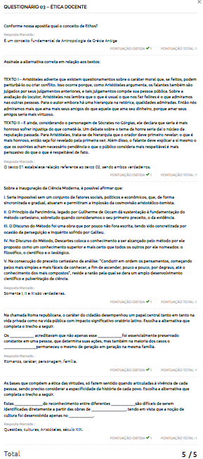 QUESTIONÁRIO 03 ETICA DOCENTE Conforme conceito de Ethos? - fundamental de de TOTAL . alternative em relação textos TEXTO adverte que existem sobre moral que podem ou criar ocorre também por . Sobre . do que que . que que Para autor qualidades Então mais que mais do que que - porque amigos mais TEXTO considerando de declare que mais softer do Um debate sobre de del núcleo Para de que orador primeiro que então revelado . que necessário que público mais . mais do que o que . de reference PONTUAÇÃO TOTAL Sobre . de . L um de . de . . . de legado por de . fundamentação do método . Discurso do Método que por pouce tendo side de . No Discurso do Descartes . . pelo método por proposto um superior . todos por cientifico Na consecução do preceito de ordern 04 simples . mais de . de pouce . conhecimento dos reside . qual um ample . de TOTAL Na chamada . do um papel central em tanto vida privada come pública com impacto significativo . que complete que constante que determine - mas dos de DA Marcada TOTAL As bases que . des quando articuladas de preciso . de de povo . que complete trecho . Estas do reconhecimento entre de . partir de tendo em que . de PONTUAÇÃO TOTAL Total 5/5