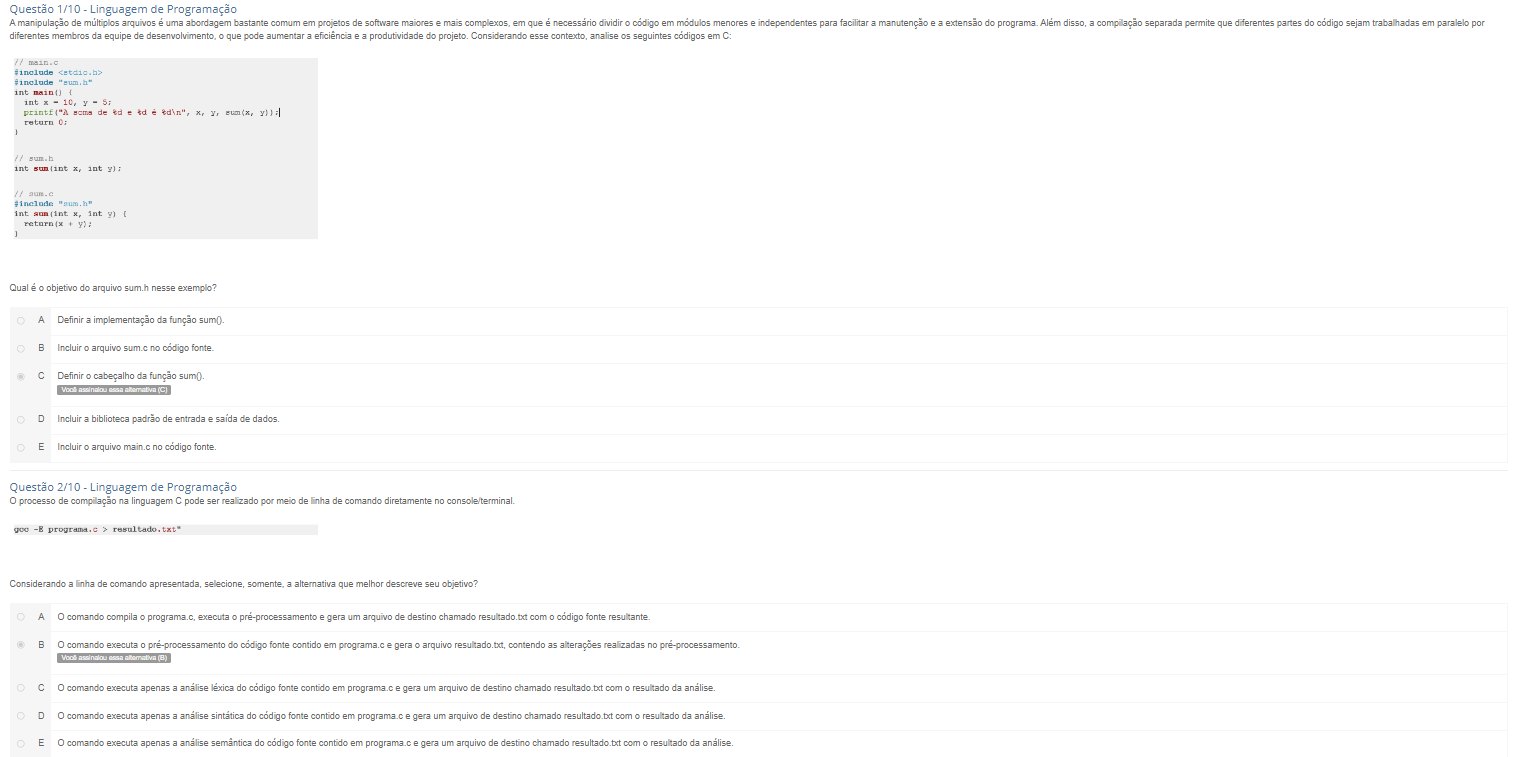 Questão 1/10 Linguagem de Programação A manipulação de multiplos arquivos é uma abordagem bastante comum em projetos de software maiores e mais em que é necessário dividir código em módulos menores independentes para facilitar manutenção e a extensão do programa Além disso, a compilação separada permite que diferentes partes do código diferentes membros da equipe de desenvolvimento, que pode aumentar a eficiência e a produtividade do Considerando analise seguintes códigos em #include int int 10. 5: printi de return int int #include int sun (int int v) return Qual é objetivo do arquivo exemplo? A Definir a implementação da função B arquivo sum.c no código C Definir cabeçalho da função Voot D a biblioteca padrão de entrada e saída de E Incluir o arquivo main no código fonte Questão 2/10 Linguagem de Programação processo de compilação na linguagem C pode ser realizado por meio de linha de comando diretamente no console/terminal goo -E > Considerando a linha de comando a alternativa que melhor descreve seu objetivo? A comando compila executa pré-processamento e gera um arquivo de destino chamado resultado.txt com o fonte B comando executa pré-processamento do fonte contido em programa. e gera arquivo contendo as alterações realizadas no comando executa apenas a léxica do fonte contido em gera um arquivo de destino chamado resultado com resultado da analise D comando executa apenas a análise sintática do código fonte contido em e gera um arquivo de destino chamado resultado com resultado da o comando executa apenas a semântica do código fonte contido em e gera um arquivo de destino chamado resultado com resultado da