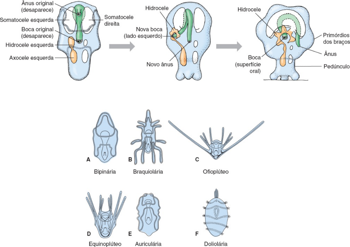 <p>desenvolve três braços adesivos e uma ventosa na sua extremidade anterior e passa a ser chamada de braquiolária (Figura</p><p>22.12B). Então, prende-se ao substrato, forma um pedúnculo temporário de fixação e sofre metamorfose.</p><p>A metamorfose envolve uma dramática reorganização de uma larva bilateral em um jovem radial. O eixo anteroposterior</p><p>da larva é perdido, e o que era o lado esquerdo torna-se a superfície oral e o lado direito da larva torna-se a superfície</p><p>aboral (ver Figura 22.11). De forma correspondente, a boca e o ânus larvais desaparecem e novos se formam no que era</p><p>originalmente os lados esquerdo e direito, respectivamente. A porção do compartimento celômico anterior do lado esquerdo</p><p>expande-se para formar o canal anelar circular do sistema hidrovascular ao redor da boca, então ele desenvolve ramos para</p><p>formar os canais radiais. À medida que os primeiros braços curtos e grossos e os primeiros pódios aparecem, o animal</p><p>destaca-se de seu pedúnculo e começa a vida como uma jovem estrela-do-mar. Diversos genes regulatórios encontrados nos</p><p>animais bilaterais são conservados nos equinodermos e têm funções surpreendentemente similares. Por exemplo, o Distal-less</p><p>e seu homólogo nos vertebrados regulam o crescimento de membros nesses animais; seu homólogo nos equinodermos é ativo</p><p>no desenvolvimento dos pés tubulares.</p><p>Figura 22.11 Metamorfose de asteroide. A somatocele esquerda transforma-se no celoma oral, e a somatocele</p><p>direita, no celoma aboral. A hidrocele esquerda transforma-se no sistema hidrovascular, e a axocele esquerda, no</p><p>canal pétreo e canais periemais. Axocele e hidrocele direitas são perdidas.</p><p>Figura 22.12 Larvas de equinodermos. A. Bipinária de asteroides. B. Braquiolária de asteroides. C. Ofioplúteo de</p><p>ofiuroides. D. Equinoplúteo de equinoides. E. Auriculária de holoturoides. F. Doliolária de crinoides.</p><p>Margaridas-do-mar. Esses animais diminutos e estranhos (menos de 1 cm de diâmetro) (Figura 22.13) foram descobertos</p><p>vivendo em águas de mais de 1.000 m de profundidade ao largo da Nova Zelândia. Eles foram originalmente descritos (1986)</p><p>como uma nova classe de equinodermos denominada Concentricycloidea. Somente três espécies são conhecidas até hoje.</p><p>Muitos zoólogos concordam que elas são asteroides Spinulosida altamente derivados. A análise filogenética do DNAr coloca-</p><p>as em Asteroidea.</p><p>As margaridas-do-mar são pentarradiais em simetria, mas sem braços. Seus pés tubulares dispõem-se na periferia do</p><p>disco em vez de ao longo de áreas ambulacrais, como nos outros equinodermos. Seu sistema hidrovascular inclui dois canais</p><p>circulares concêntricos; o externo pode representar canais radiais, visto que pés tubulares originam-se deles. Um hidroporo,</p><p>homólogo ao madreporito, conecta o canal circular interno à superfície aboral. Uma espécie é desprovida de trato digestivo;</p><p>sua superfície oral é coberta por um véu membranoso, através do qual parece absorver nutrientes. A outra espécie tem um</p><p>estômago saciforme raso, mas carece de intestino ou ânus.</p><p>Classe Ophiuroidea</p><p>As estrelas-quebradiças são as maiores dos grandes grupos de equinodermos, com mais de 2.000 espécies vivas, e são</p><p>provavelmente os mais abundantes também. Elas existem em grande quantidade em todos os tipos de habitats bentônicos</p><p>marinhos, chegando mesmo a formar verdadeiros “tapetes” em profundidades marinhas abissais de muitas áreas.</p><p>Forma e função</p><p>Apesar de terem cinco braços, os ofiuroides são surpreendentemente diferentes dos asteroides. Os braços de ofiuroides são</p><p>afilados e bastante discerníveis em relação ao disco central (Figura 22.14). Eles não têm pedicelárias nem pápulas, e seus</p><p>sulcos ambulacrais são fechados e cobertos com ossículos braquiais. Os pés tubulares são desprovidos de ventosas; eles</p><p>ajudam na alimentação e têm um uso limitado na locomoção. Ao contrário dos asteroides, o madreporito dos ofiuroides</p><p>localiza-se na superfície oral, sobre um dos escudos orais (Figura 22.15). Os pés tubulares são desprovidos de ampolas, e a</p><p>força para a protrusão de um pé é gerada por uma porção muscular proximal do pé.</p><p>Cada braço articulado consiste em uma coluna de ossículos articulados (chamados de vértebras), conectados por</p><p>músculos e cobertos por placas. A locomoção é feita pelo movimento dos braços. Estes são movimentados para frente em</p><p>pares e apoiados no substrato, enquanto um (qualquer um) é estendido para frente ou rebocado atrás, e o animal é puxado ou</p><p>empurrado de modo espasmódico.</p><p>Figura 22.13 Xyloplax spp. são equinodermos discoides bizarros. Com seus pés tubulares ao longo da margem,</p><p>são os únicos equinodermos em que essas estruturas não se distribuem ao longo de áreas ambulacrais.</p><p>Figura 22.14 A. Ofiuroide Ophiothrix suensonii (classe Ophiuroidea) em uma esponja vermelha de Belize. Os</p><p>ofiuroides não usam seus pés tubulares para locomoção; ao contrário, deslocam-se rapidamente (para um</p><p>equinodermo) por meio de seus braços. B. Vista oral do ofiuroide Astrophyton muricatum. Esse equinodermo</p><p>distende seus braços multirramificados para filtrar seu alimento, geralmente à noite.</p><p>Cinco placas móveis que servem como mandíbulas dispõem-se ao redor da boca (Figura 22.15). Não existe ânus. Sua</p><p>pele é coriácea, com placas dérmicas e espinhos arranjados em padrões característicos. Os cílios da superfície são pouco</p><p>frequentes.</p><p>Os órgãos viscerais estão confinados ao disco central, visto que seus braços são demasiadamente delgados para contê-los</p><p>(Figura 22.16). O estômago é saciforme, e não há intestino. O material não digerível é dispensado a